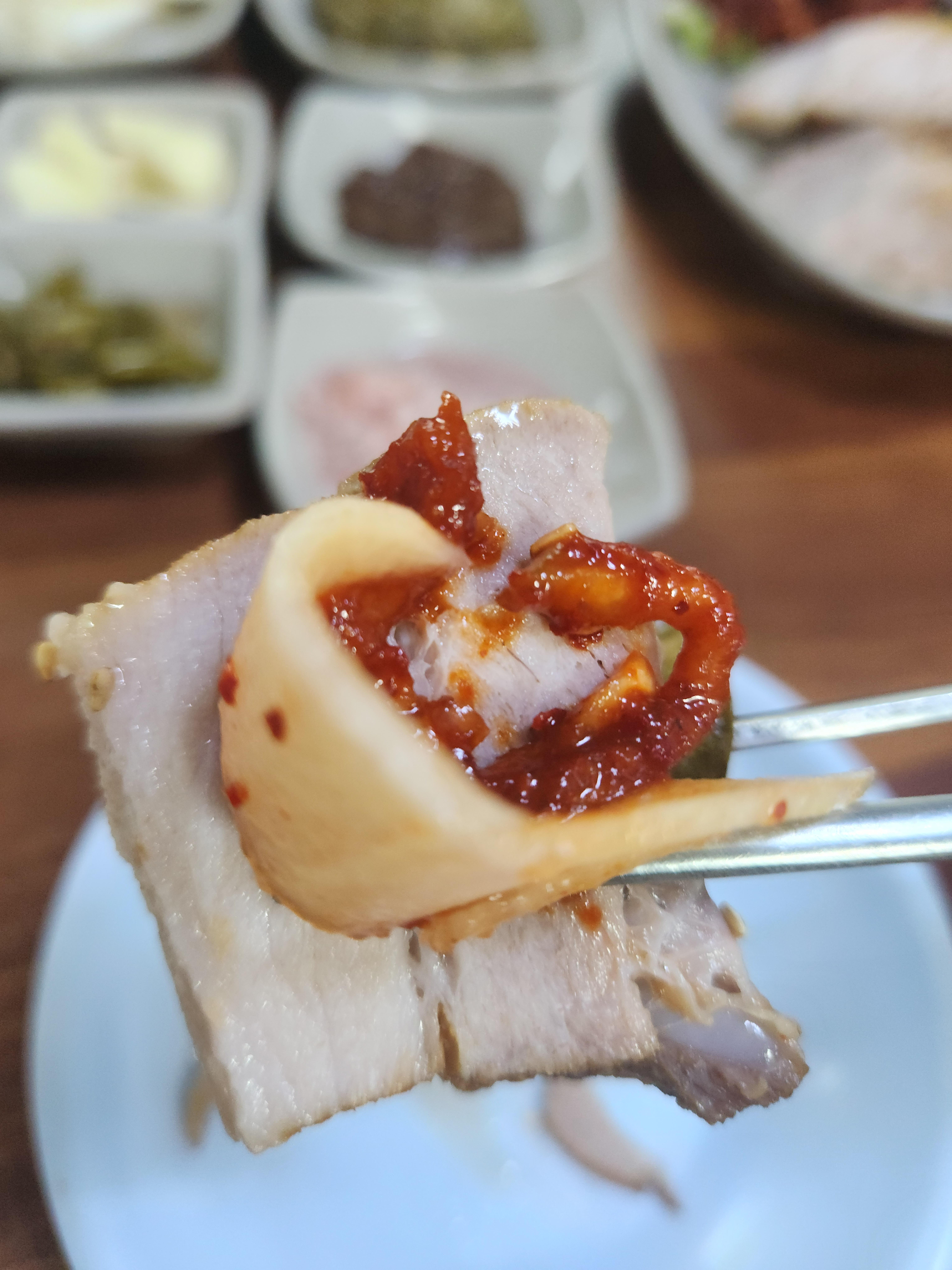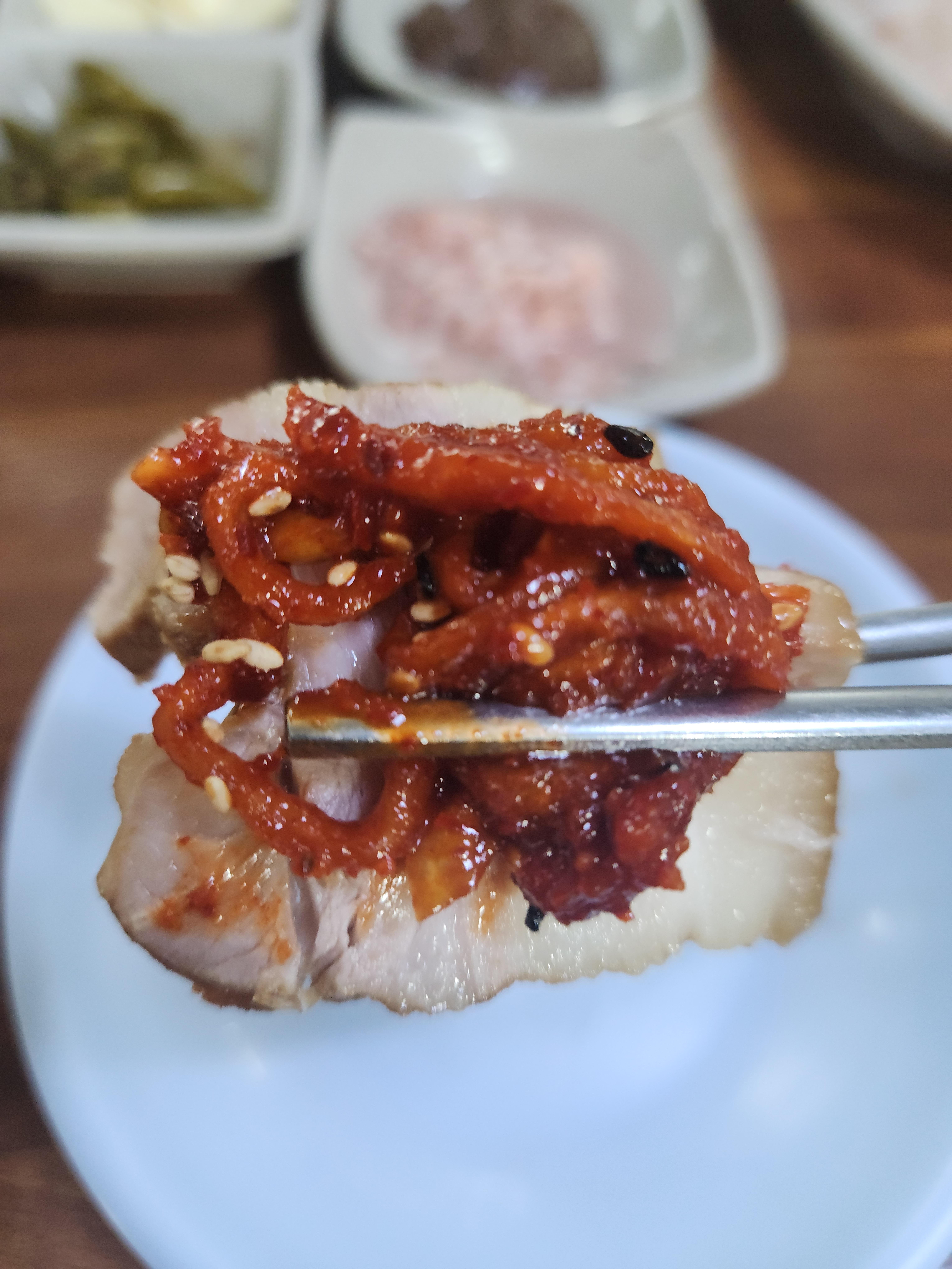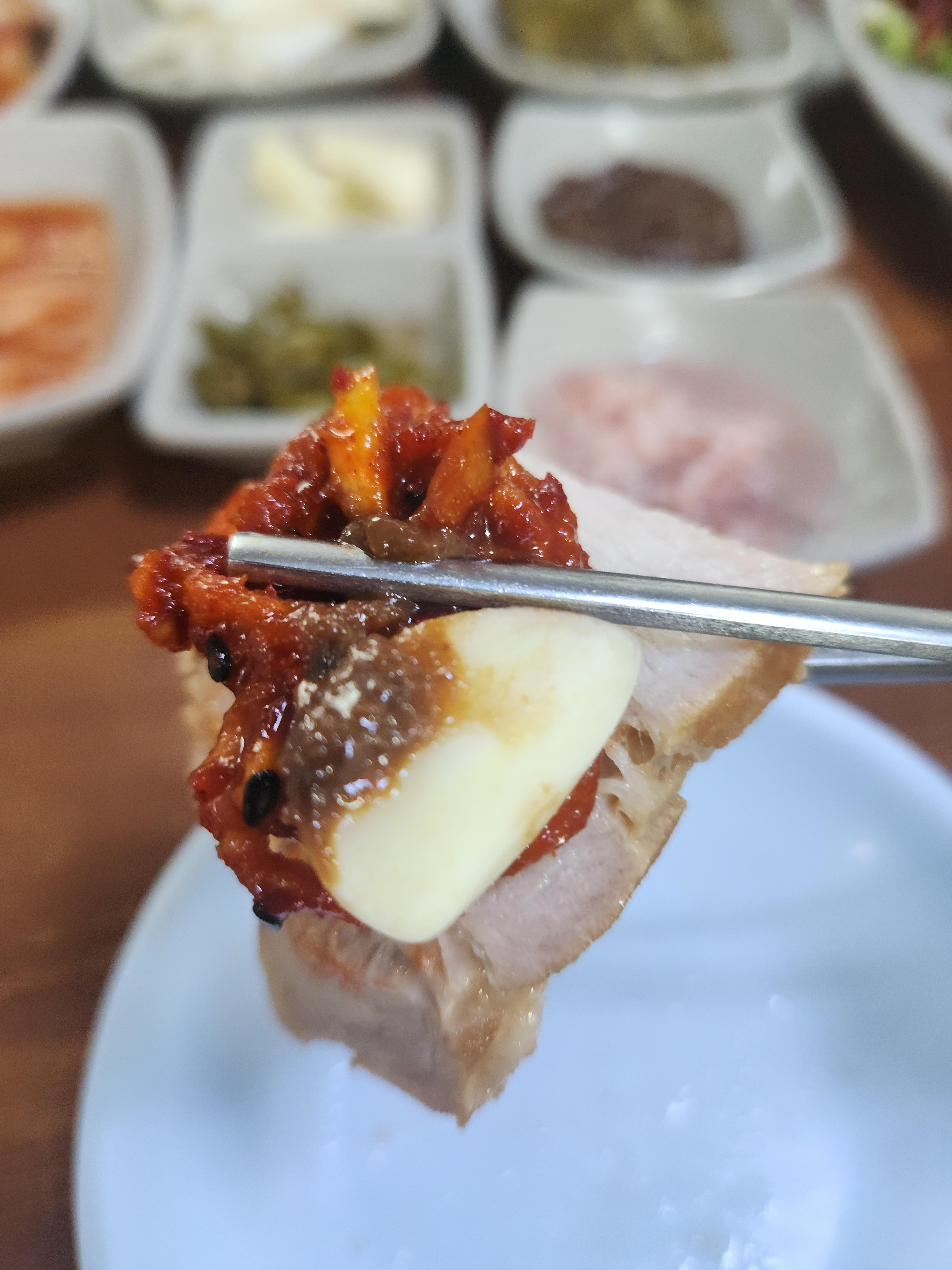 기본중에 기본 새우젓만 살짝 올려서도 먹어보았는데 맛있게 삶아진 수육이라 뭘 올려도 다 맛있네요