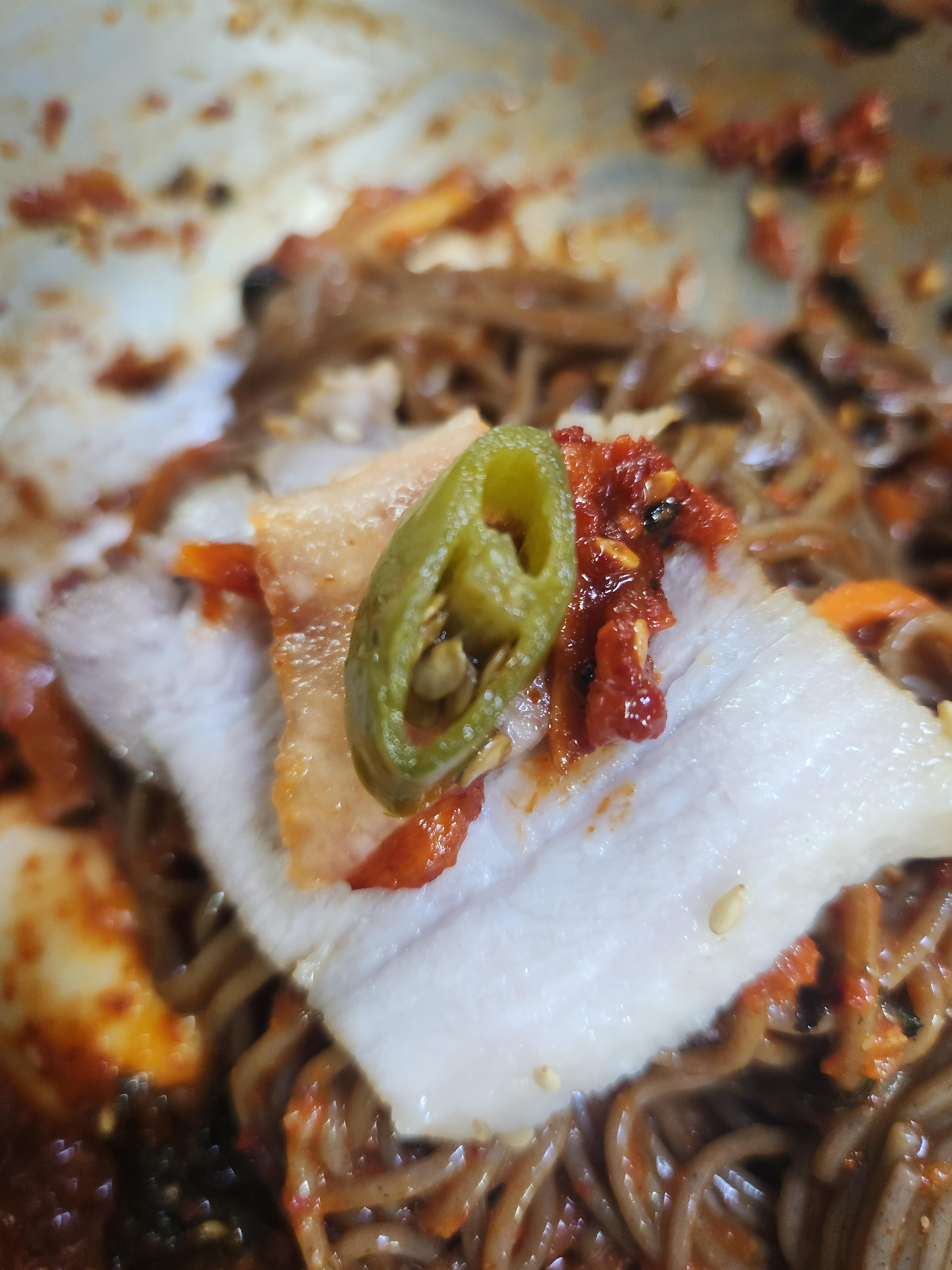 막국수 중간에 수육을 집어서 고추절임만 깔끔하게 올려서 먹어주면 또 기가 막히죠