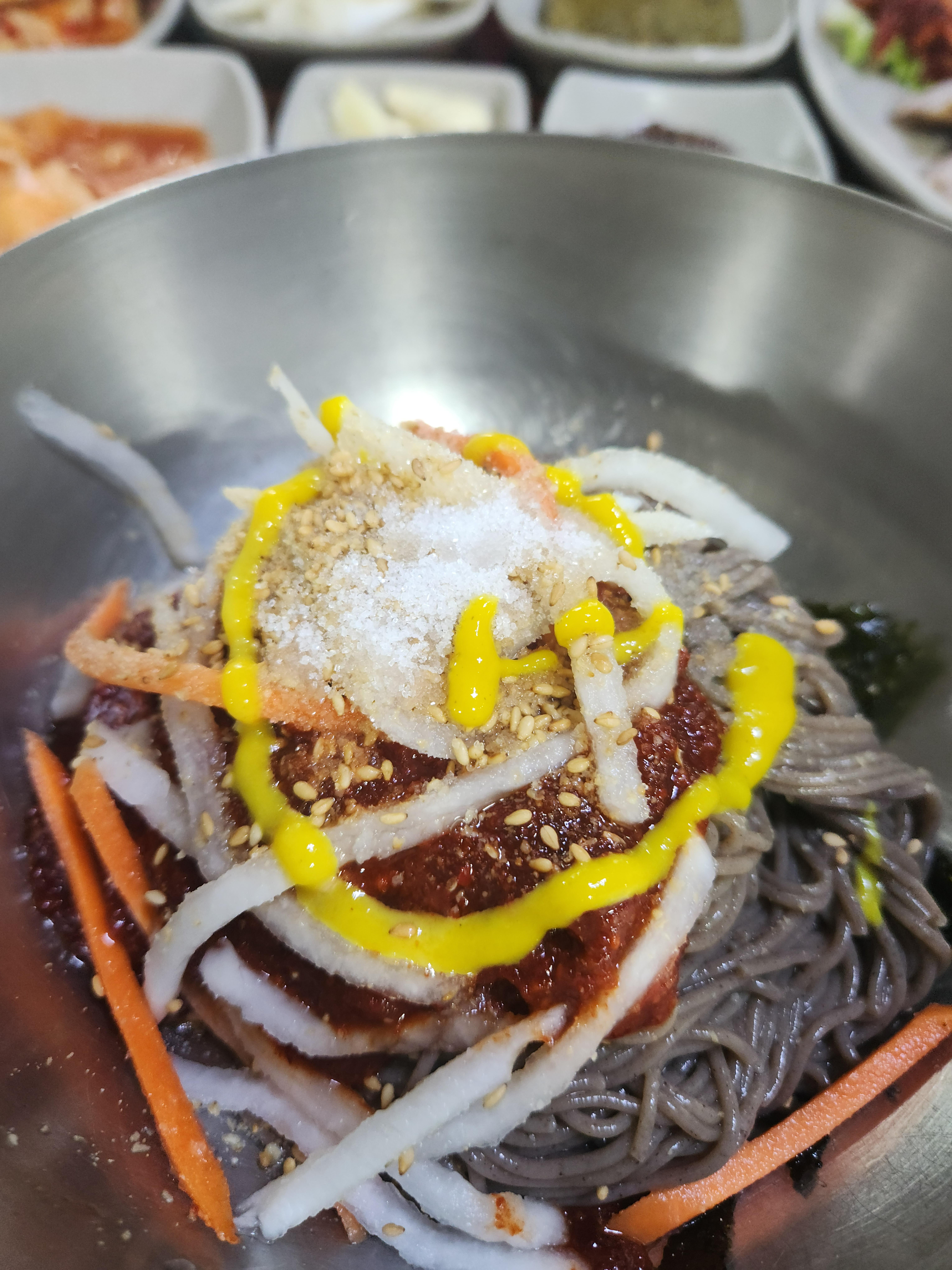 최초 나온 그대로의 막국수에 겨자 식초 설탕을 기호에 맞게 넣으신 후 쉐이킷쉐이킷 해서 드시면 되요
