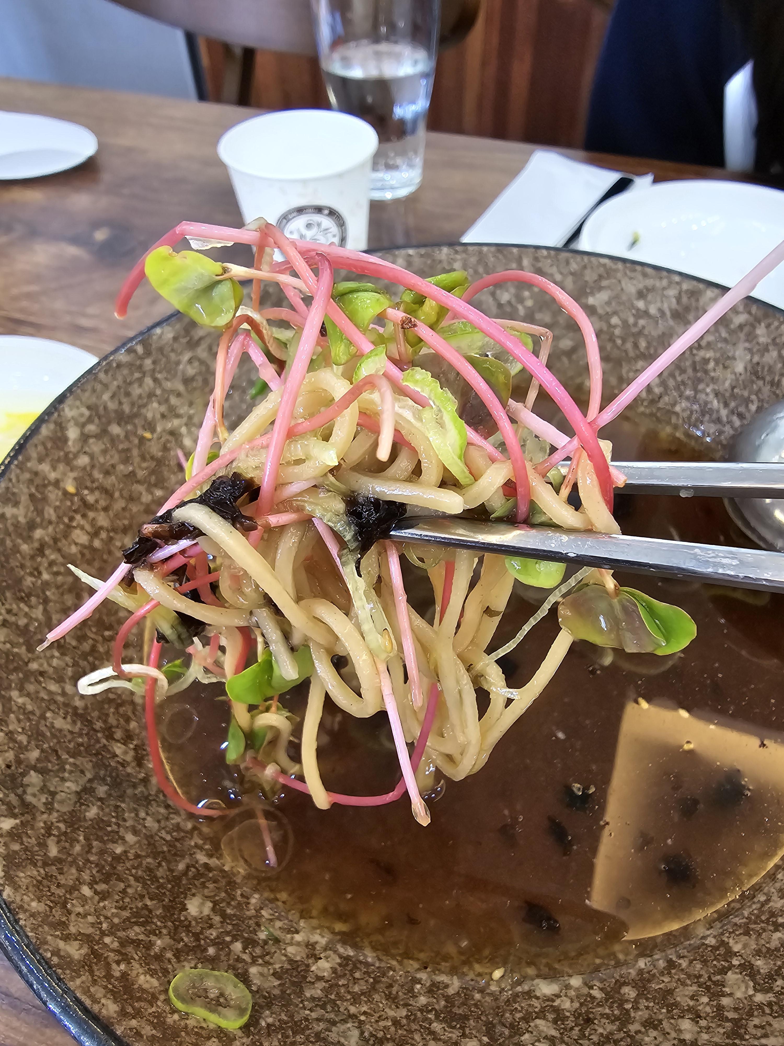 새싹 순의 바삭함과 육수의 짭조름함, 파의 향과 어울러지는 갈은 무의 알싸함이 딱 조화가 잘 맞는 느낌이었어요