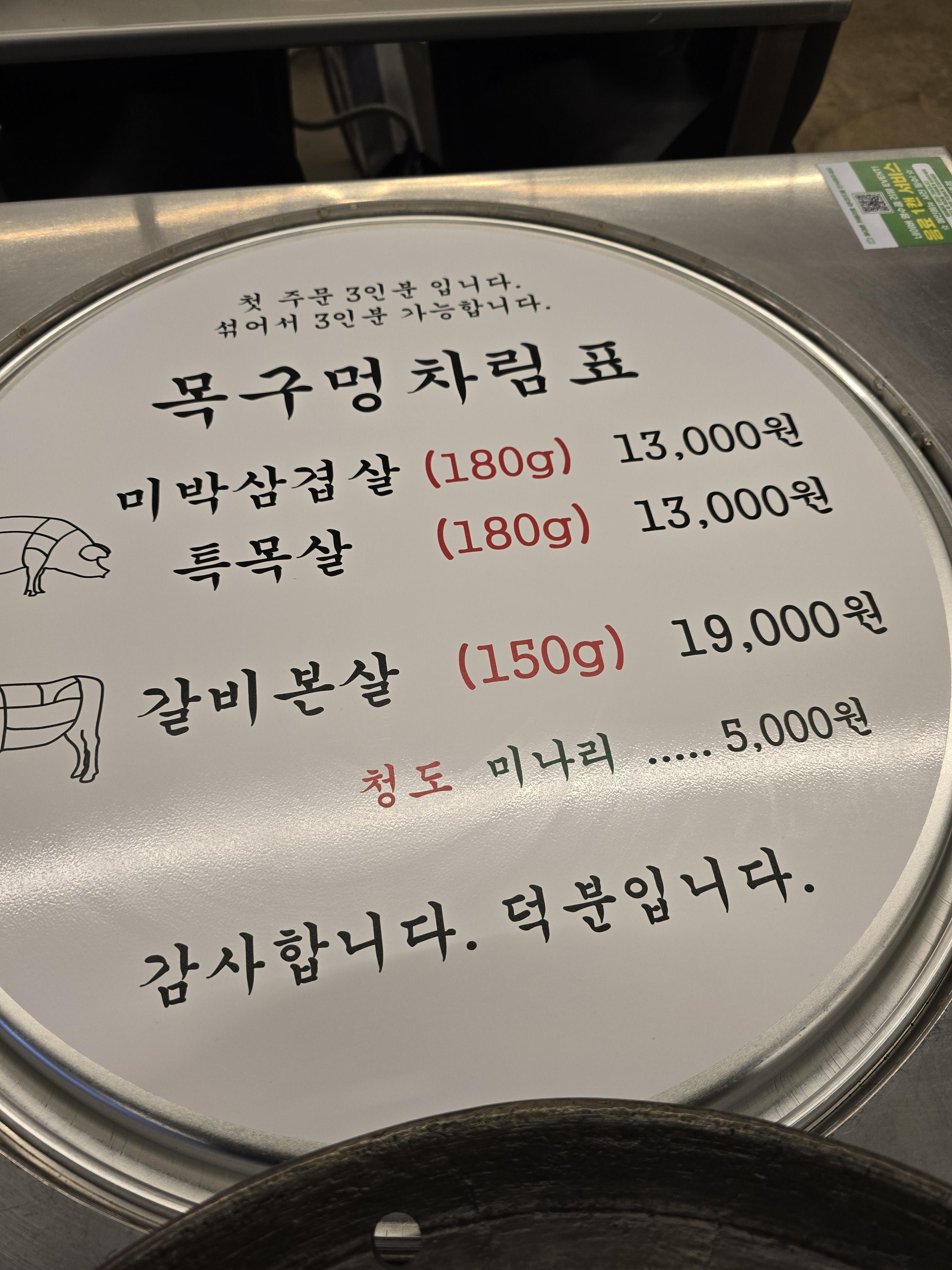 테이블에 앉으면 메뉴판이 쟁반으로 떡하니 있고요 메뉴는 단촐해요 삼겹살과 목살, 갈비본살 그리고 미나리!