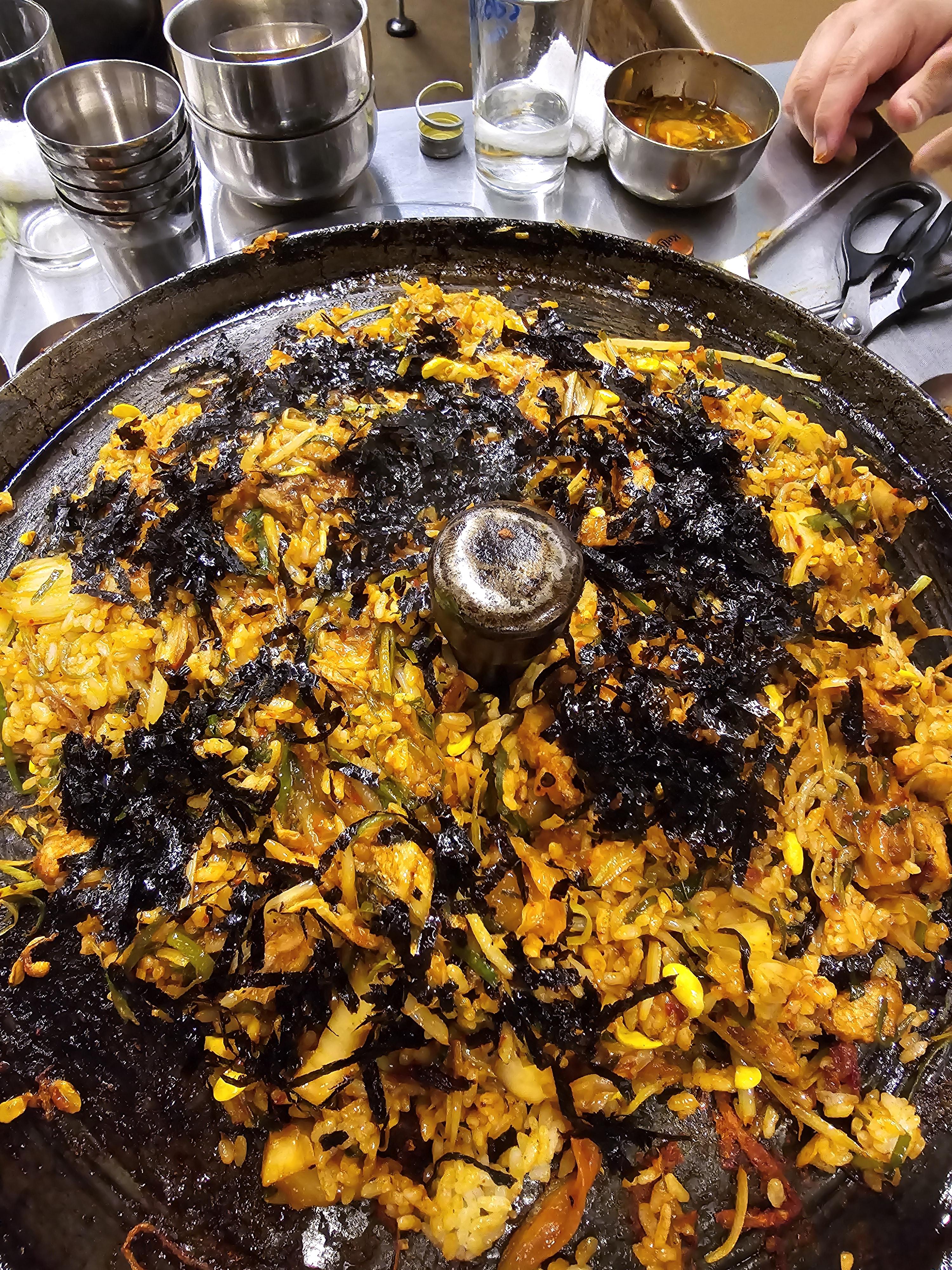 공기밥 2개를 야무지게 주문하고 그동안 콩나물과 파잘이 그리고 남은 고기를 잘게 썰어서 볶음밥 만들 준비를 하고 있다가 ^^ 공기밥과 잘 비빈 후 솥뚜껑 불판에 잘 펼쳐주고 김가루까지 솔솔 뿌리면 삼겹살김치볶음밥이 완성되요