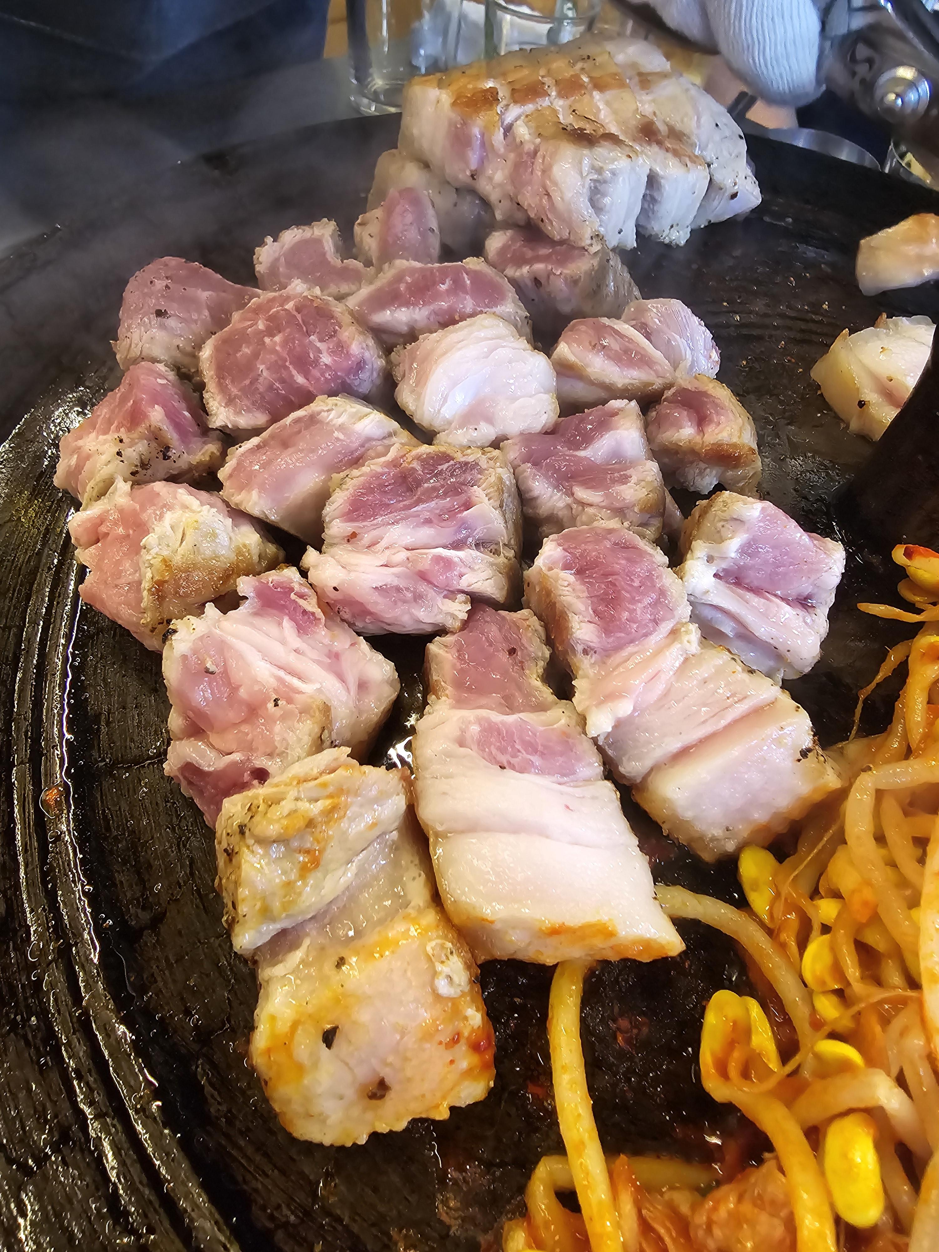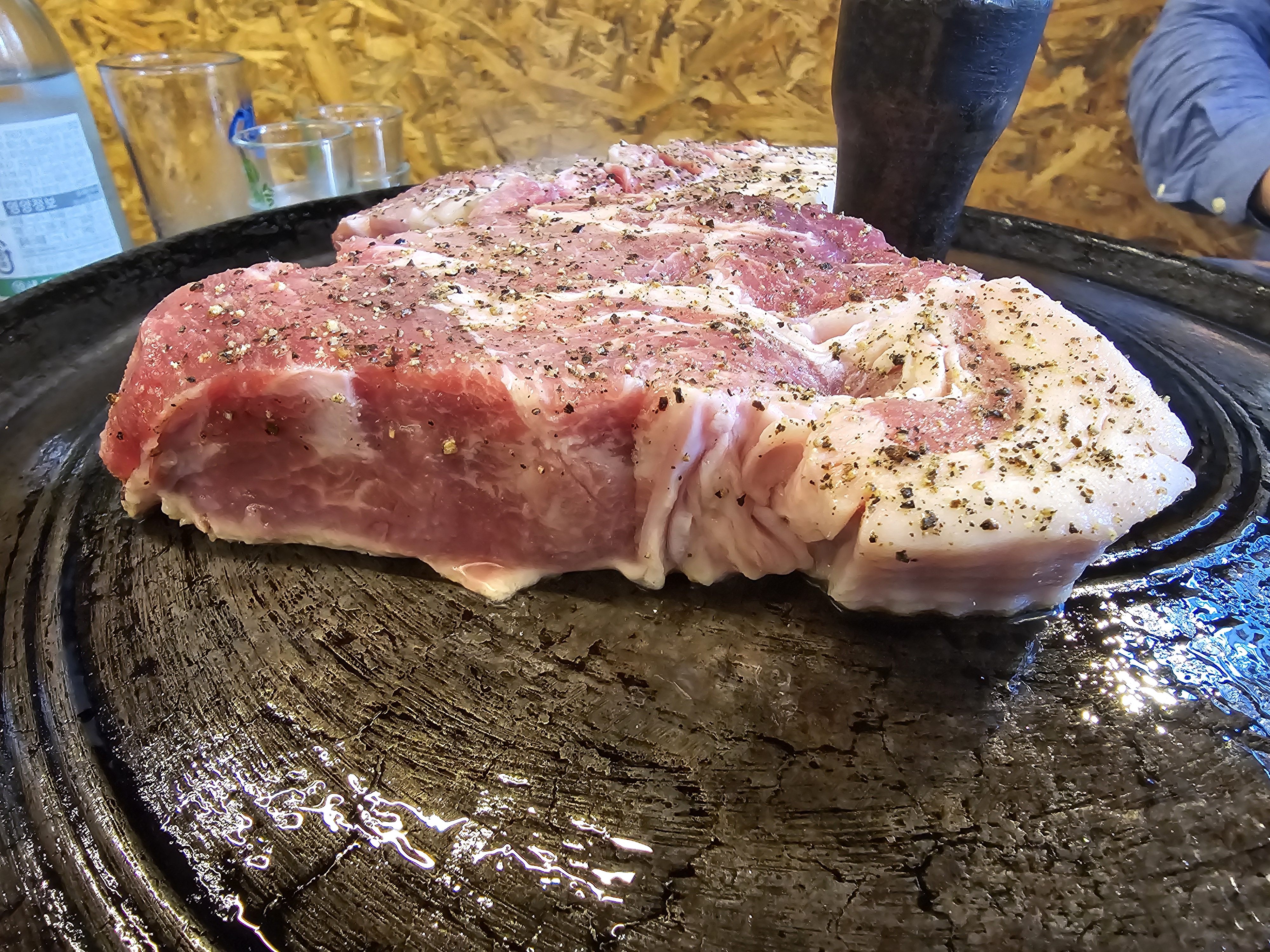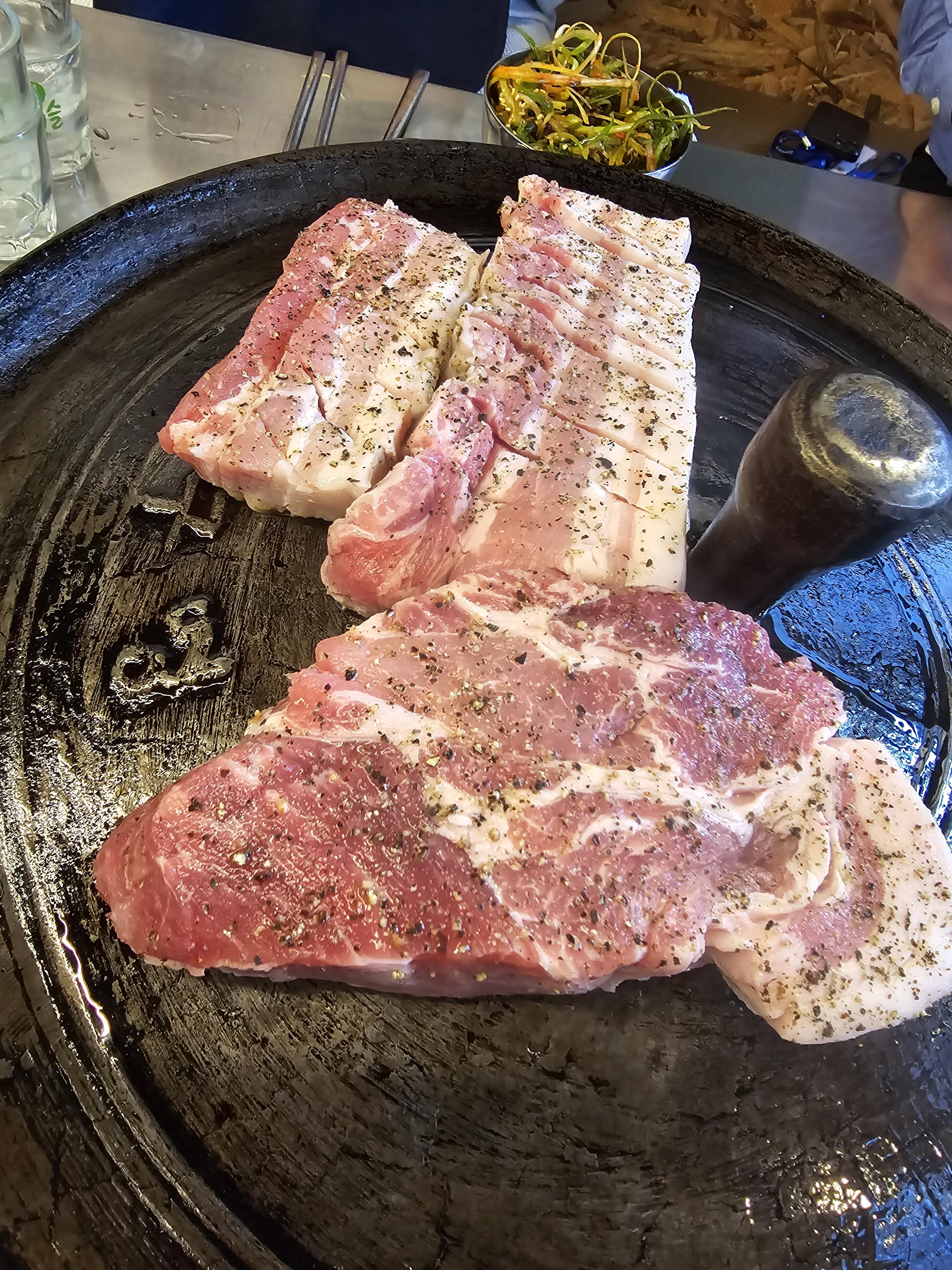 솥뚜껑위에 올려진 두툼하고 신선한 고기와