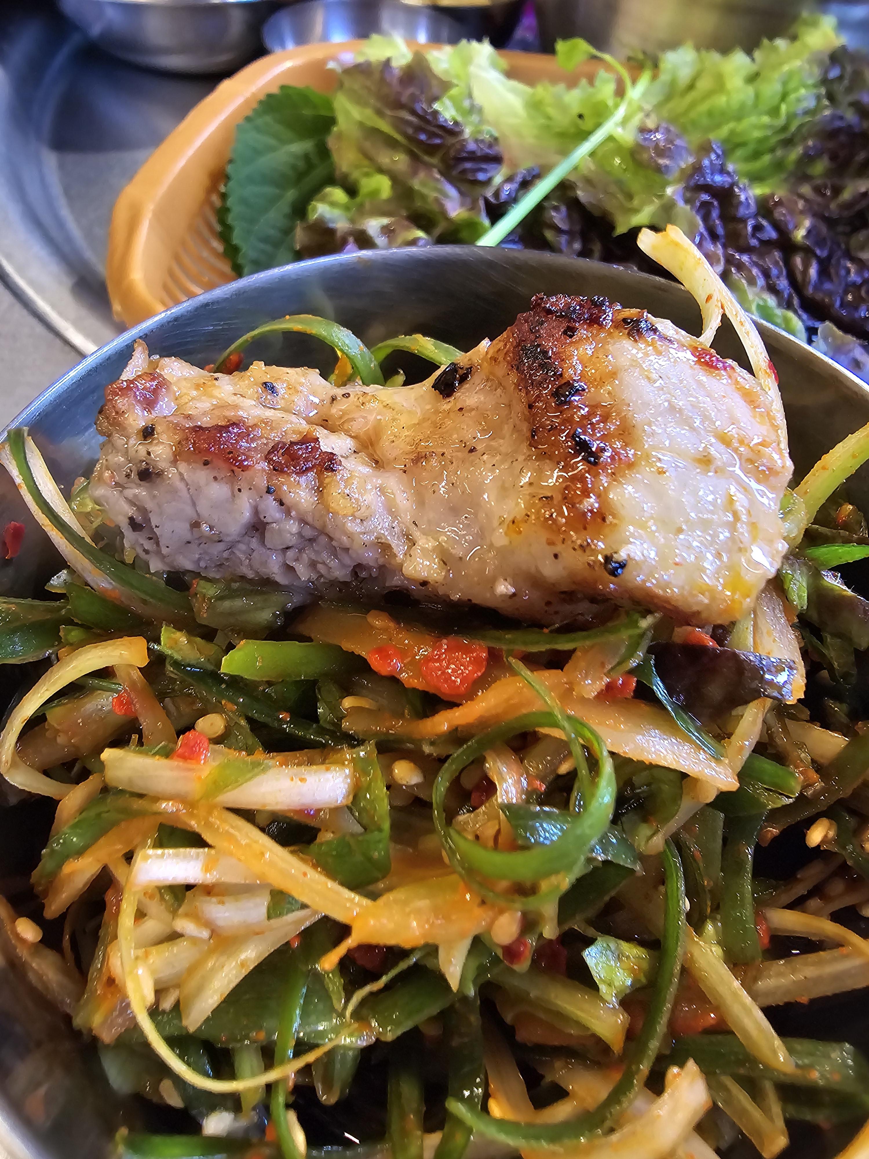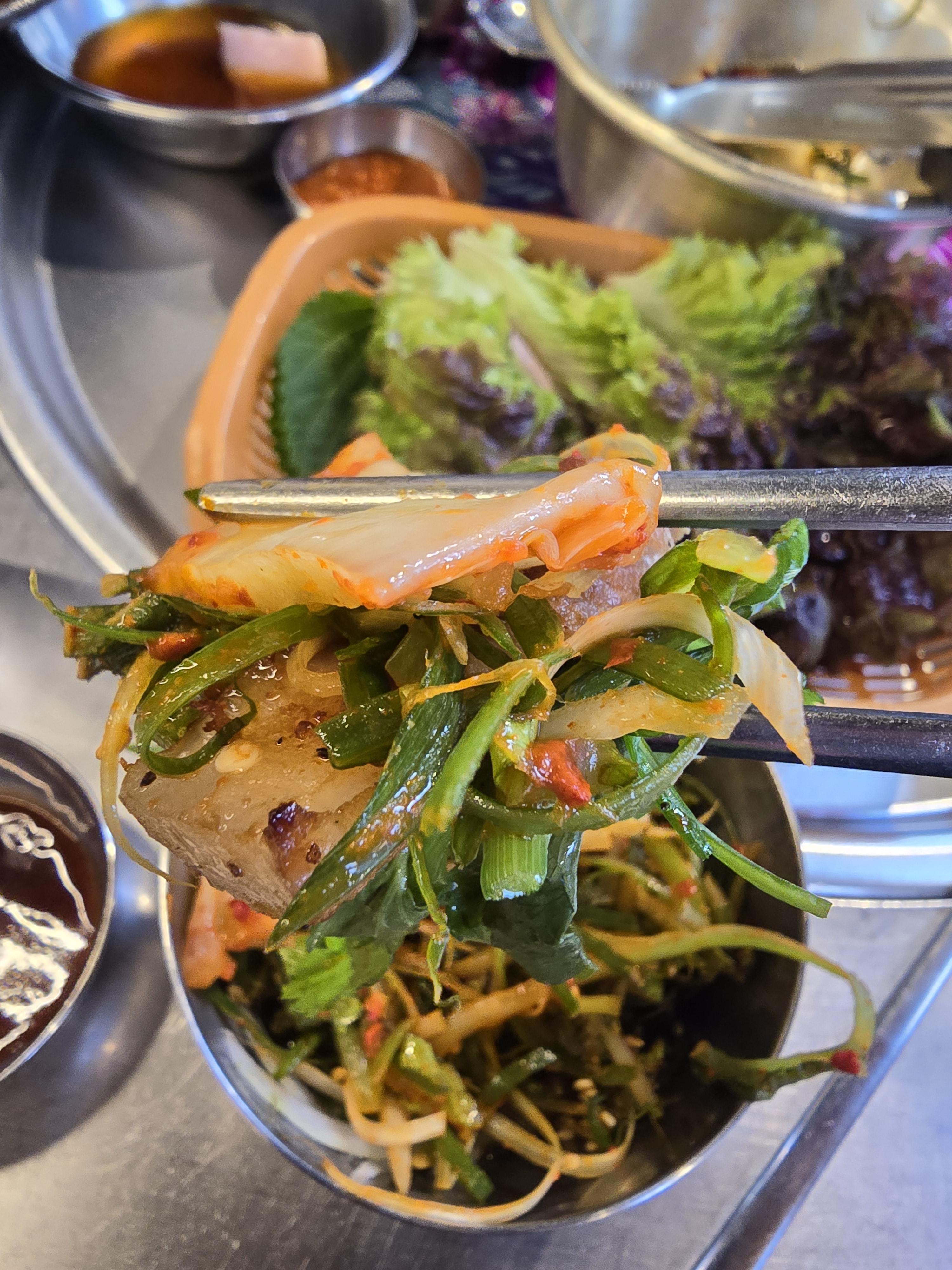 이번에는 처음 상차림이 셋팅될 때 준비했던 파와 양파절임의 콜라보와 같이 먹어보았어요