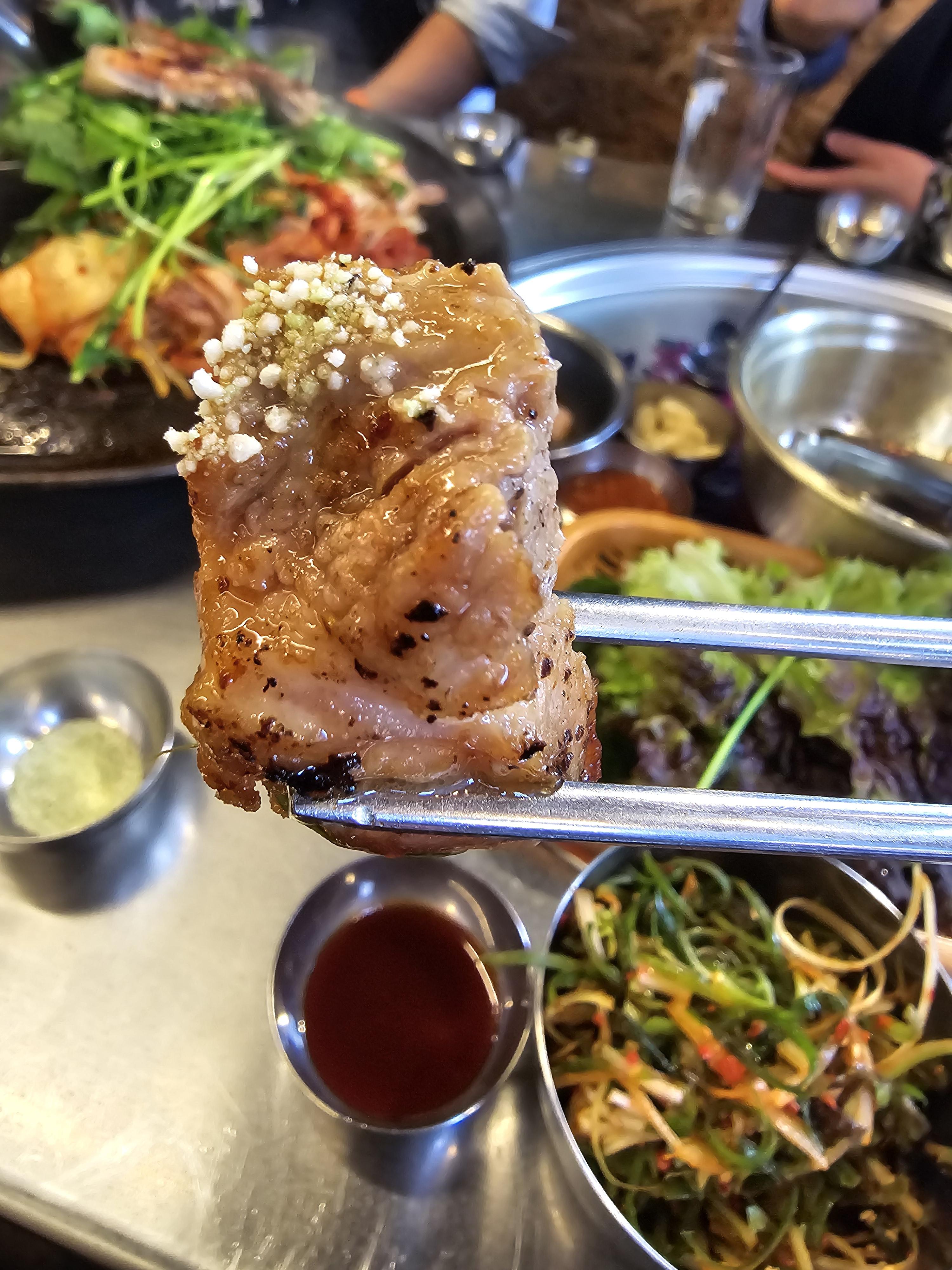 소금으로 간을 조절하고 와사비가 느끼함을 싸악 잡아주는 게 이제는 무조건 삼겹살에는 이거네요