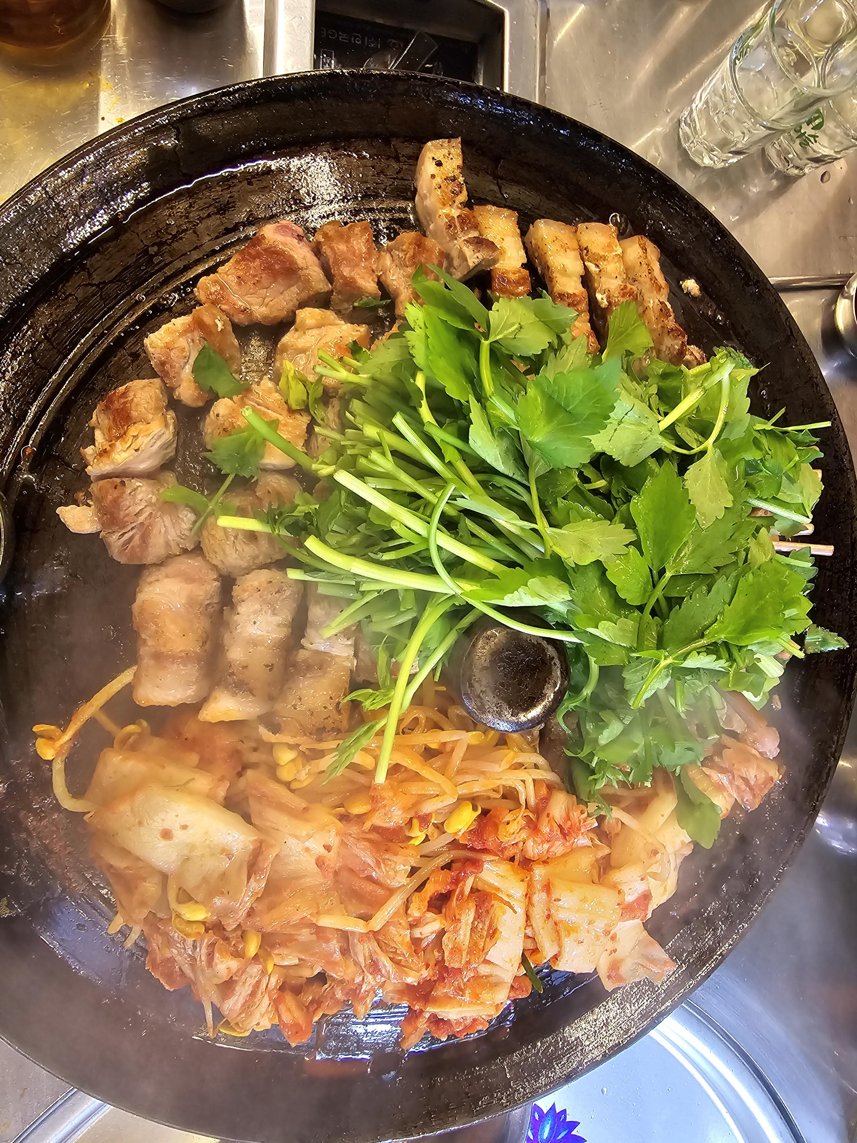 솥뚜껑 남은 부분에는 콩나물과 김치를 올려서 삼겹살 기름에 잘 익혀줘야겠죠?