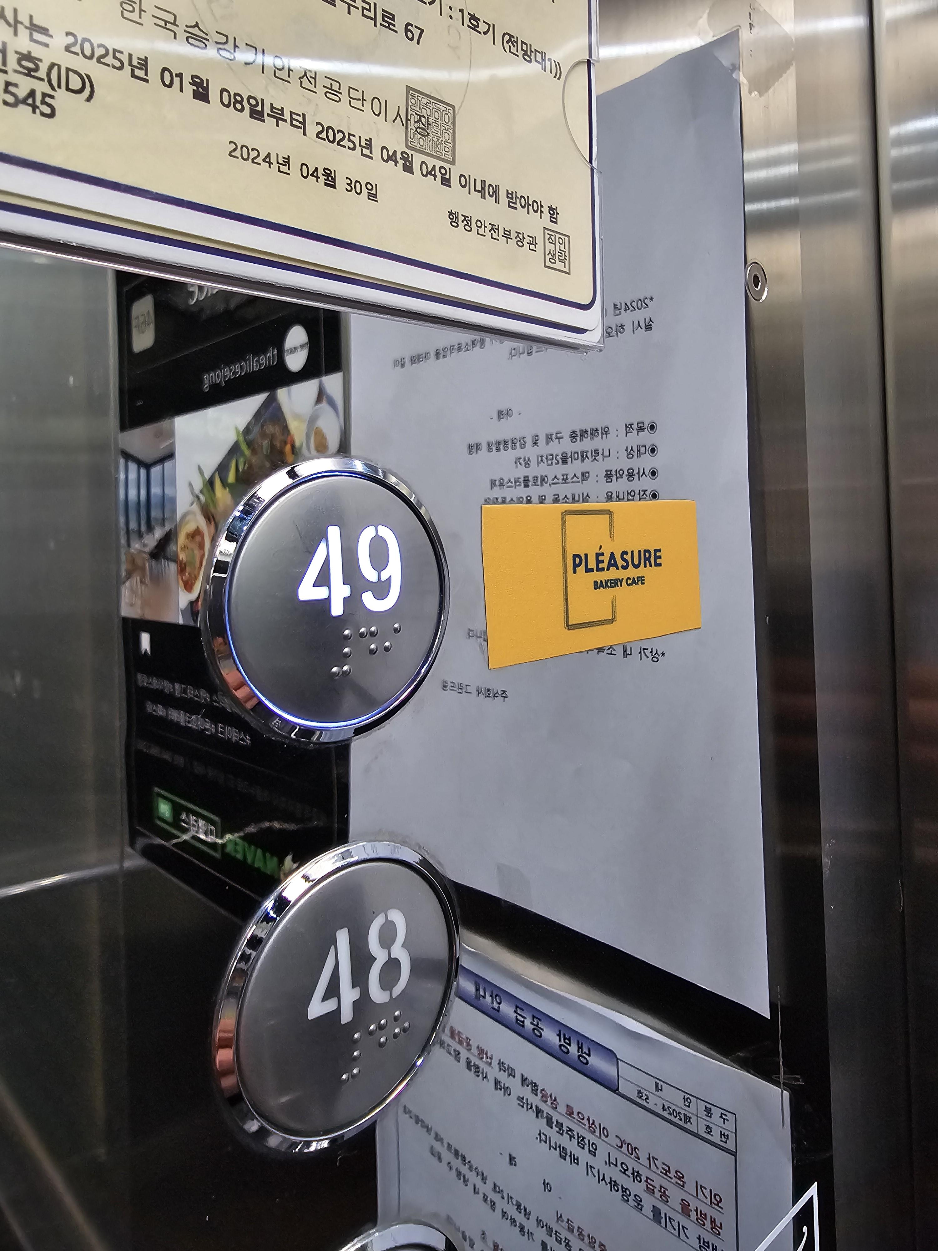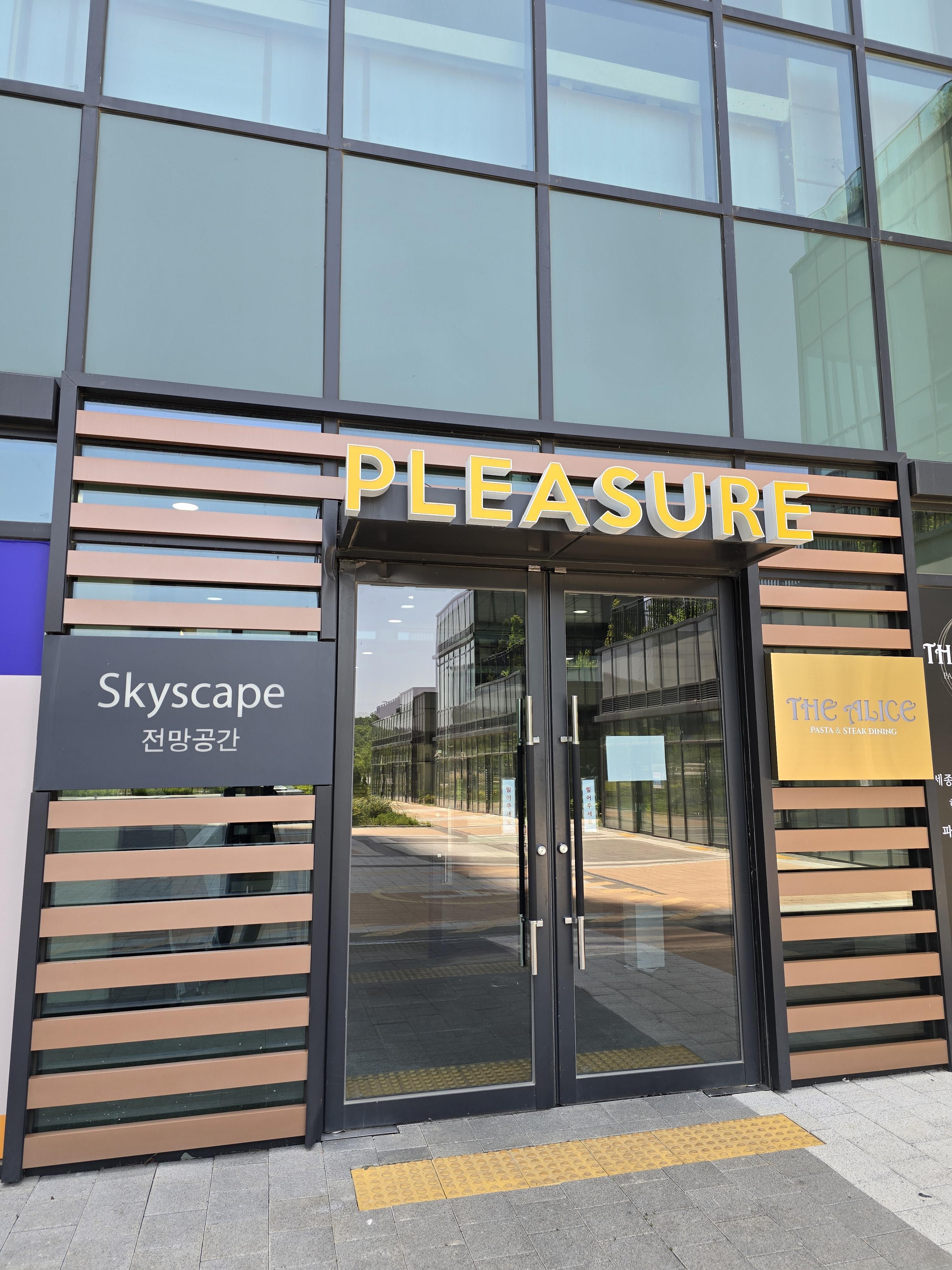 49층에 도착해서 엘리베이터 문이 열리면 손님을 반기는 플레져의 간판이 기다리고 있어요