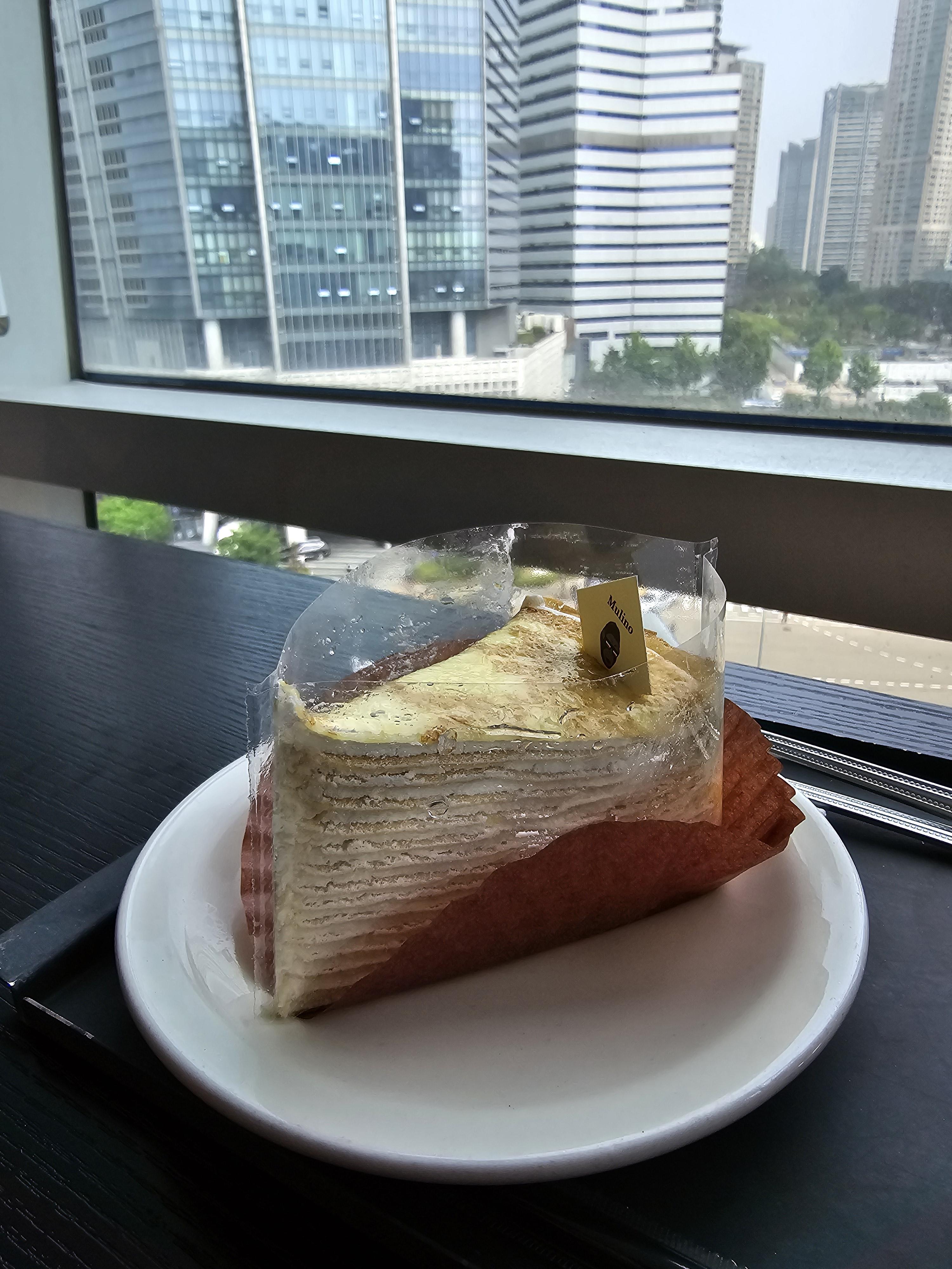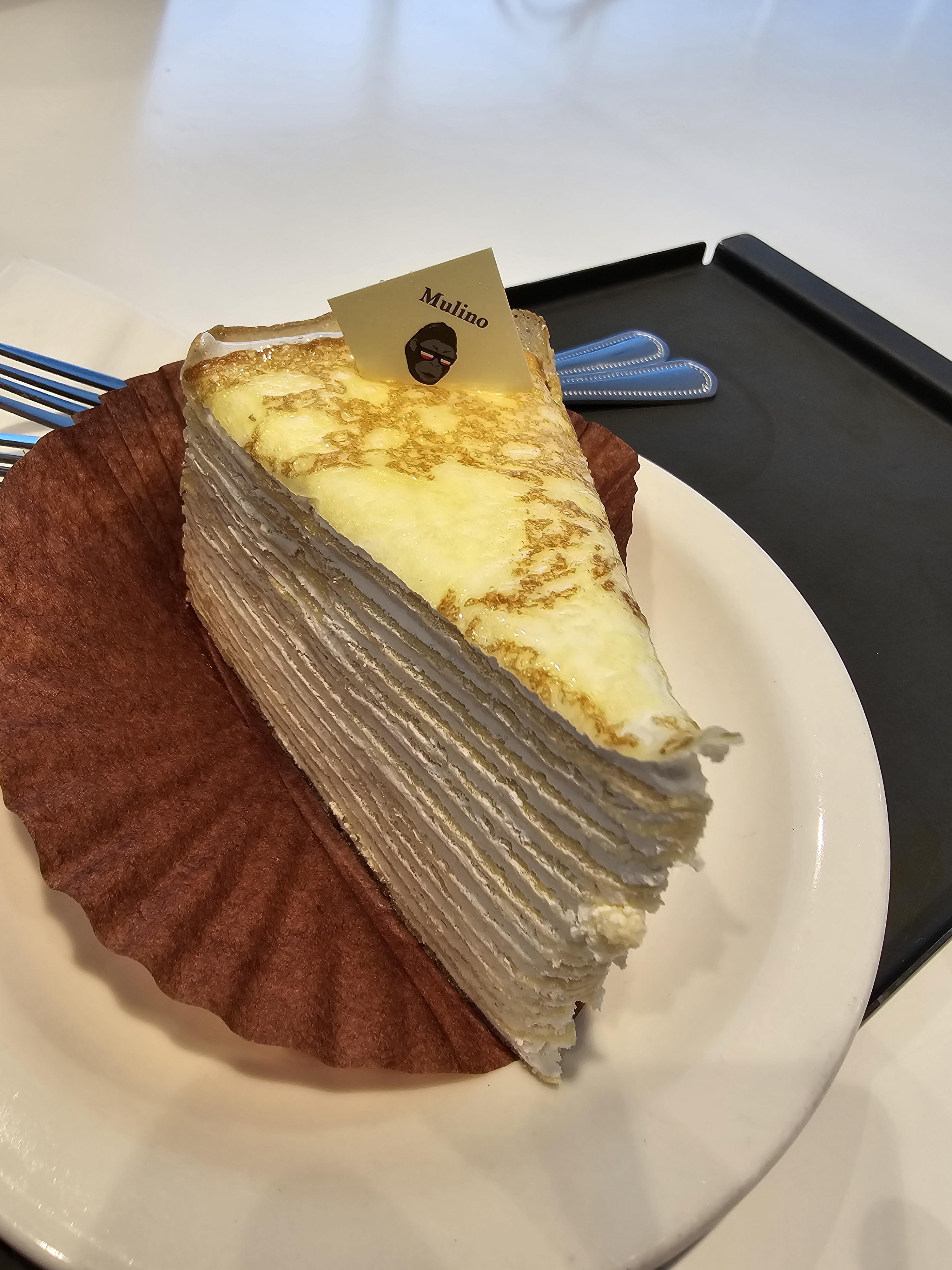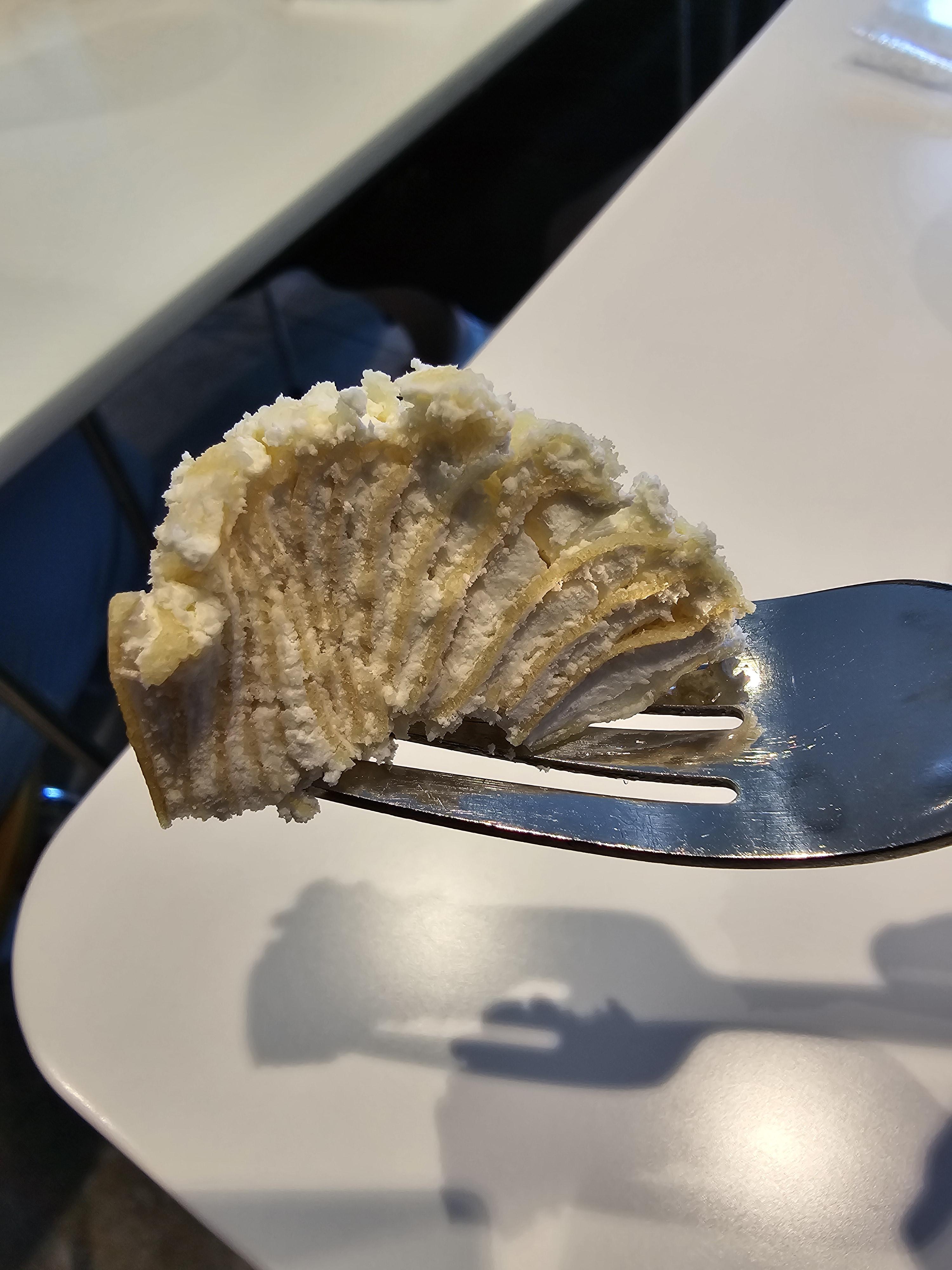 밀크레이프 케이크는 겹겹이 쌓여 있는 크레이프와 밀의 약간 거친 식감이 잘 어울리는 맛이었어요
