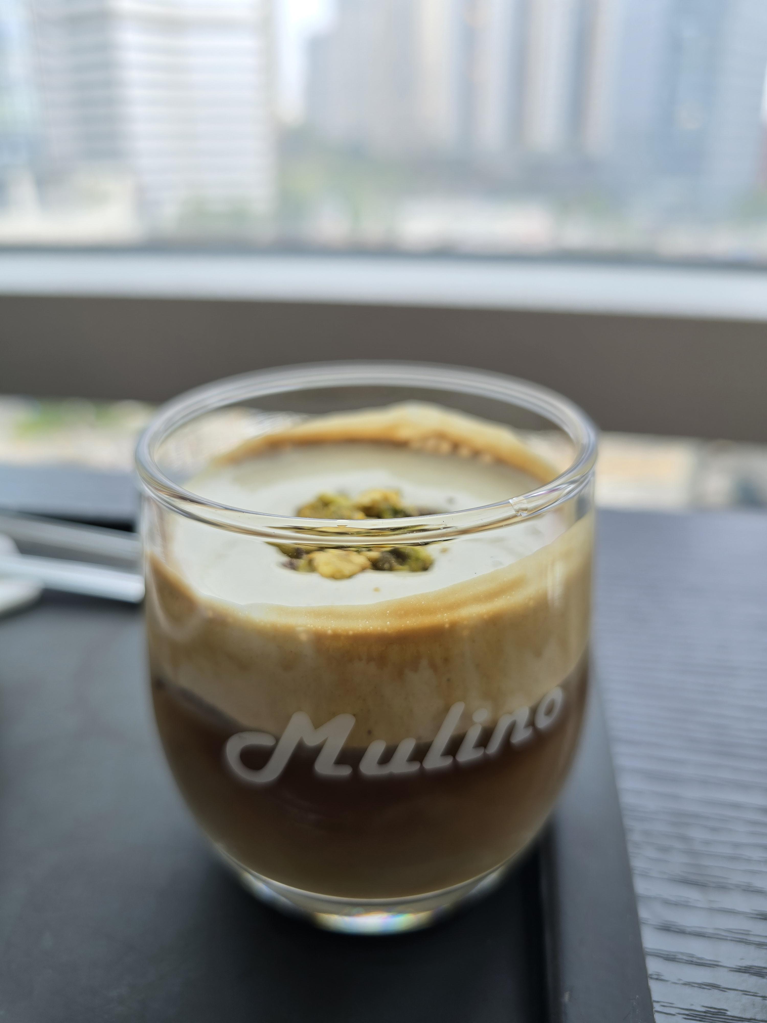 오크밀크와 피스타치오크림층이 커피위에 올라간 상태로 나오는데 얼음은 따로 들어가있지 않은 아이스음료예요