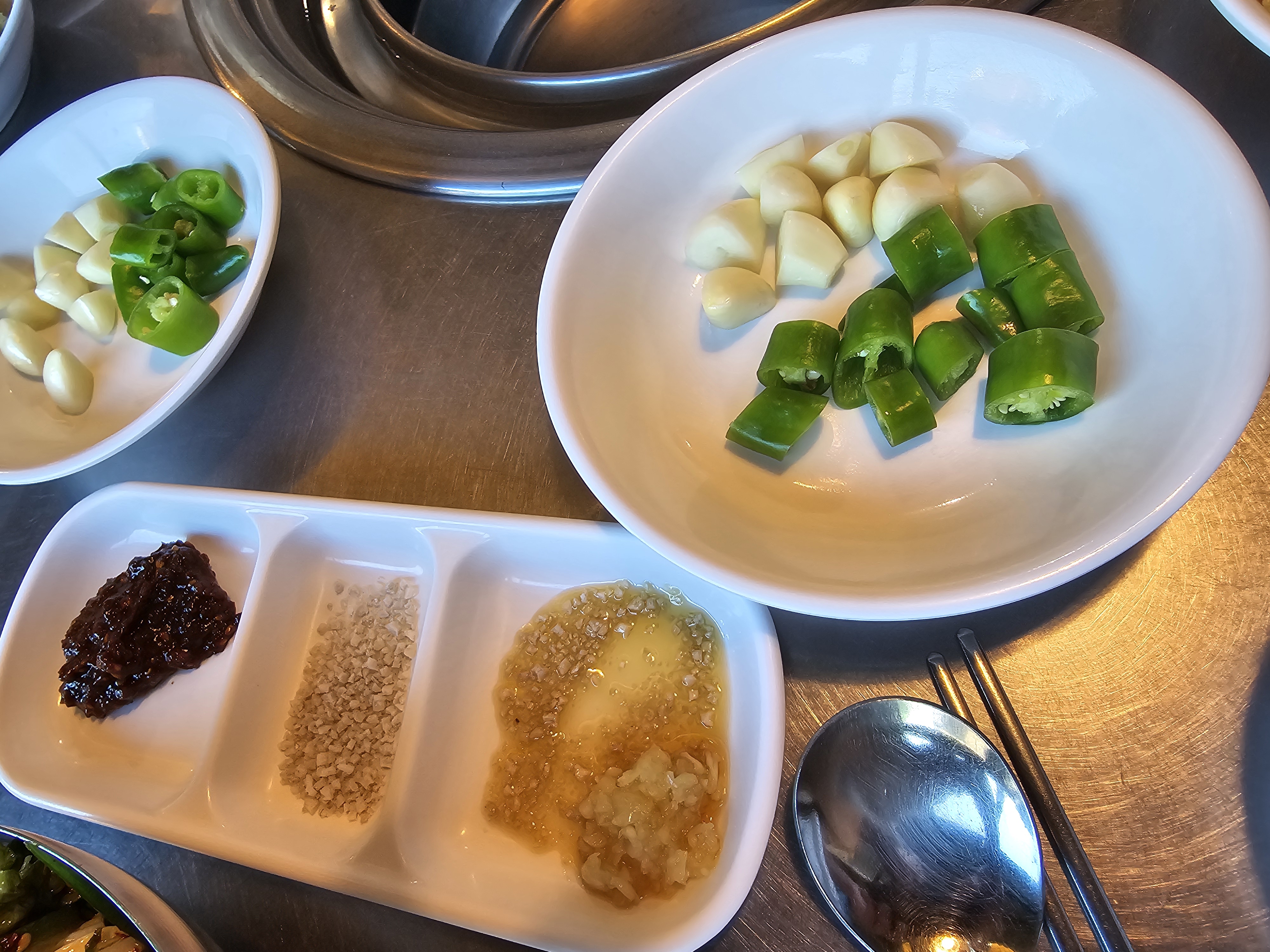 상차림 기본으로 고기를 찍어먹을 재료 3종과 마늘, 고추가 나오고요