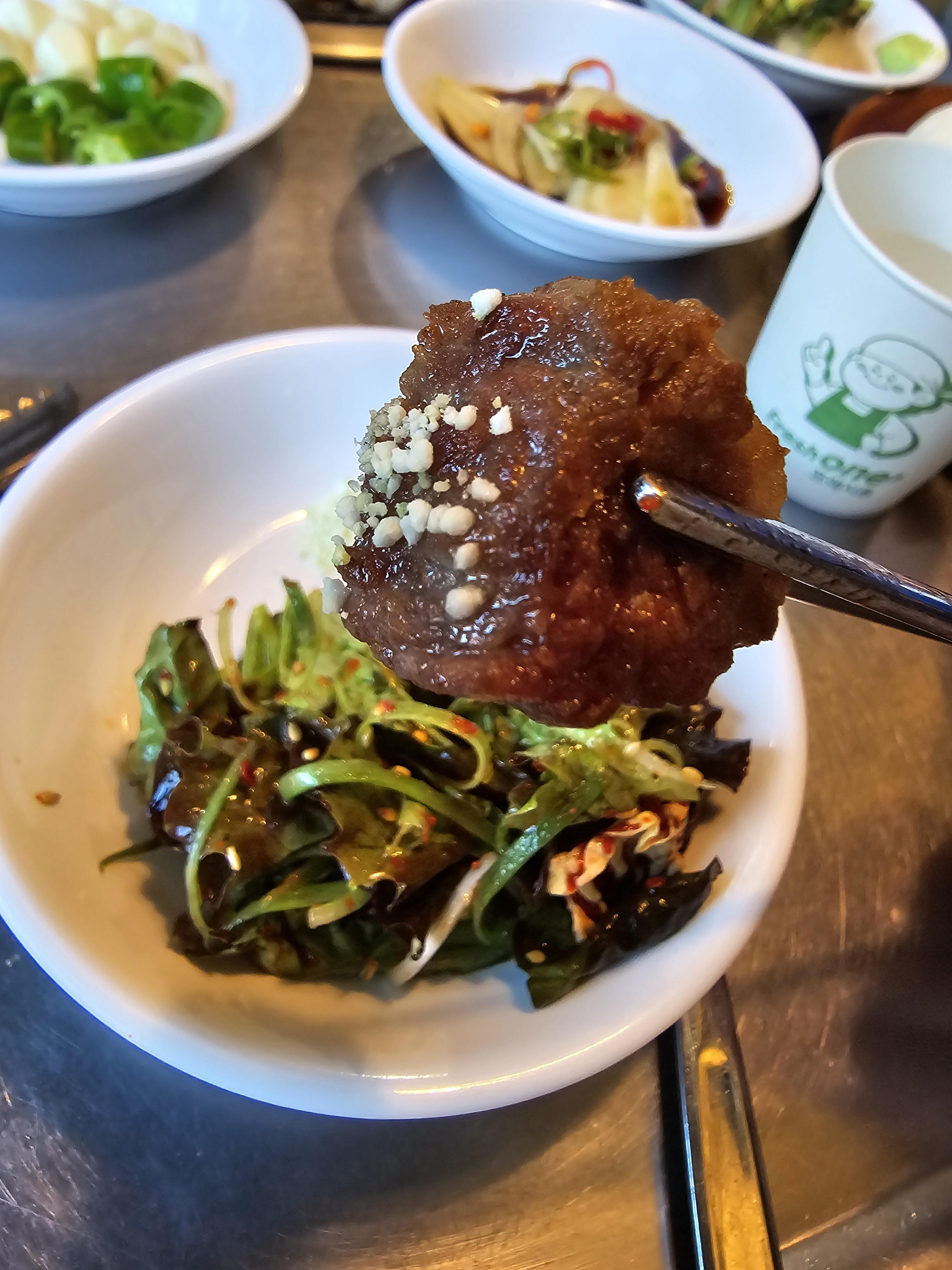 목살은 와사비소금 찍어서 야채무침과 야무지게 먹었네요