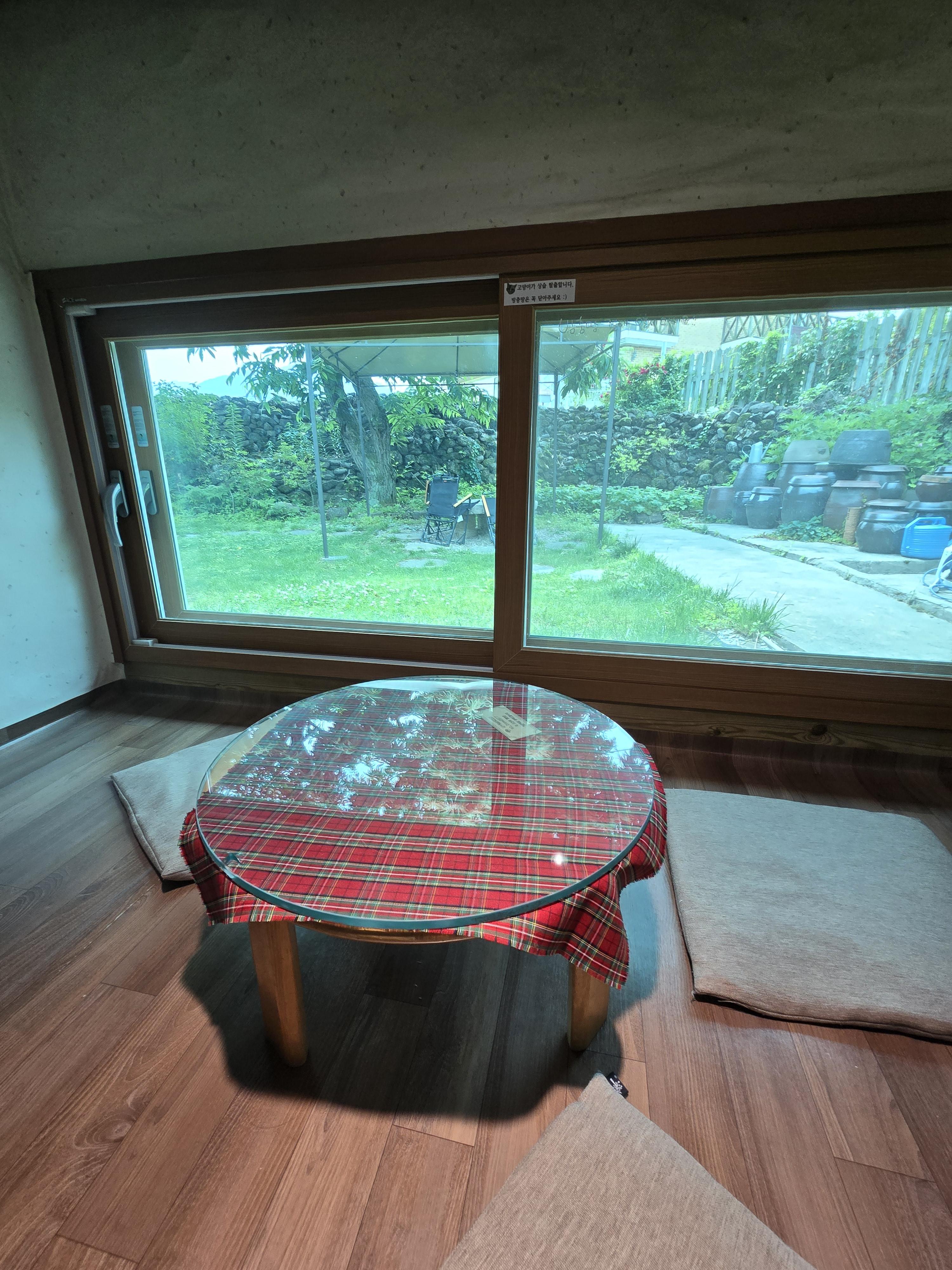 아래로 창이 나 있는 오붓한 곳에 자리를 잡았는데 마당과 같은 높이의 창을 통해 푸릇푸릇한 마당을 볼 수 있었어요