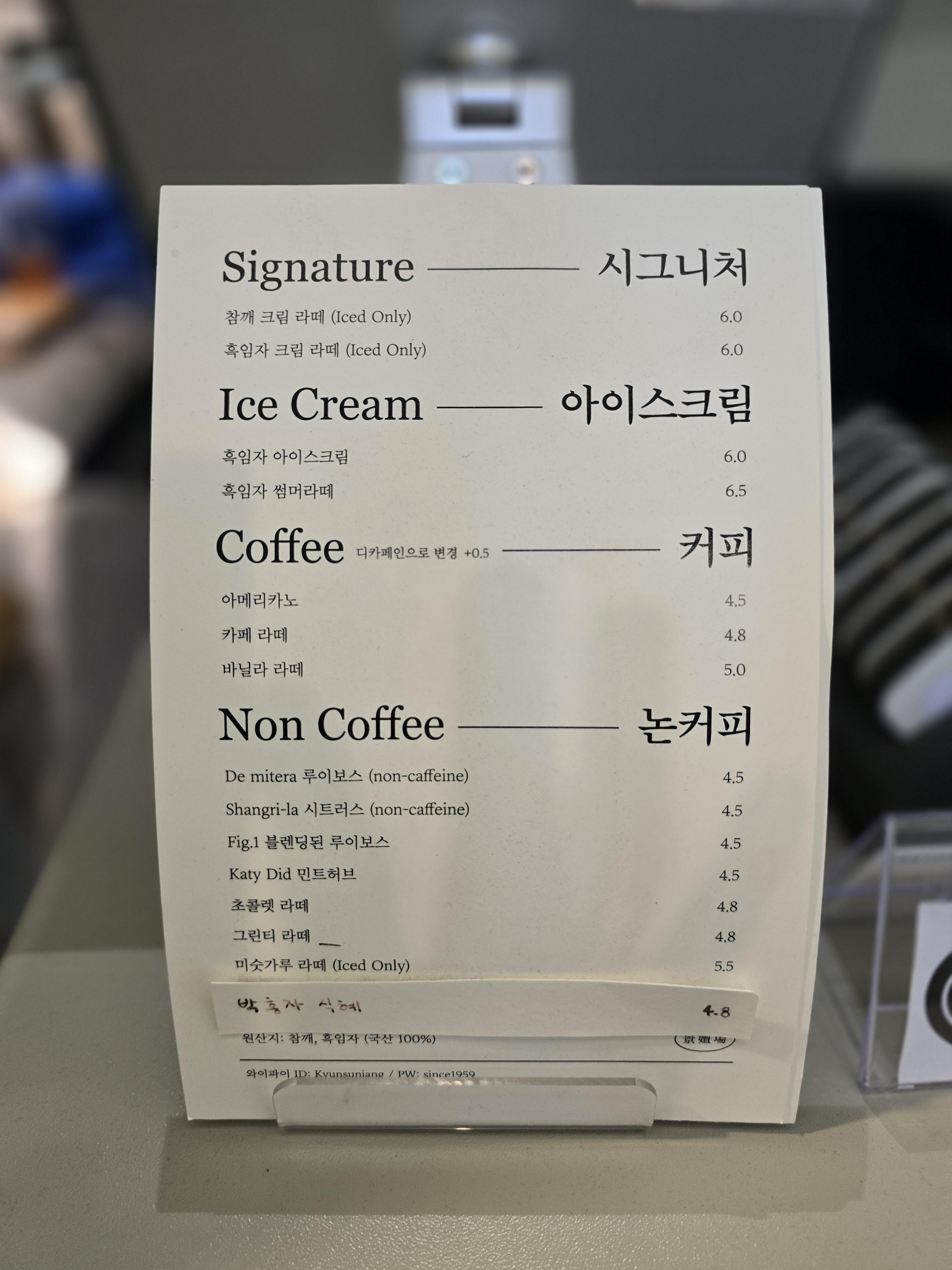 주문대 앞에 서면 경선장의 메뉴판이 놓여있는 데 시그니처 메뉴는 깨를 볶아서 기름을 짜내는 곳 답게 참께 크림라떼와 흑임자크림라떼가 시그니처라고 하시더라고요
