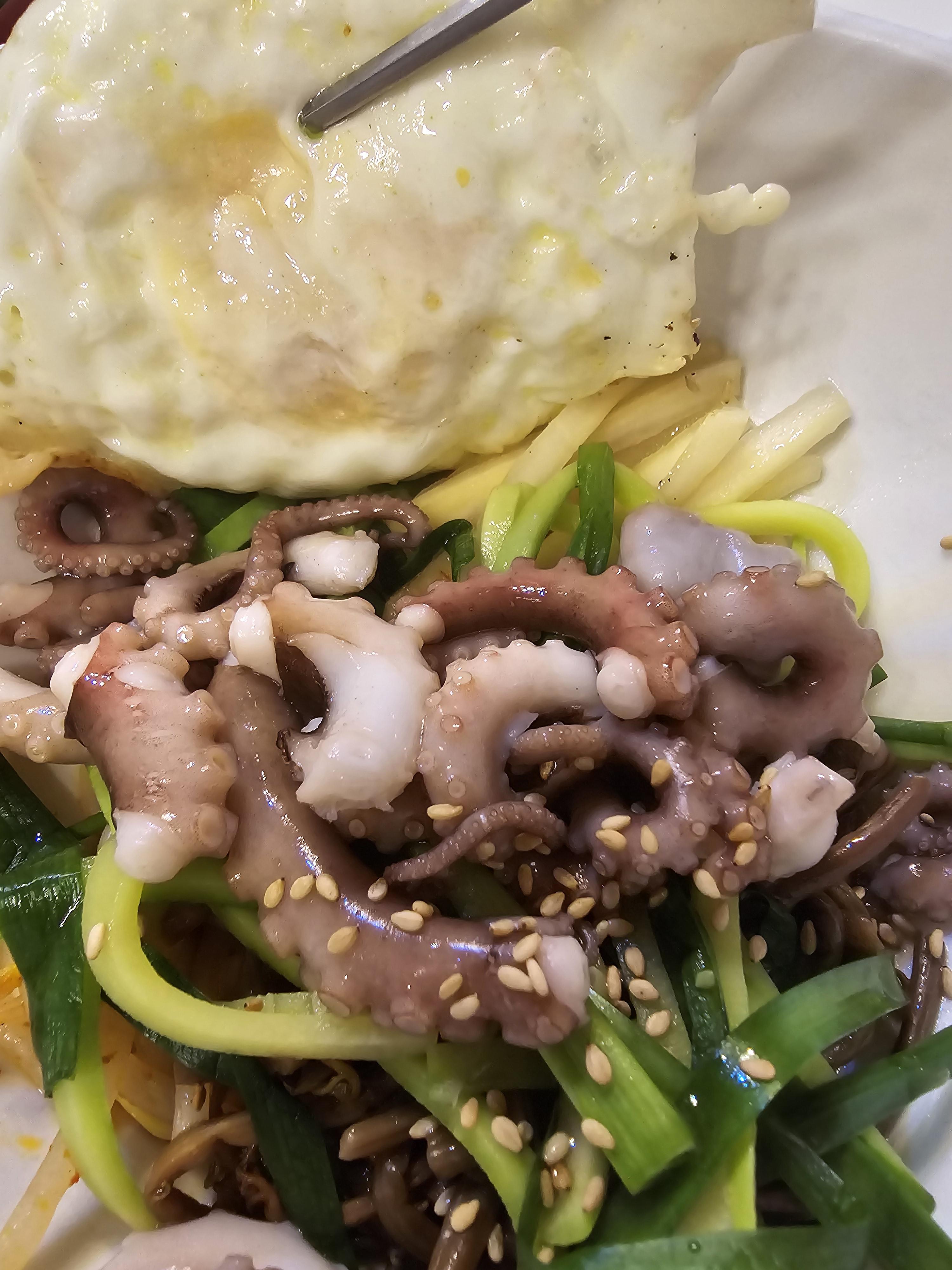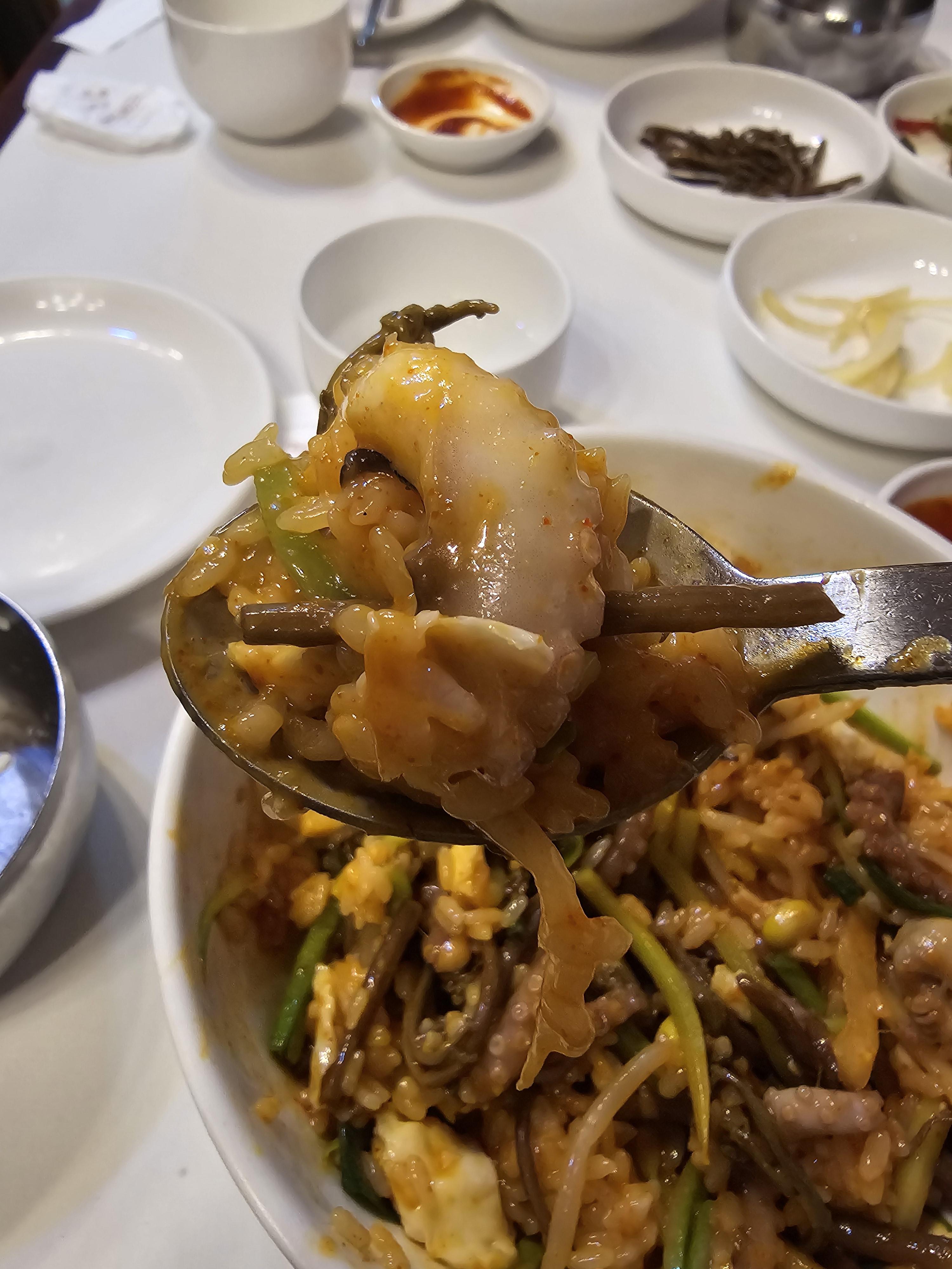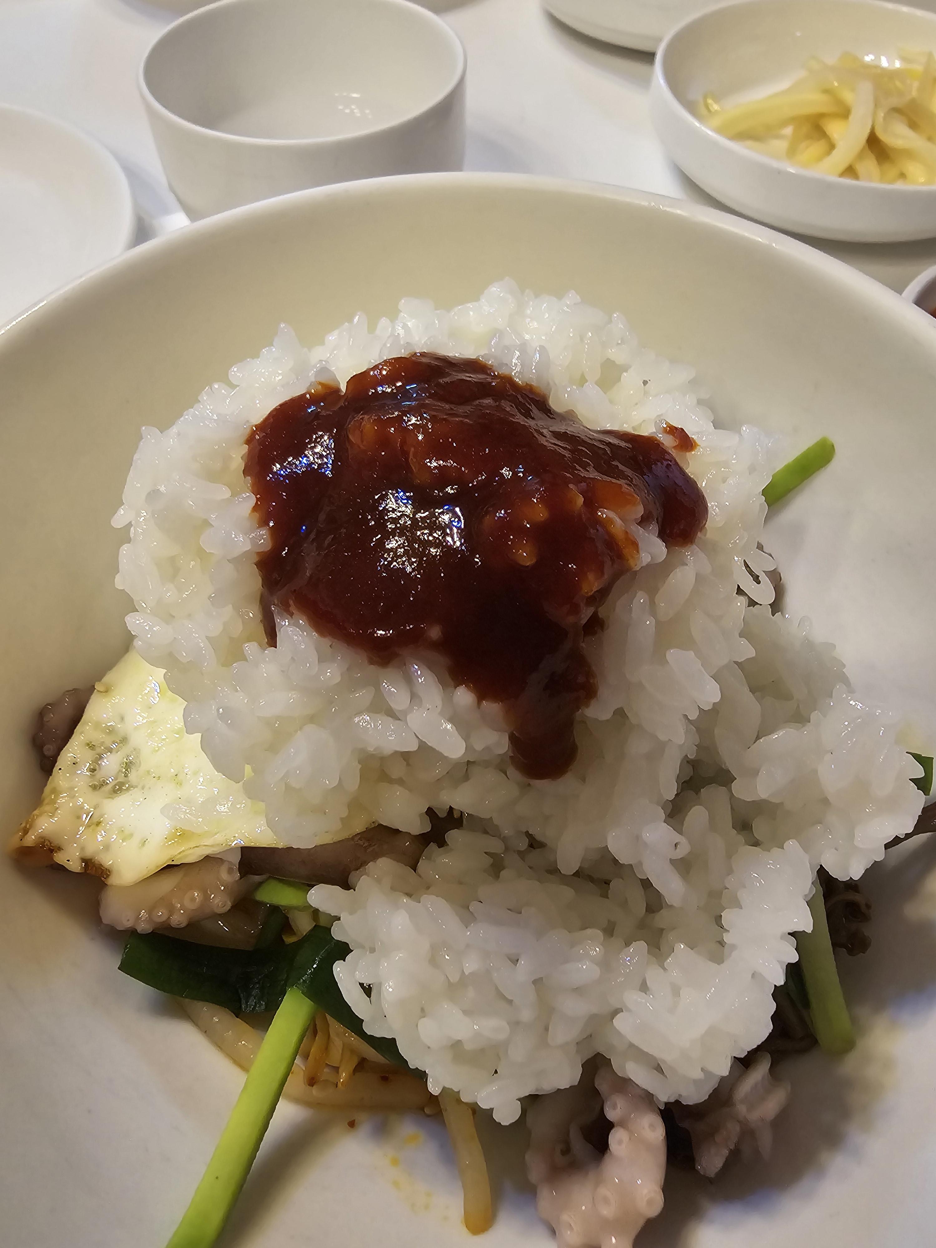 실한 낙지가 많이 들어가서 좋았고 제가 알던 매운 낙지비빔밥이 아니어서 더 좋았어요