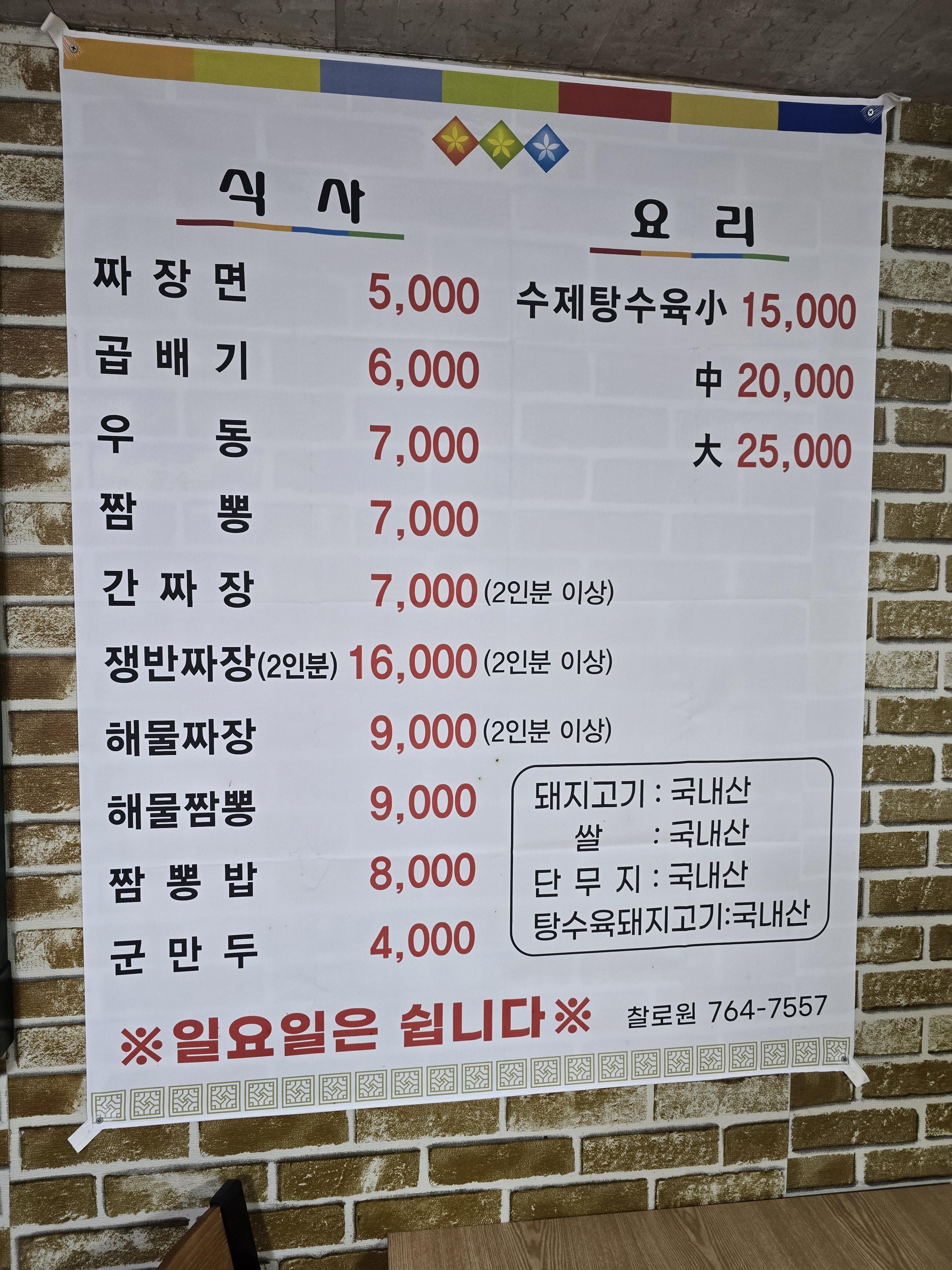 메뉴판은 벽면에 현수막으로 붙어 있는데 짜장면 5천원 가격이 말해주듯이 다른 곳보다 착한 가격인게 찰로원의 가장 매력적인 부분 같아요