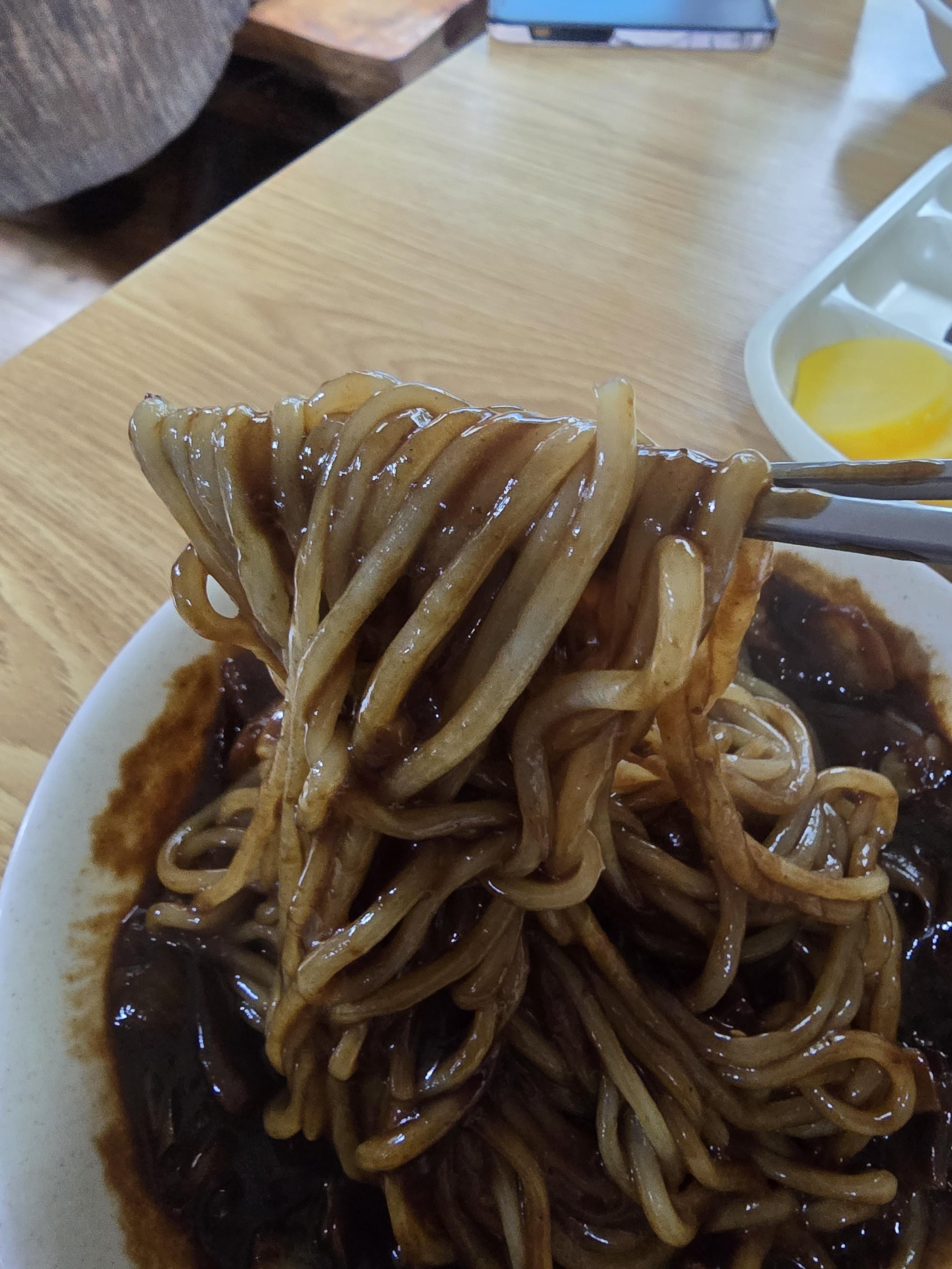 짜장면을 잘 비벼서 한젓가락 들어보니 군침이 흐르더라고요 짜장면은 너무 짜지도 않고 간이 딱 맞았고요