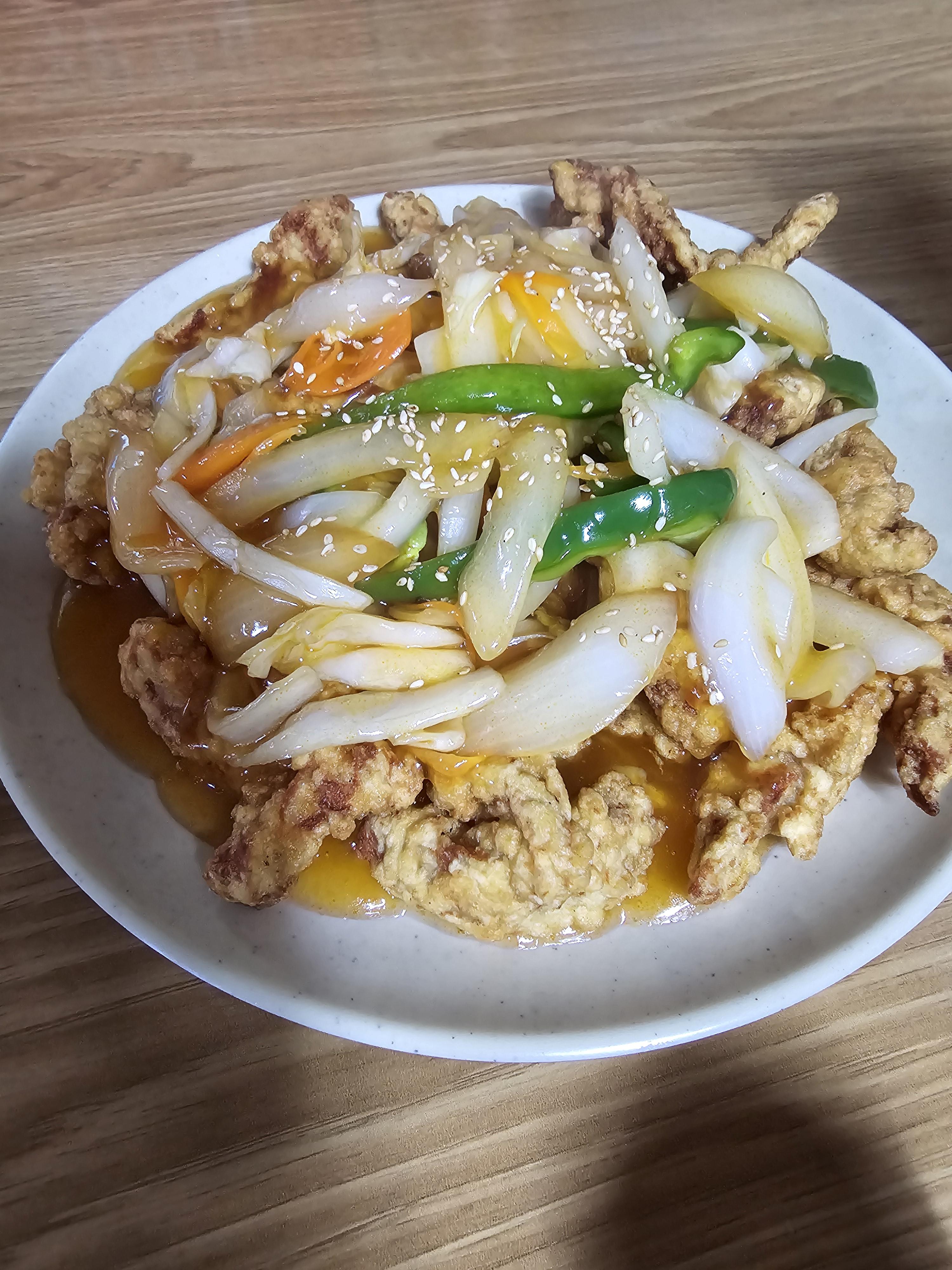 갓 튀겨서 김이 모락모락나는 수제탕수육이 나왔어요