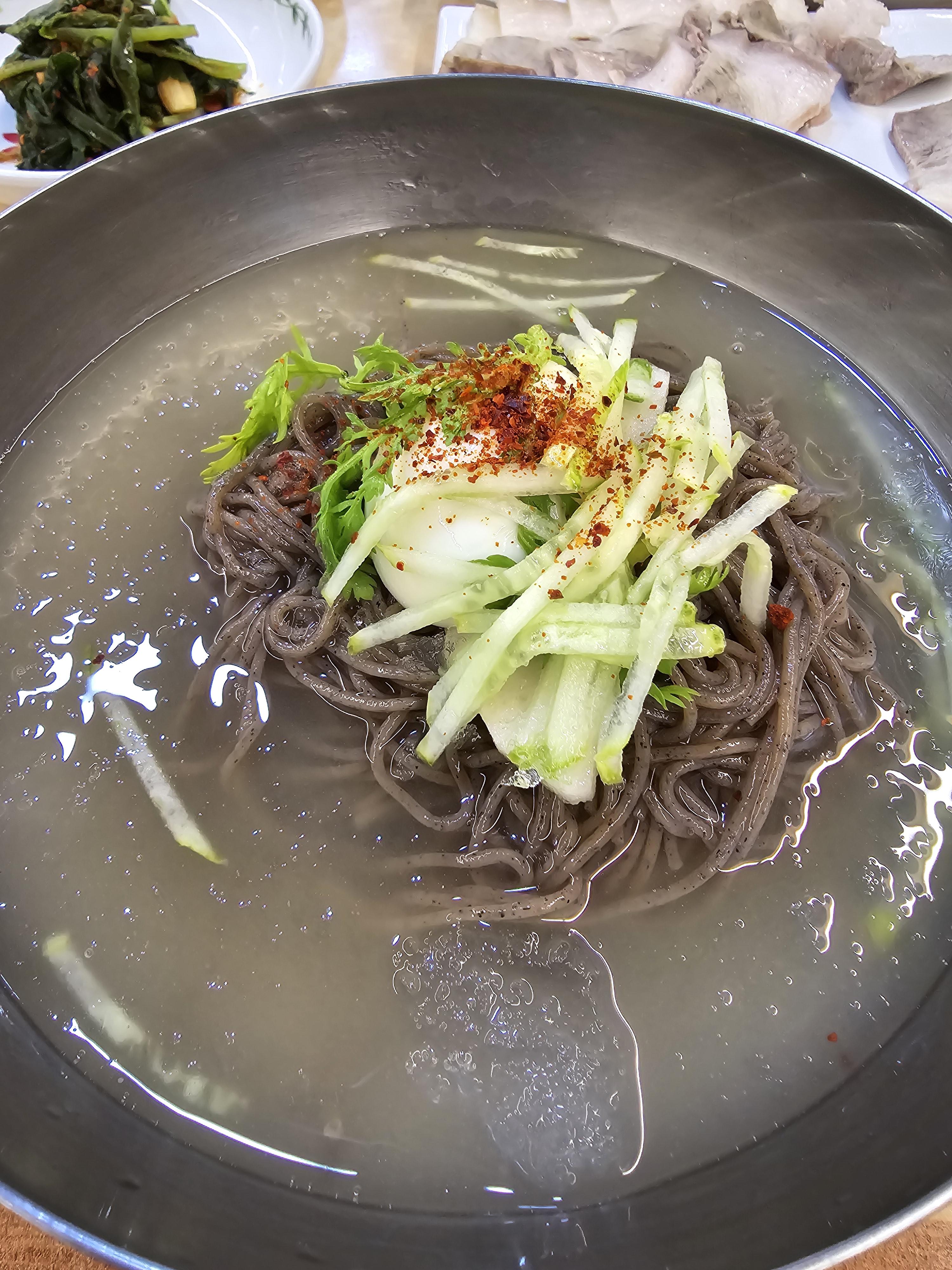 면은 조금 뚝뚝 끊기는 느낌이예요 메밀의 맛이 느껴지는 딱 메밀막국수 느낌이었어요