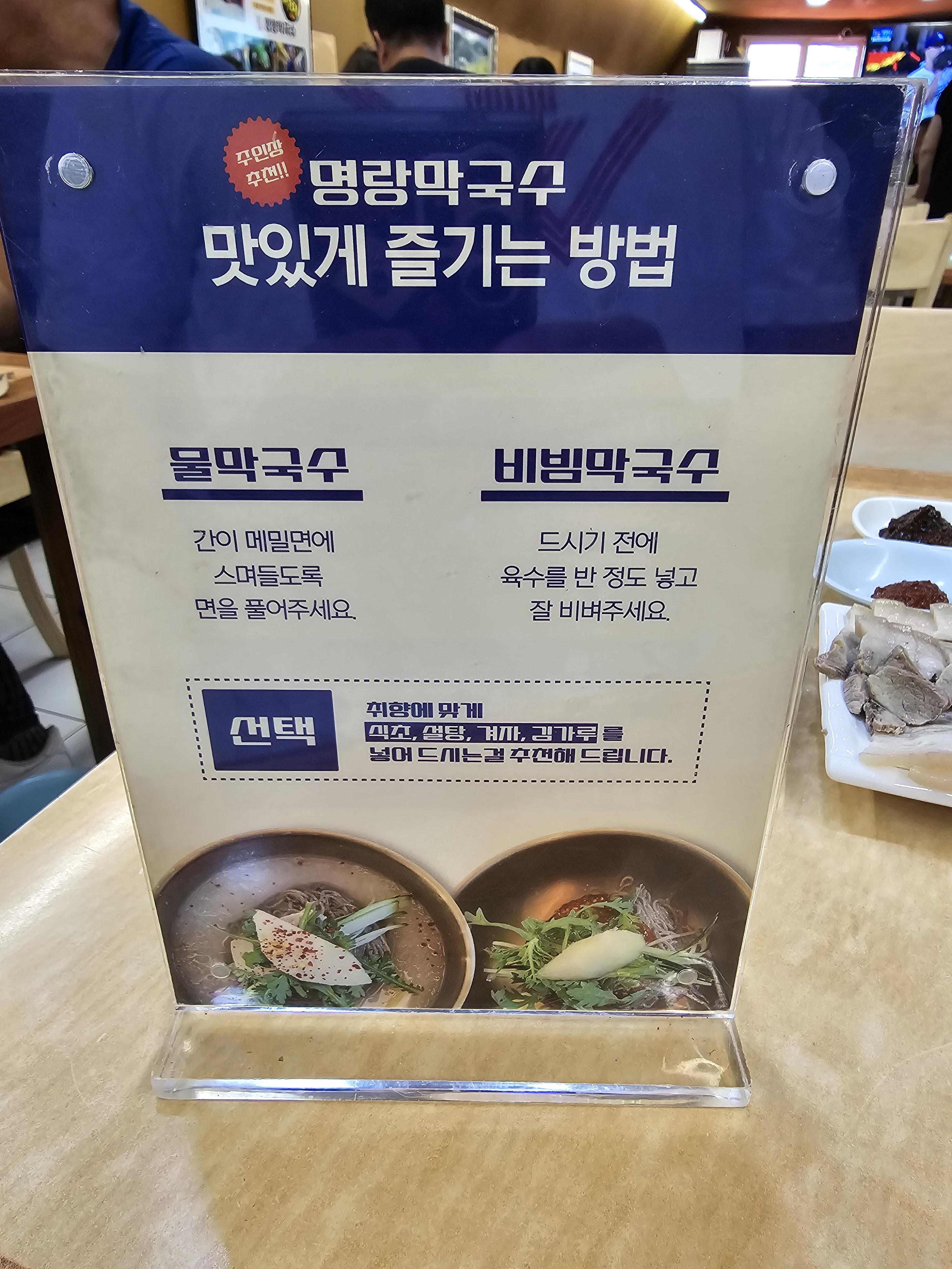 메뉴판 뒤편에는 막국수 맛있게 먹는 법이 친절하기 설명되어 있어서 누구나 맛있게 막국수를 즐길 수 있어요😃