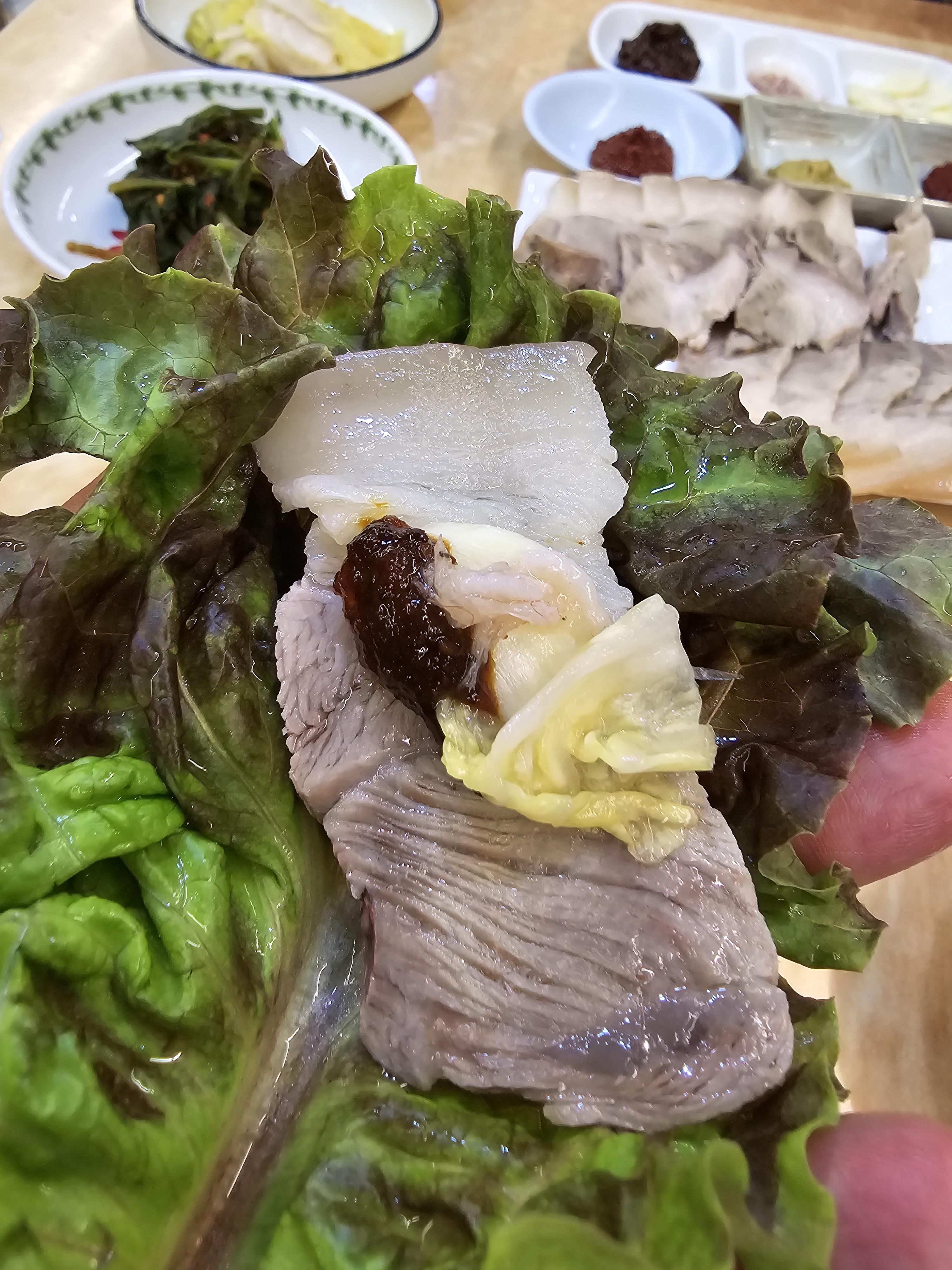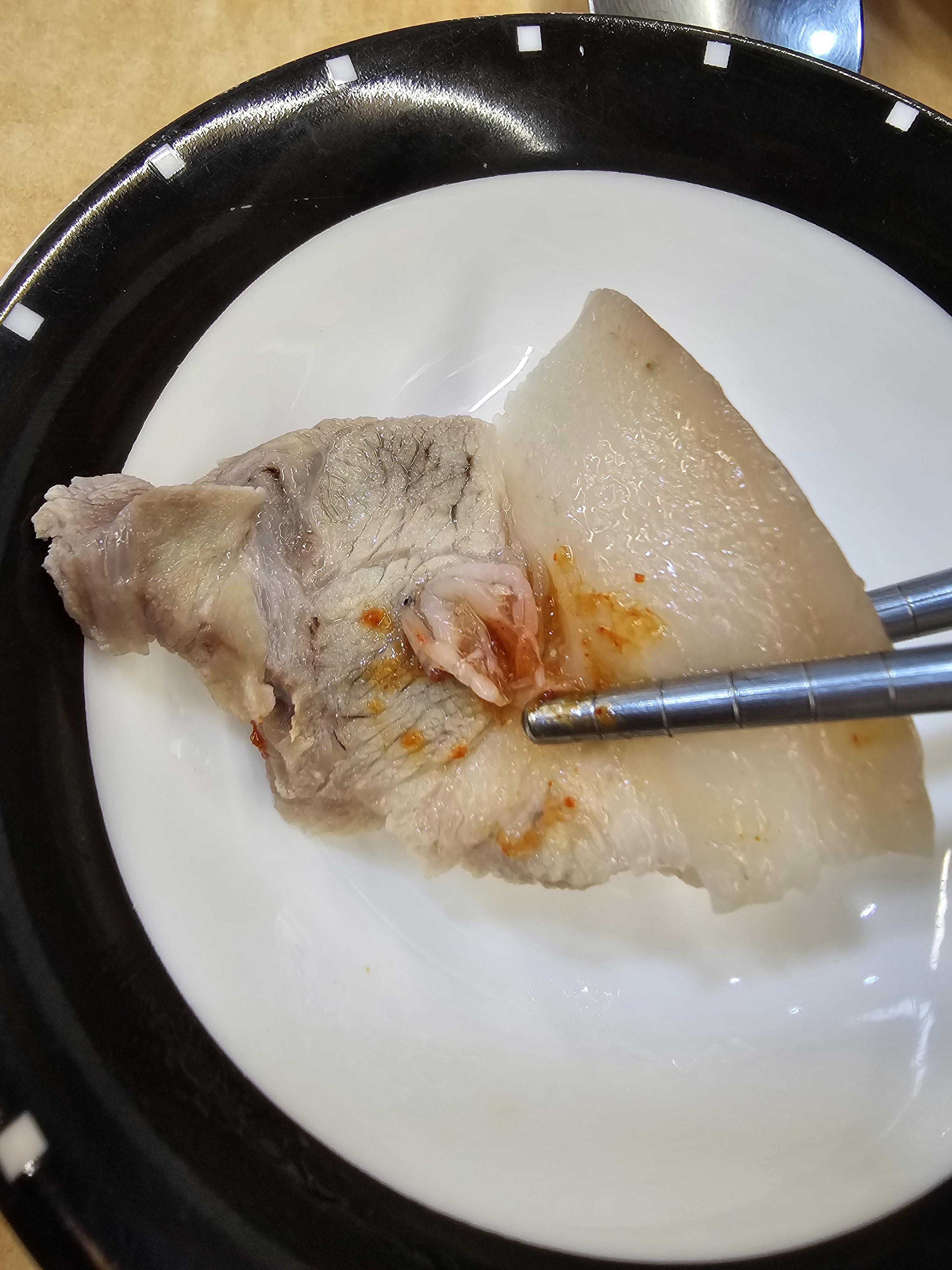 회전율이 빠른 식당답게 편육이 금방 나왔어요 편육은 다른곳과 조금 다른 비주얼이예요 집에서 삶은 듯한 고기인데 잡내도 전혀 나지않고 부드럽고 맛있어요