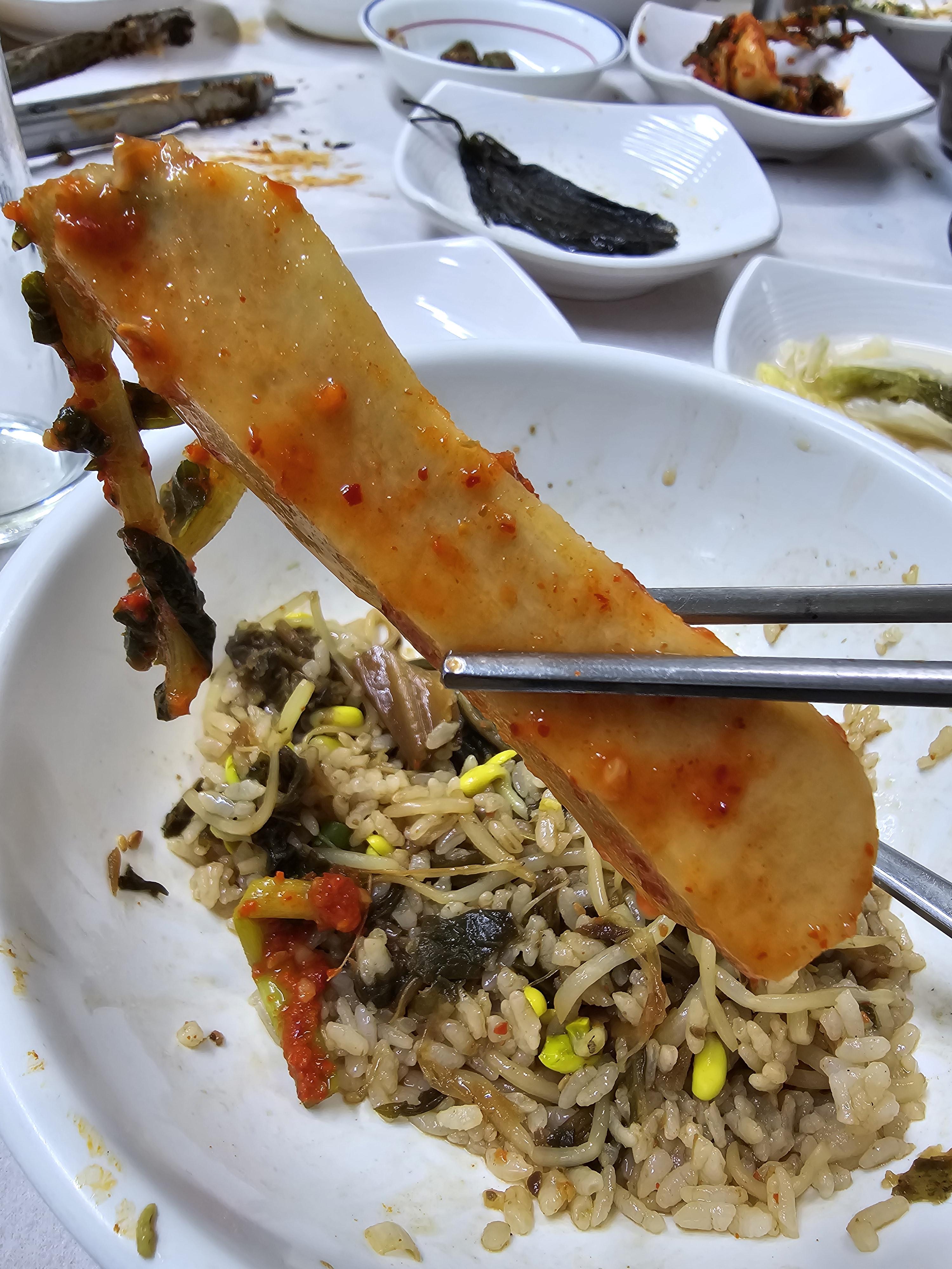 잘 익은 무김치까지 같이 먹어주면 새콤함이 된장 밥과 함께 조화를 이뤄요