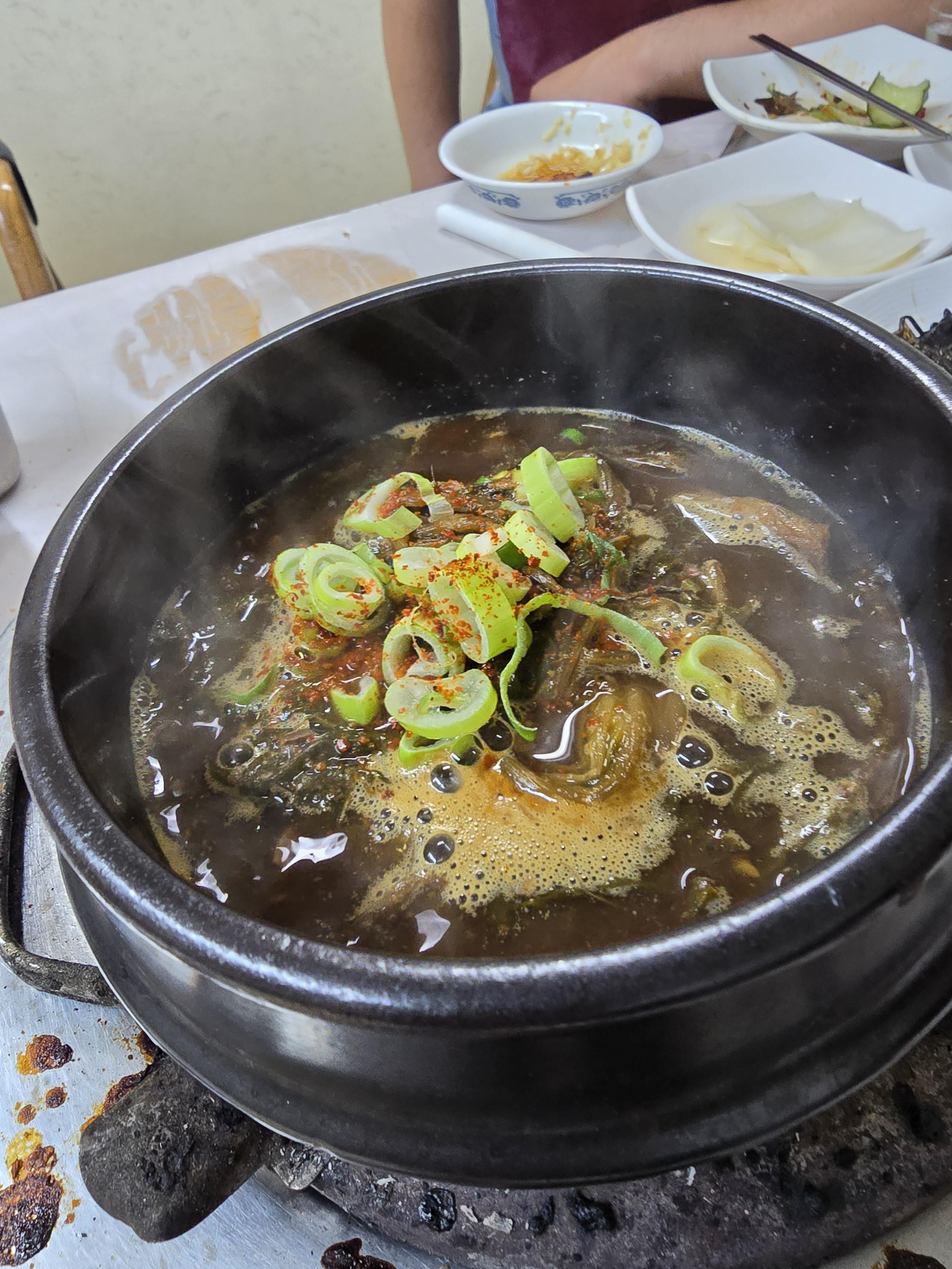먼저 나온 된장찌개는 보글보글 끓는데 진한 막장으로 끓인 스타일이 아니고 정말 된장만으로 끓인 스타일이예요