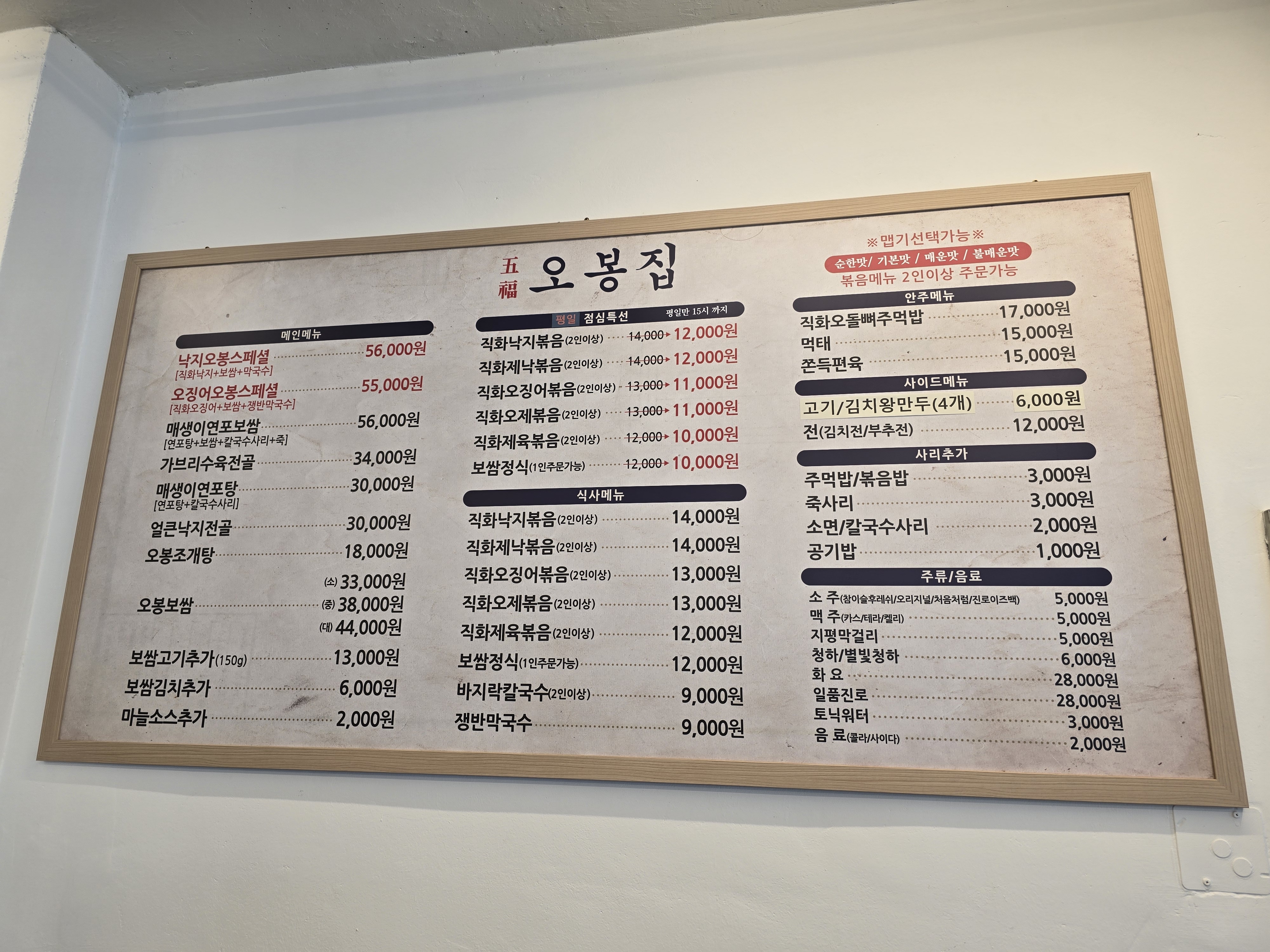 ○ 주요 메뉴 : 낙지오봉스페셜, 연포탕, 낙지전골, 보쌈정식 등