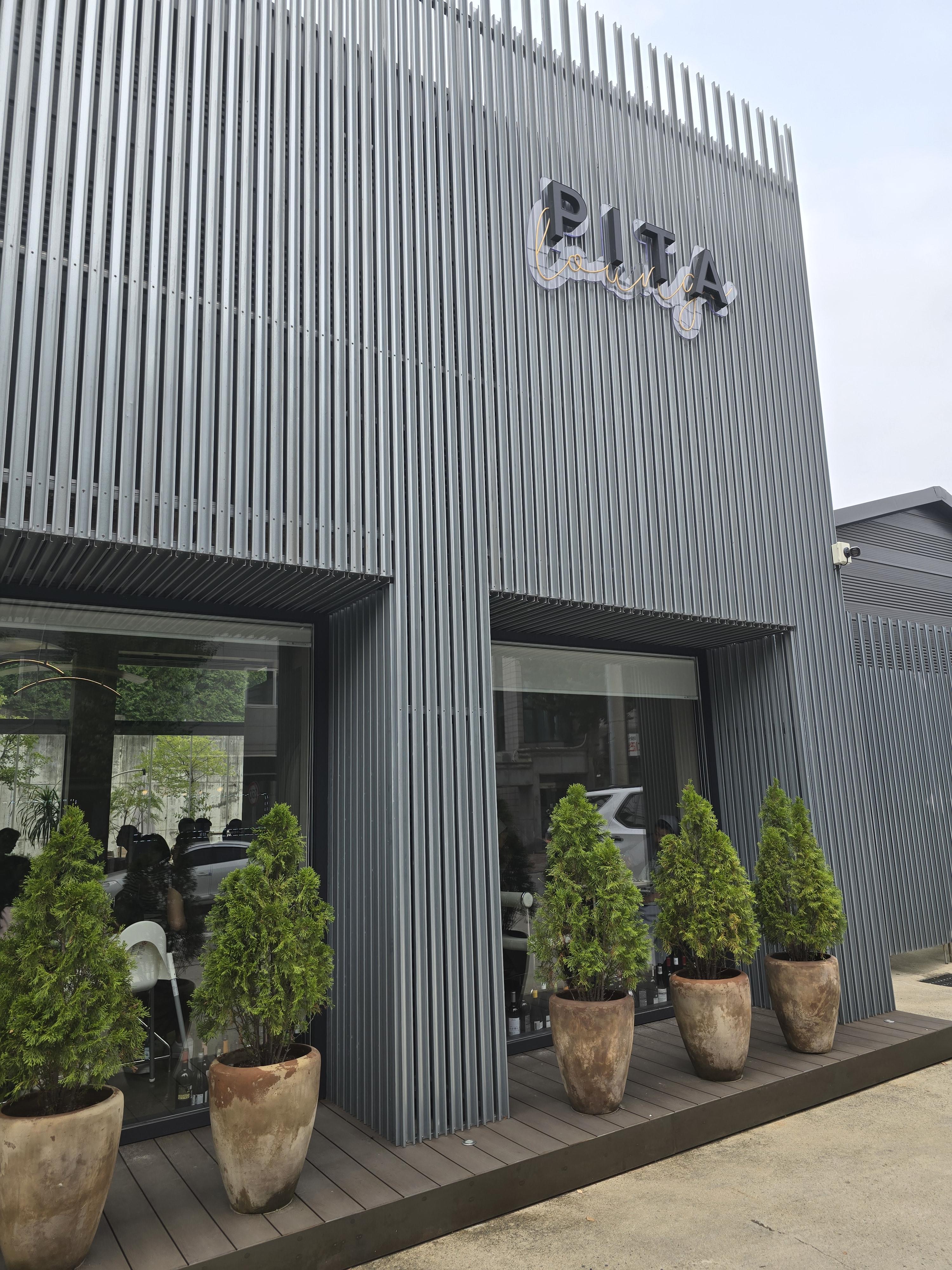피타라는 식당명이 건물의 오른쪽 위에 쓰여 있고 1층 통창을 가리는 화분들이 앞에 놓여 있어요