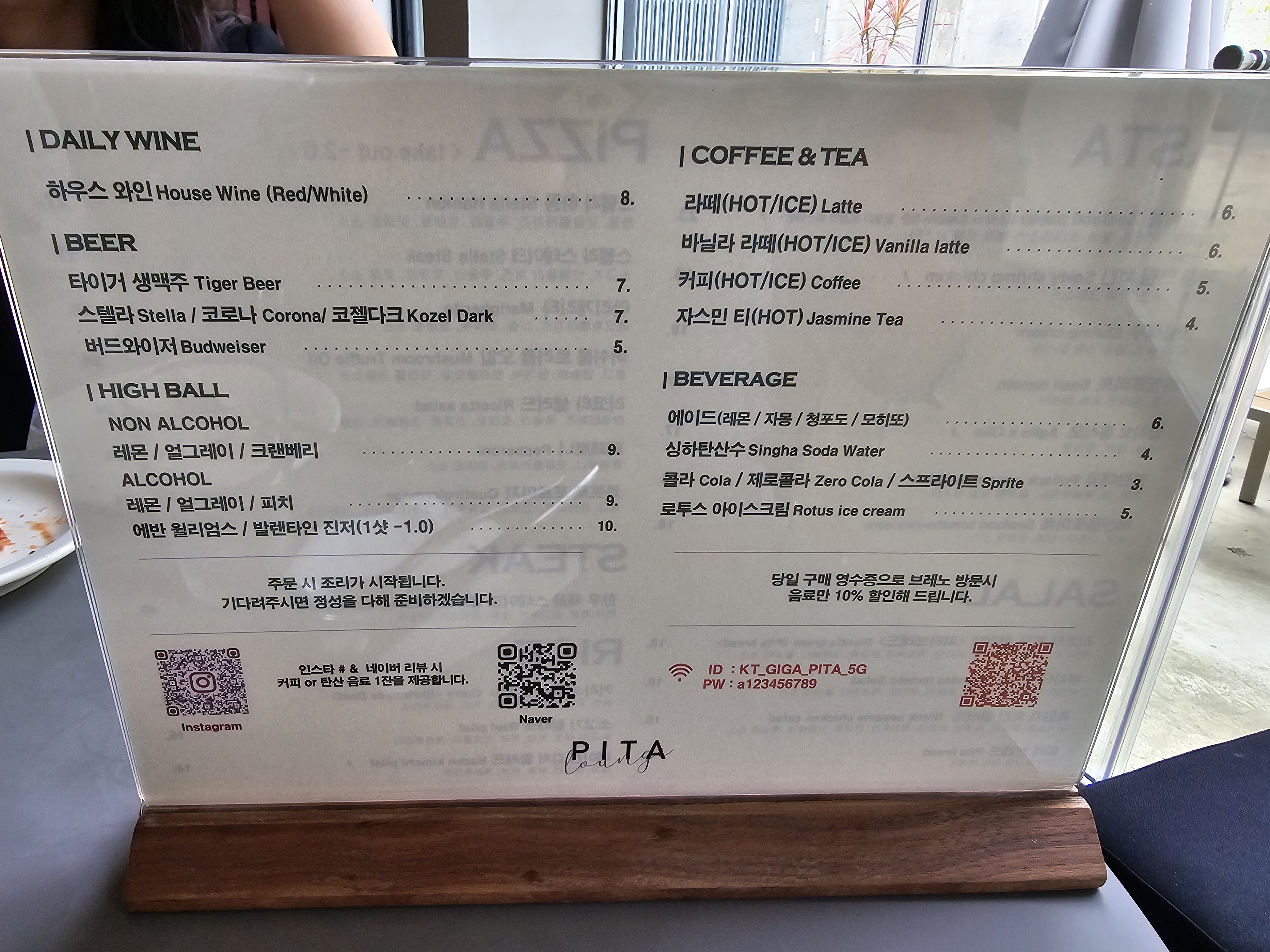 메뉴판은 테이블에 올려져 있는데 피자, 파스타, 스테이크, 샐러드, 라이스가 준비되어 있고요
