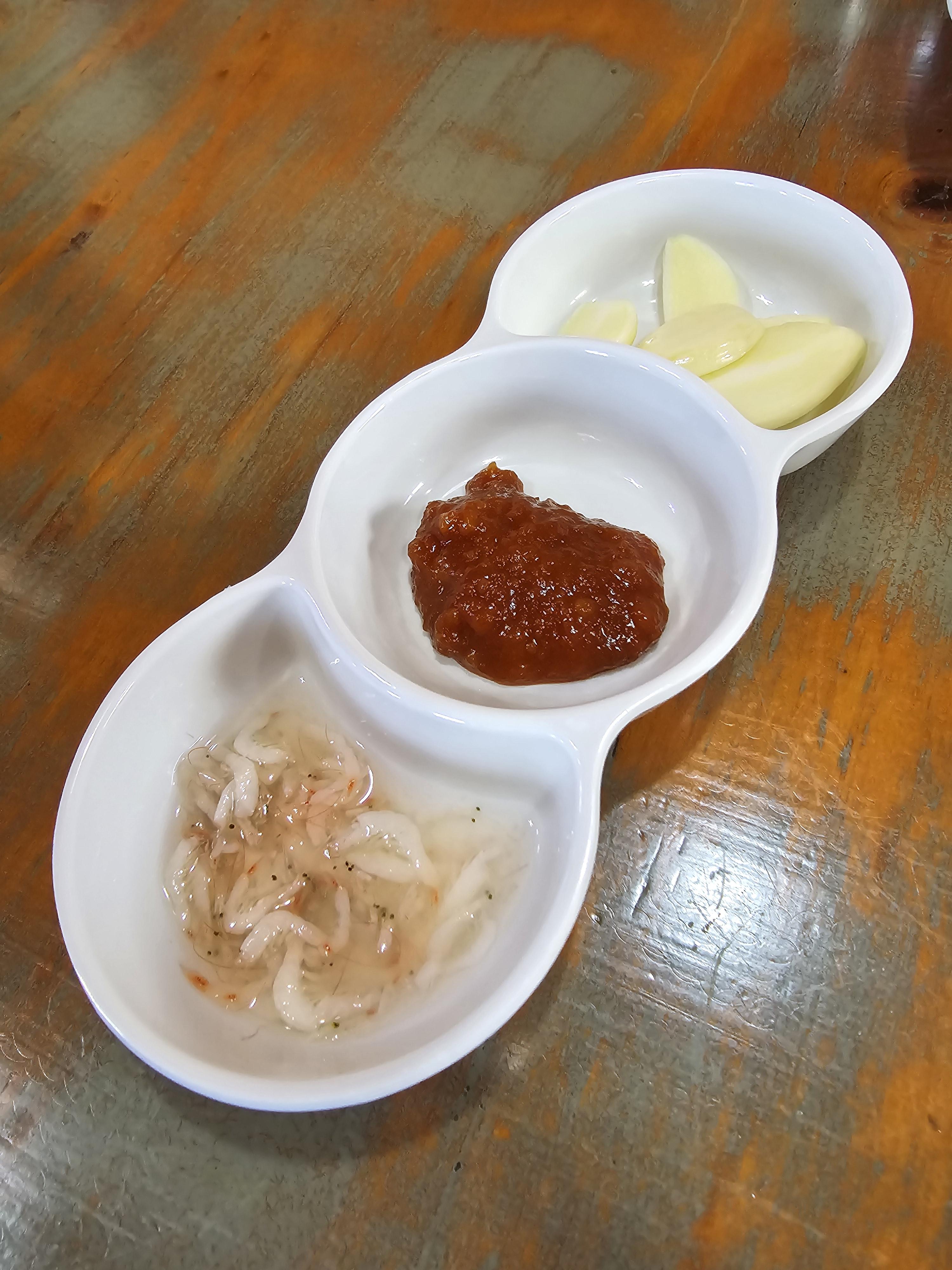 이건 보쌈을 찍어먹을 새우젓과 쌈장, 그리고 마늘이에요