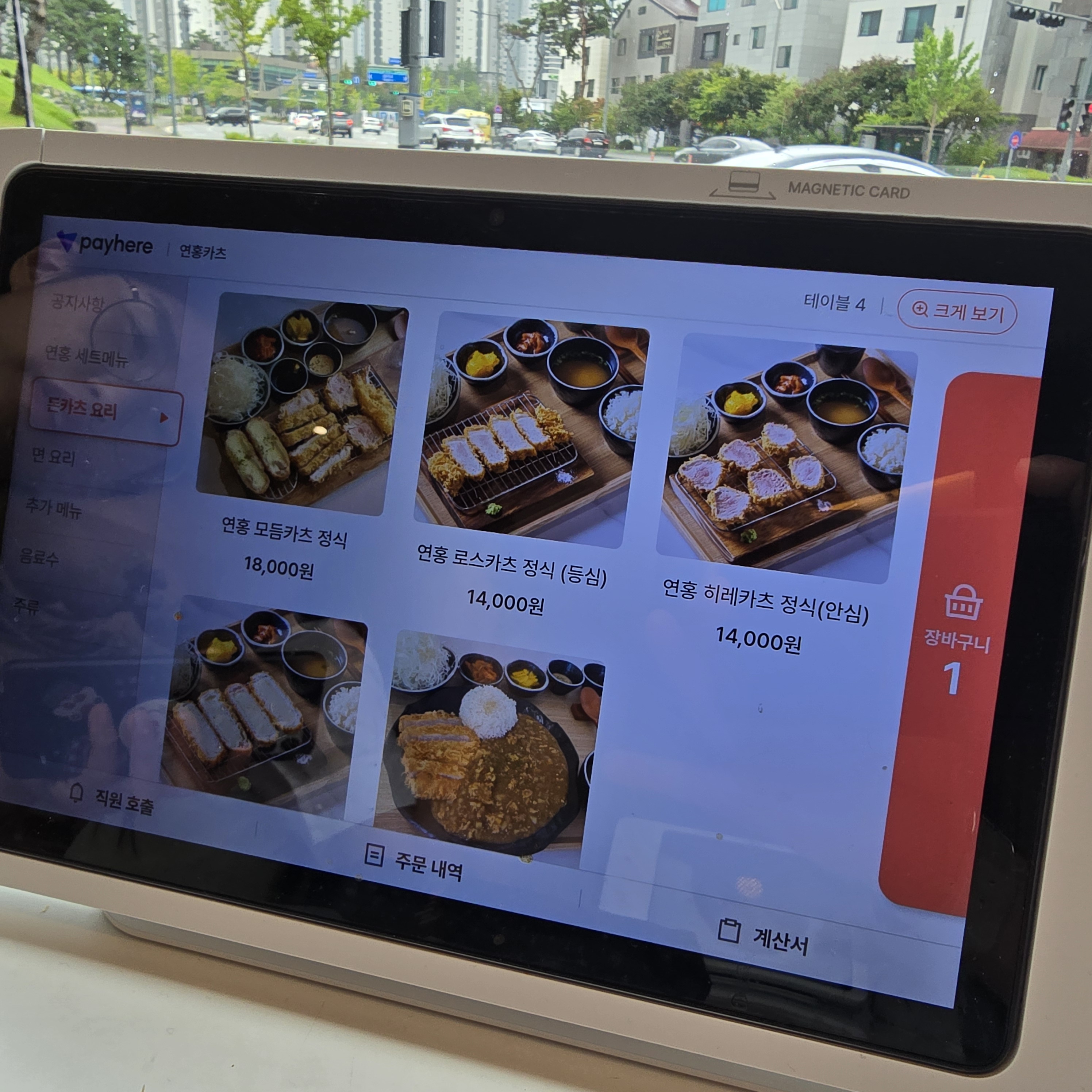 코너에 있는 식당의 구조상 테이블들은 코너를 따라 있어요 요즘 대세인 키오스크도 테이블 마다 있고요