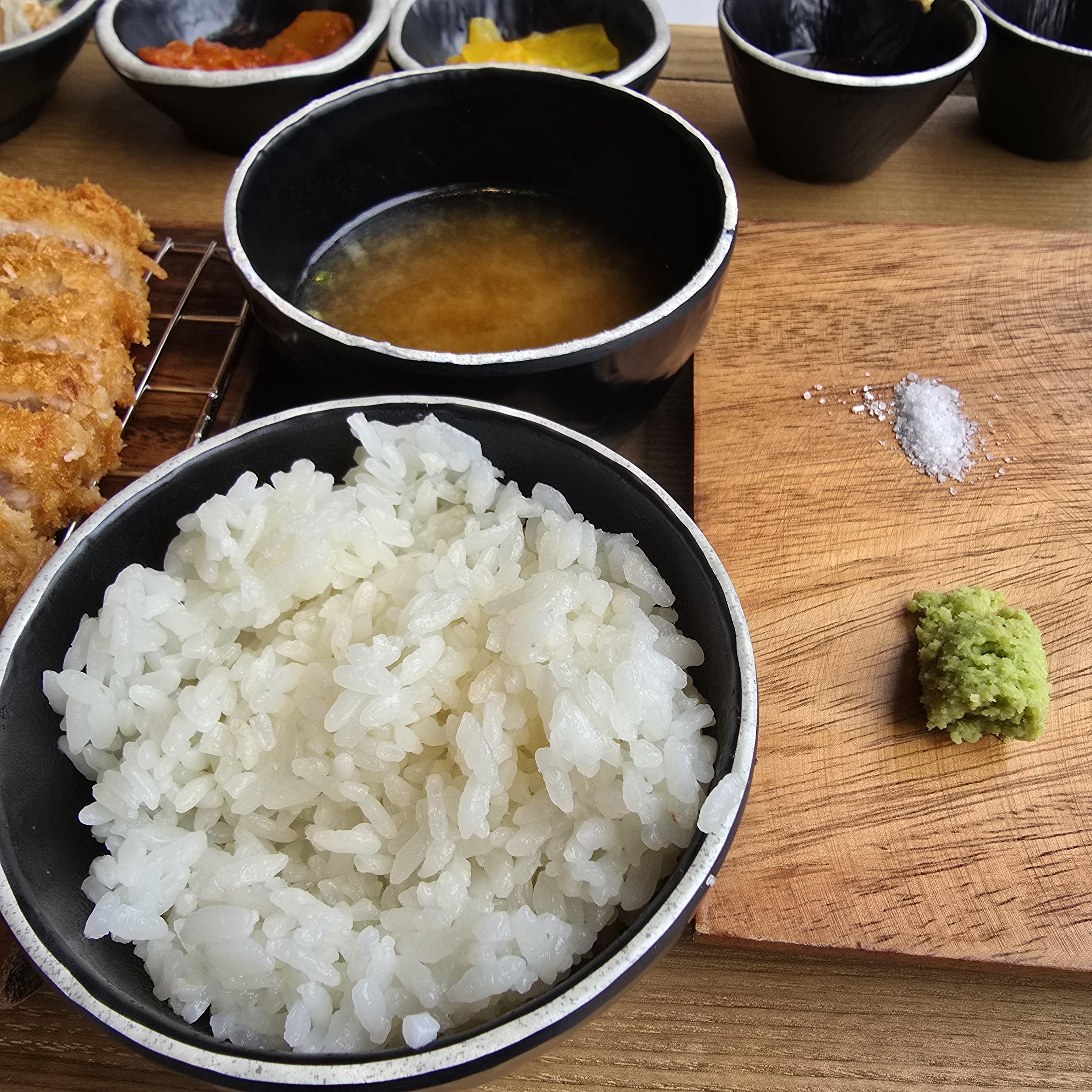 이건 제가 주문한 로스카츠 정식이예요 양이 꽤 많아서 놀랐고 소스 2종류와 소금 그리고 와사비가 같이 나와요