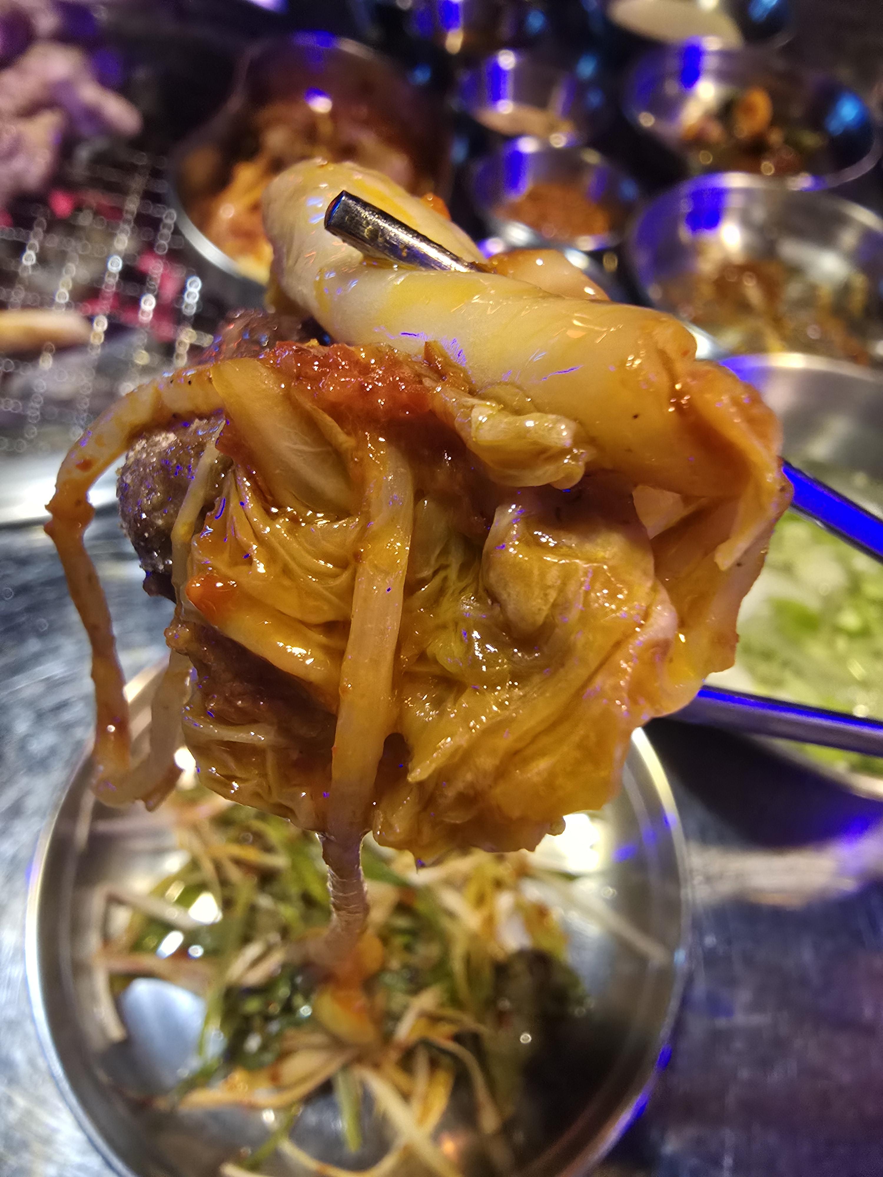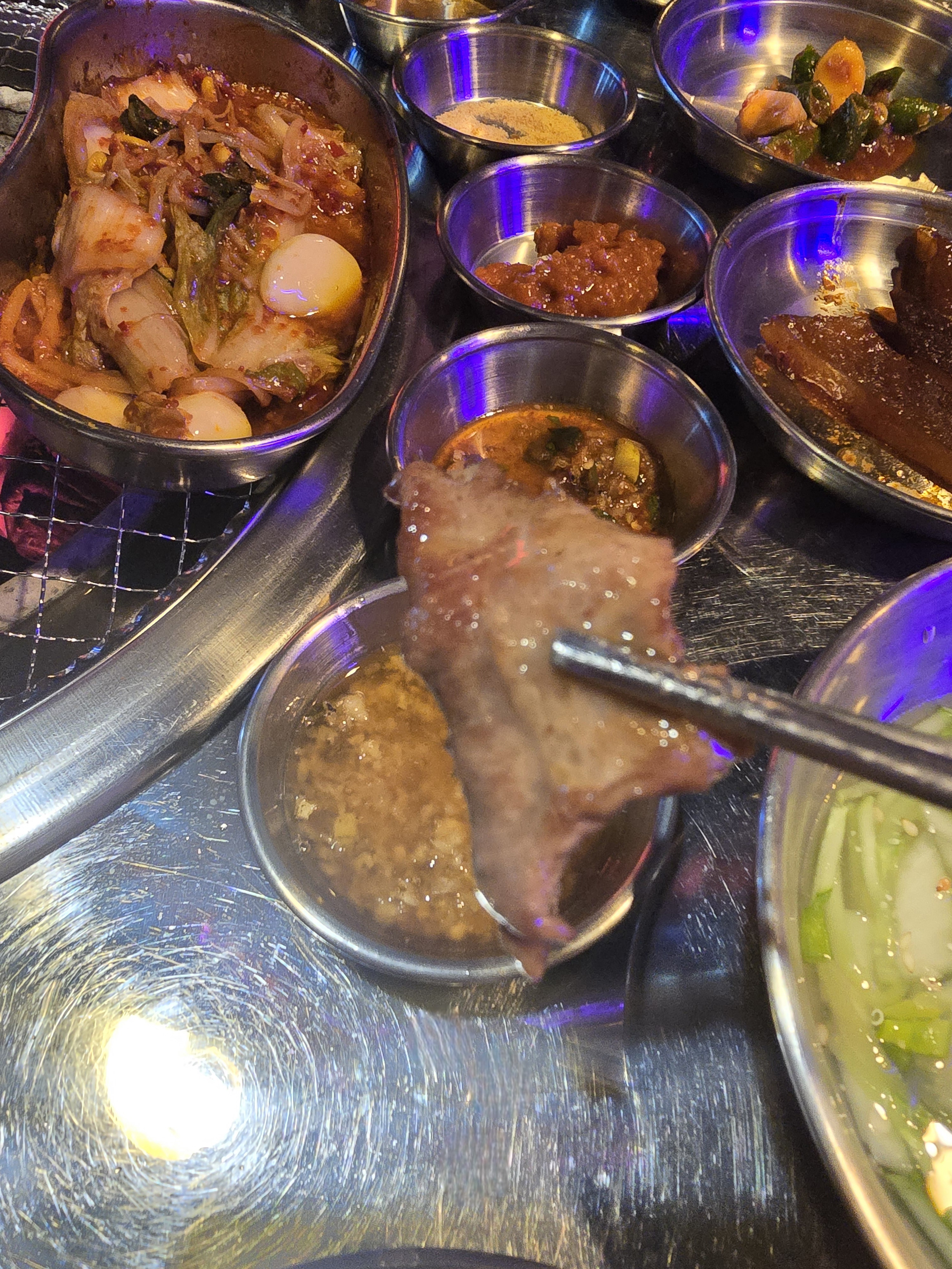 그 다음으로는 5개의 양념장 중 사장님 추천 양념장인 기름장에 찍어 먹어보았는데 고소한 풍미에 놀랐어요