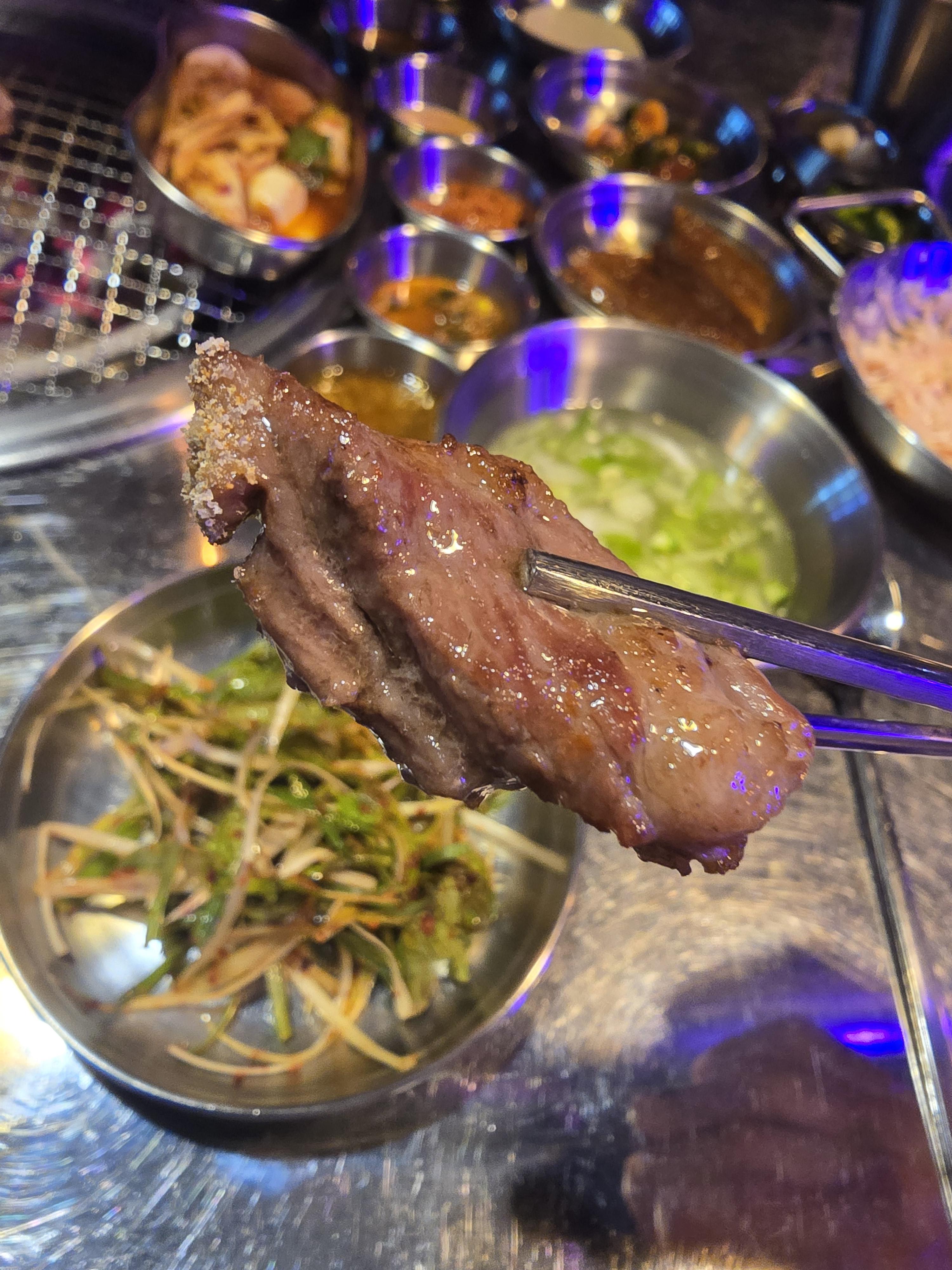 처음으로 먹어본 부위는 갈매기살이었는데 가장 기본인 소금에 콕 찍어서 먹어보았더니 육즙과 쫄깃함이 기가 막히더라고요