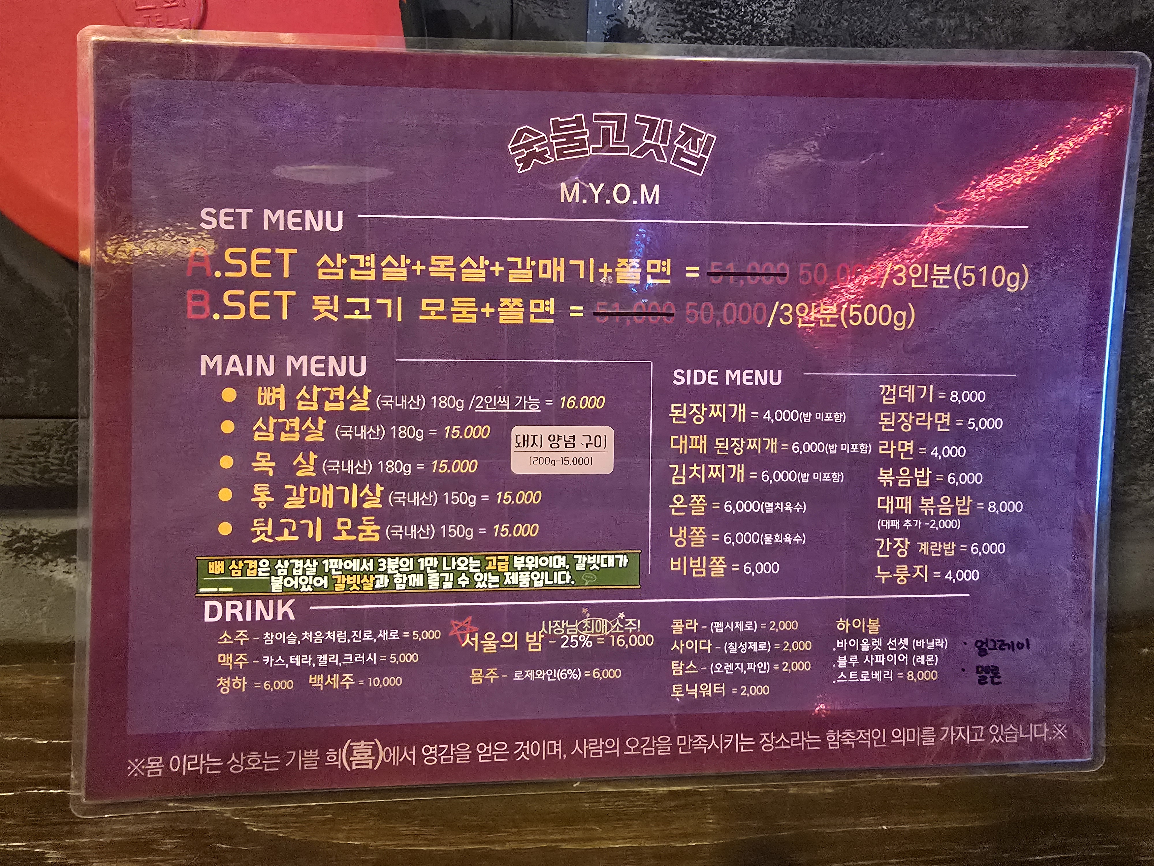 메뉴판은 각자 테이블에 코팅된 메뉴판이 있고 입구쪽 벽면에도 붙어 있어요
