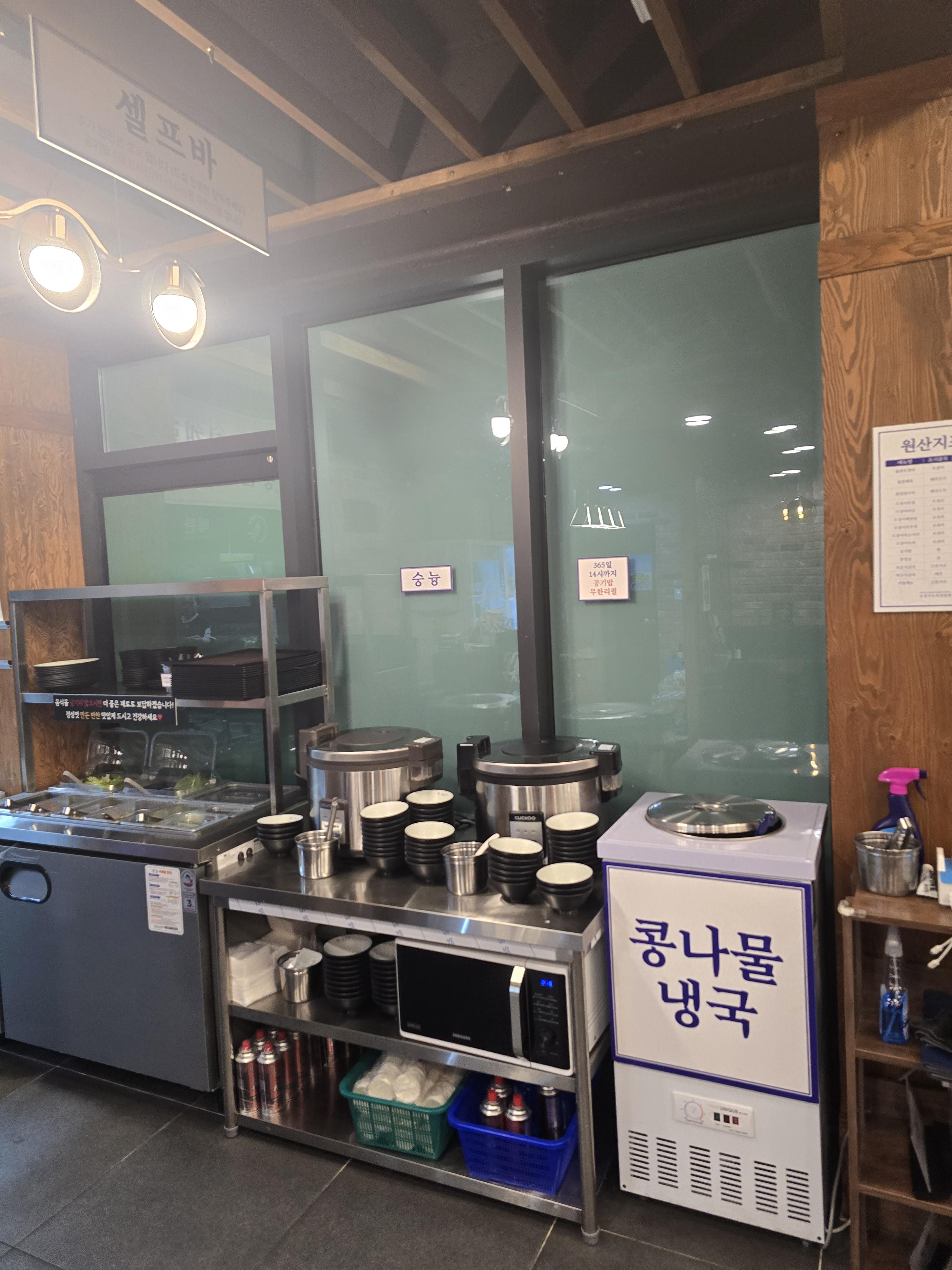 셀프바에서는 각종 밑반찬과 콩나물냉국, 숭늉 등을 가져다가 드시면 되요 저희의 선택은 콩나물 냉국😁