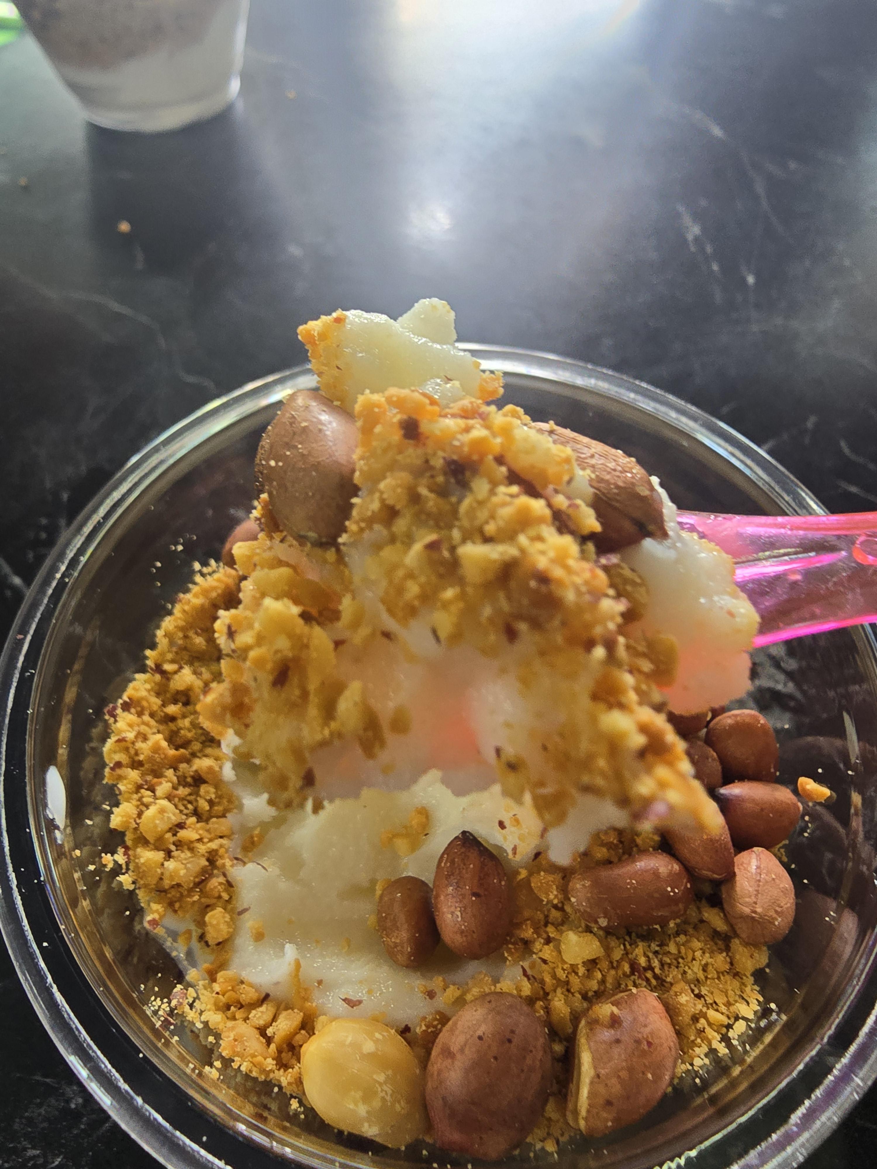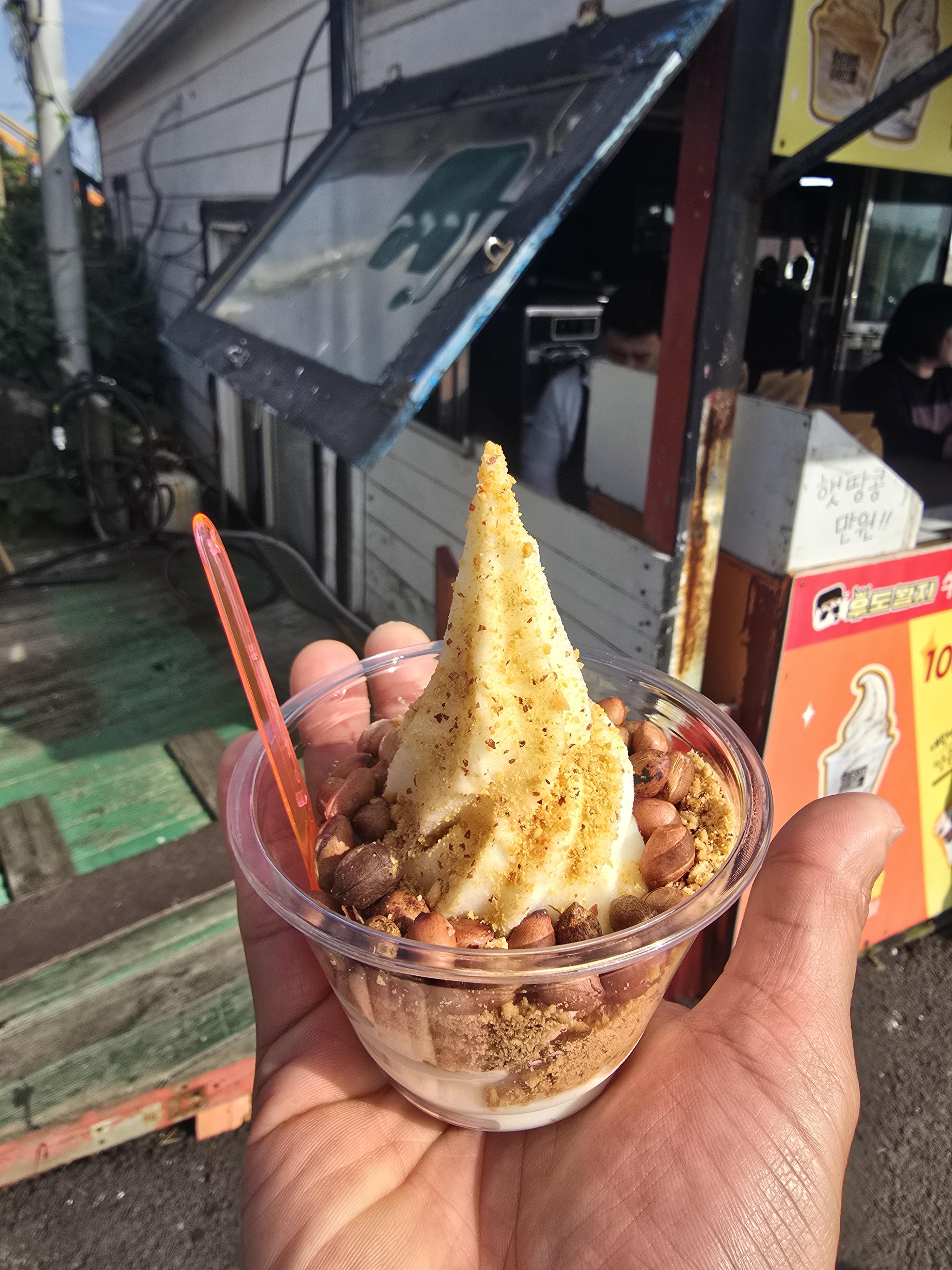 원조 땅콩아이스크림이에요 소프트아이스크림에 땅콩 가루와 우도땅콩이 토핑으로 올라온 아이스크림이네요
