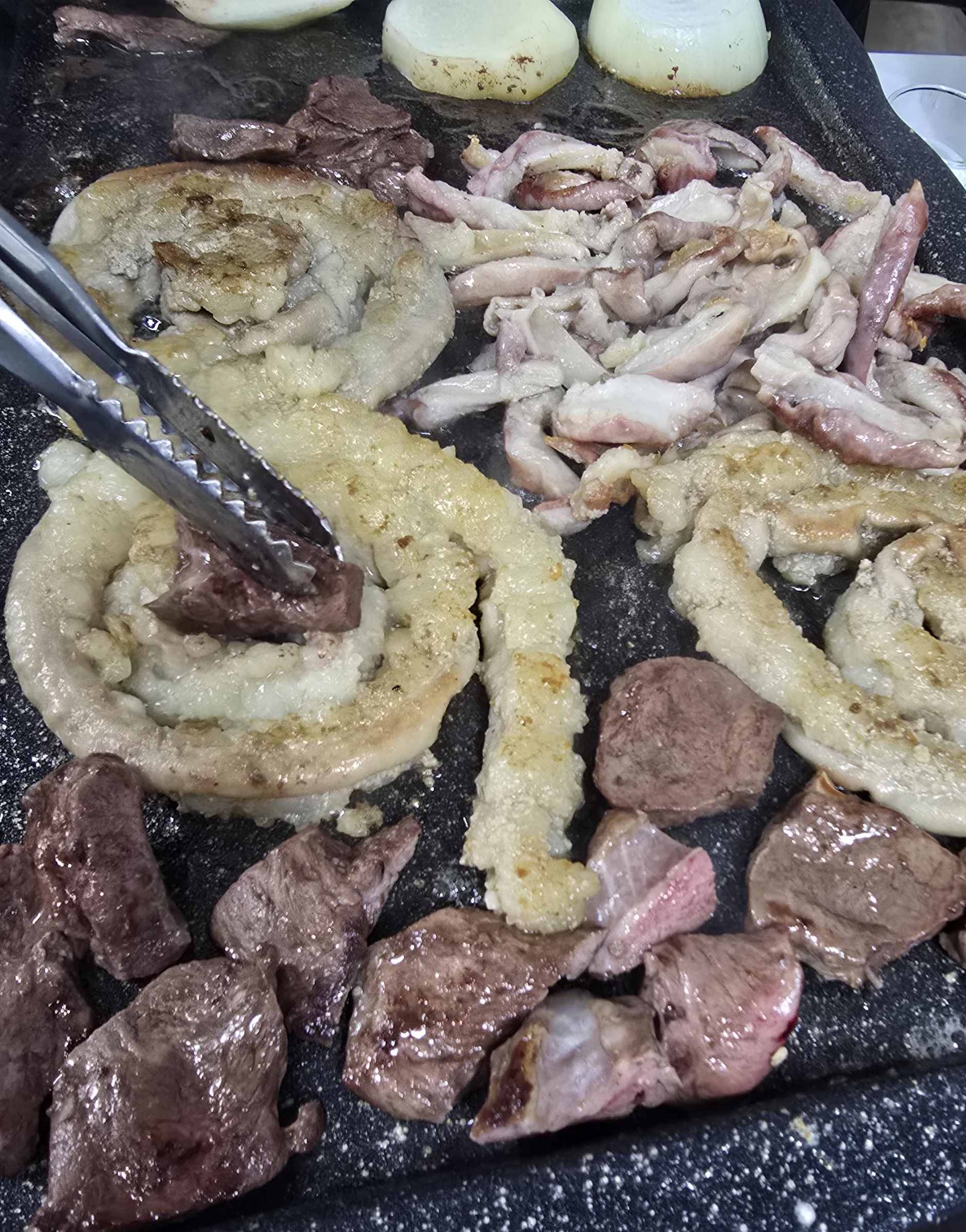 돌판 위의 곱창과 막창, 염통은 노릇노릇하게 구워줘야겠죠?