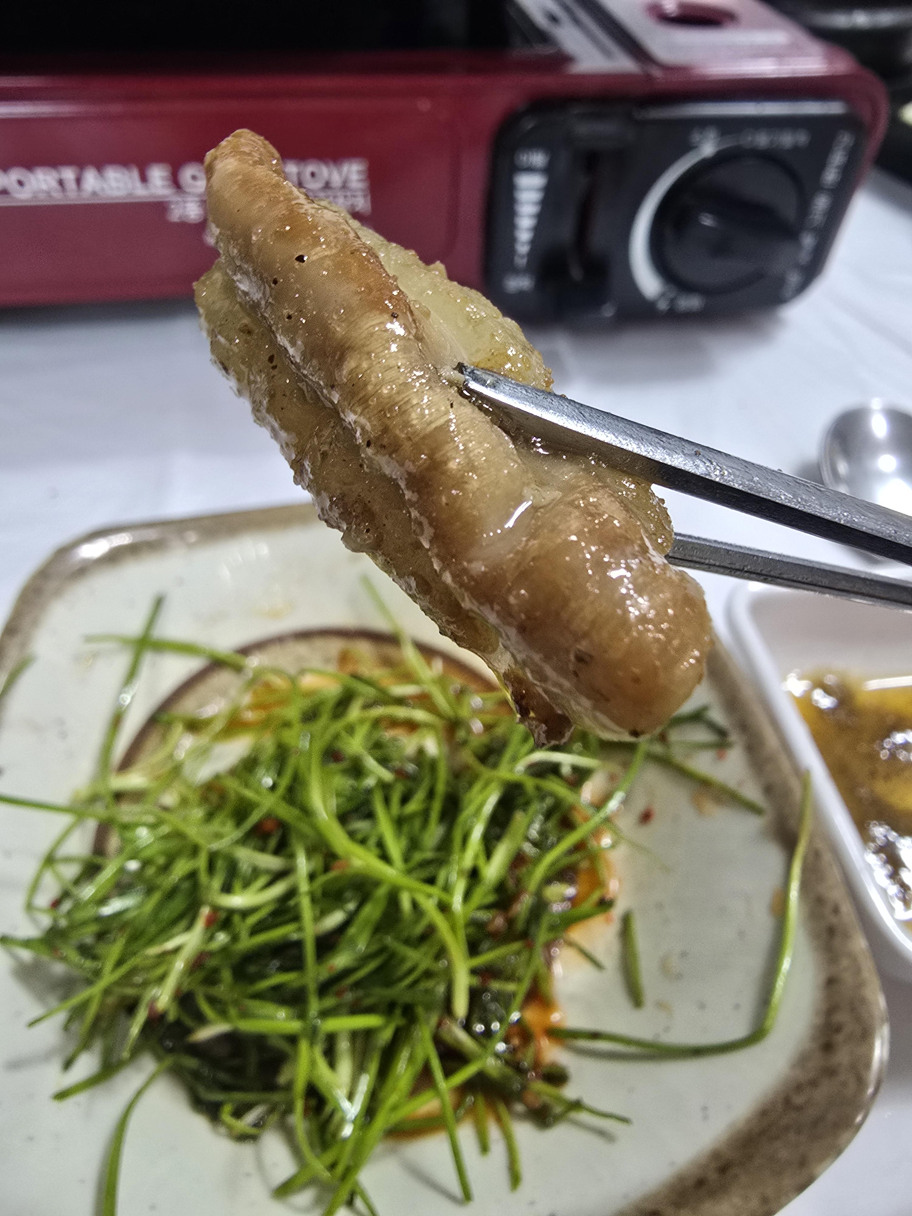 염통을 먹고 있다 보니 곱창이 노릇노릇하게 익었더라고요 곱창도 부추무침과 함께 먹었는데 곱도 실하고 맛있었어요