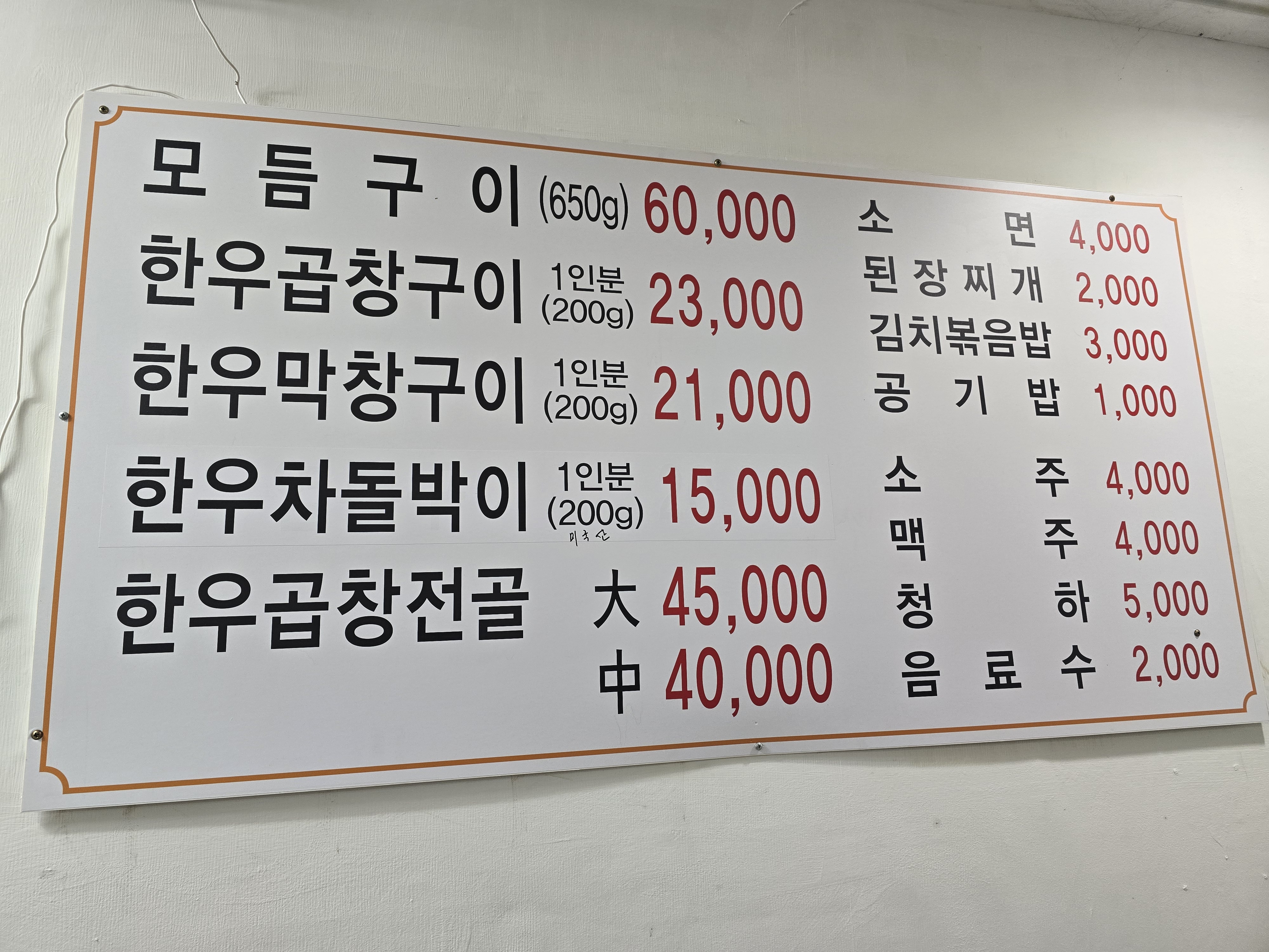 메뉴판은 벽면에 크게 붙어 있는데 곱창, 막창, 염통을 모두 맛볼 수 있는 모둠구이와 곱창구이 막창구이 등이 있어요 저희는 고민을 하다가 모둠구이를 주문했어요😆
