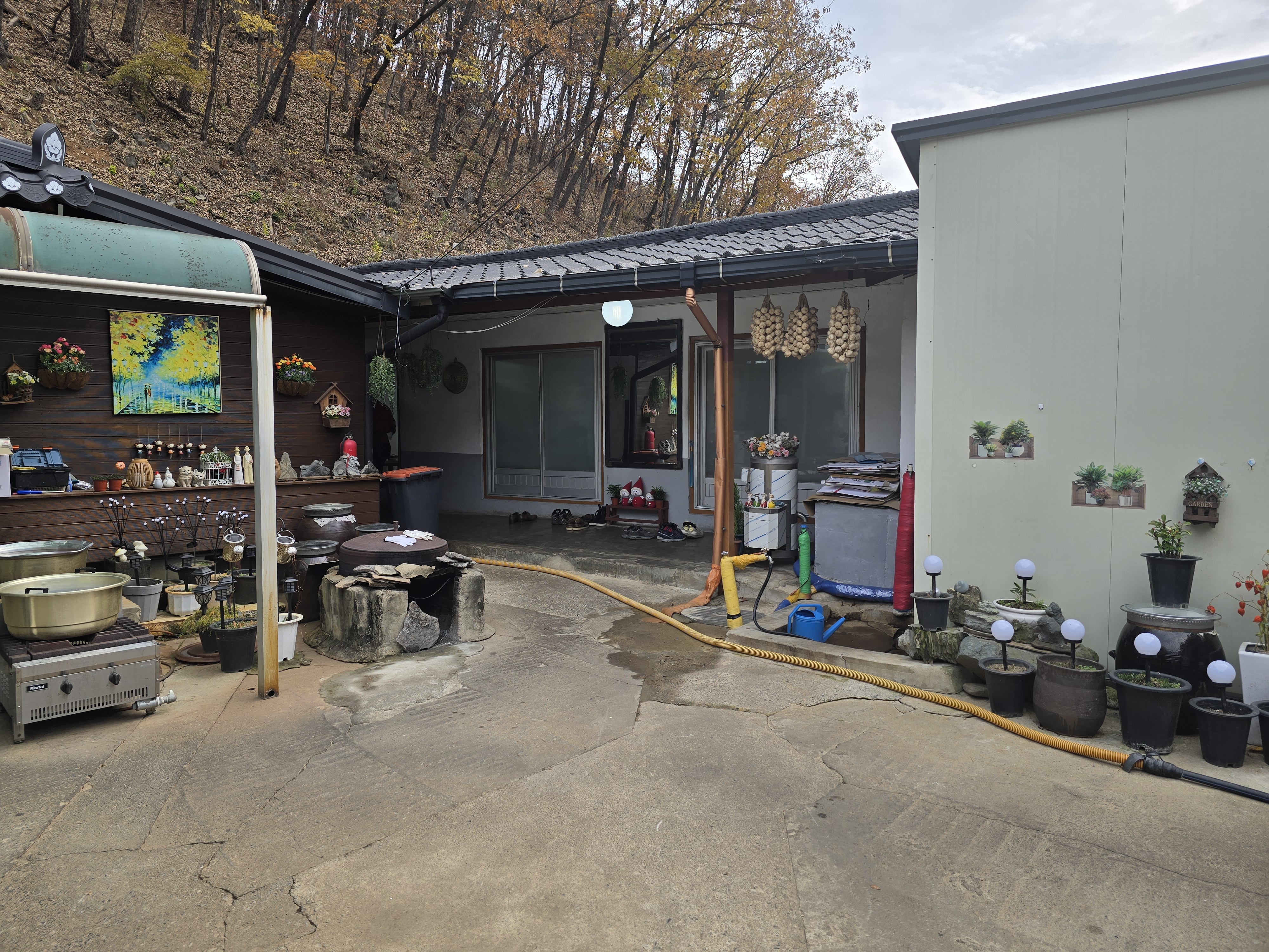식당에 들어가는 마당이에요 옛날 집에 들어간 느낌이죠? 가운데 마당이 펼쳐져 있고 마당을 둘러싸고 건물이 있어요 주방도 보이고 신발을 벗고 들어가는 방들이 나란히 있는 구조예요