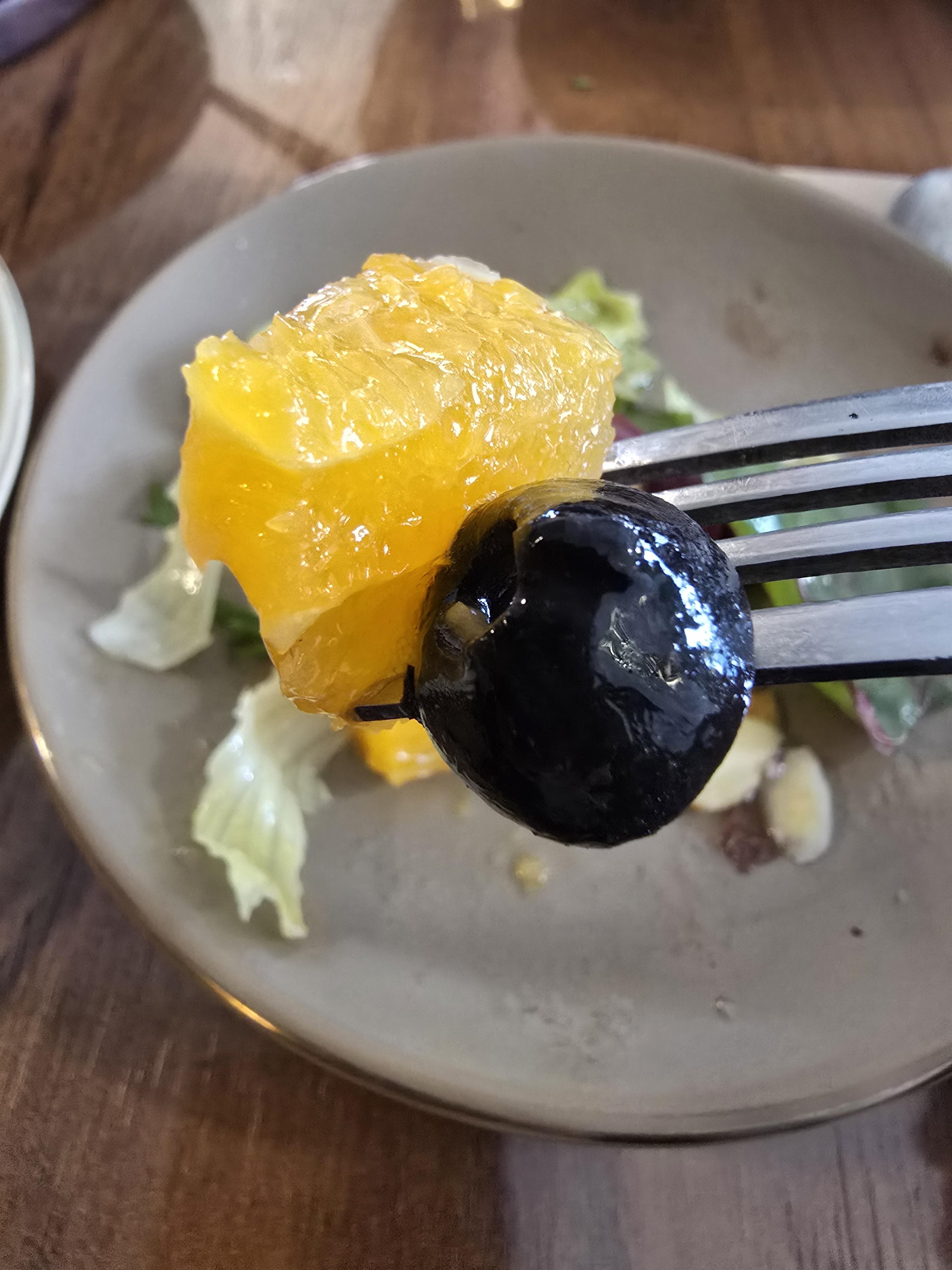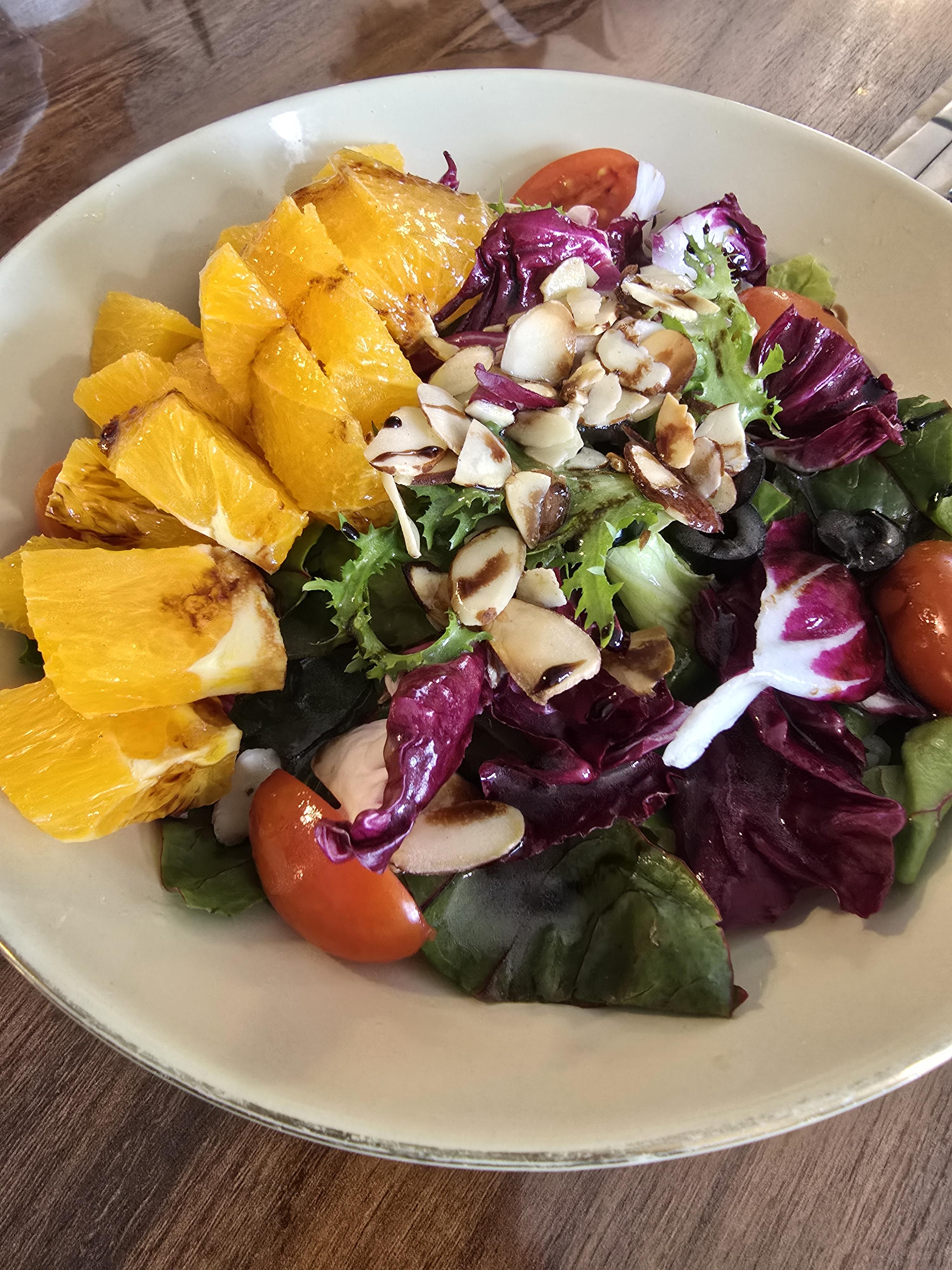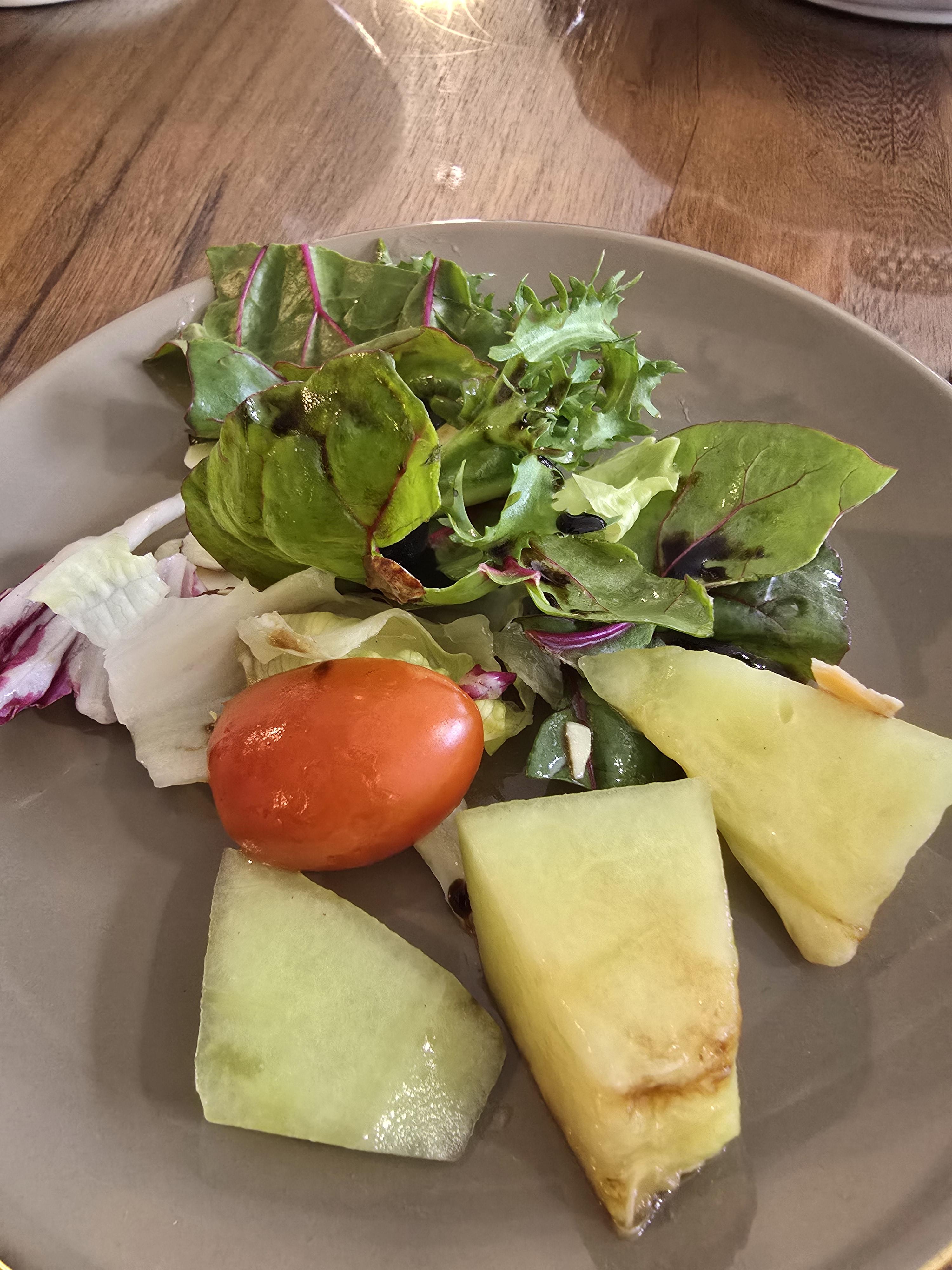 이건 오늘의 샐러드인데 2인에 하나씩 멜론이 들어간 샐러드가 나오고 오렌지가 들어간 샐러드는 나누어 먹었어요 샐러드 자체가 양도 많고 엄청 신선한 과일과 채소가 들어가 있는 데 샐러디에서 1인 1 샐러드를 시킨듯한 느낌이었어요