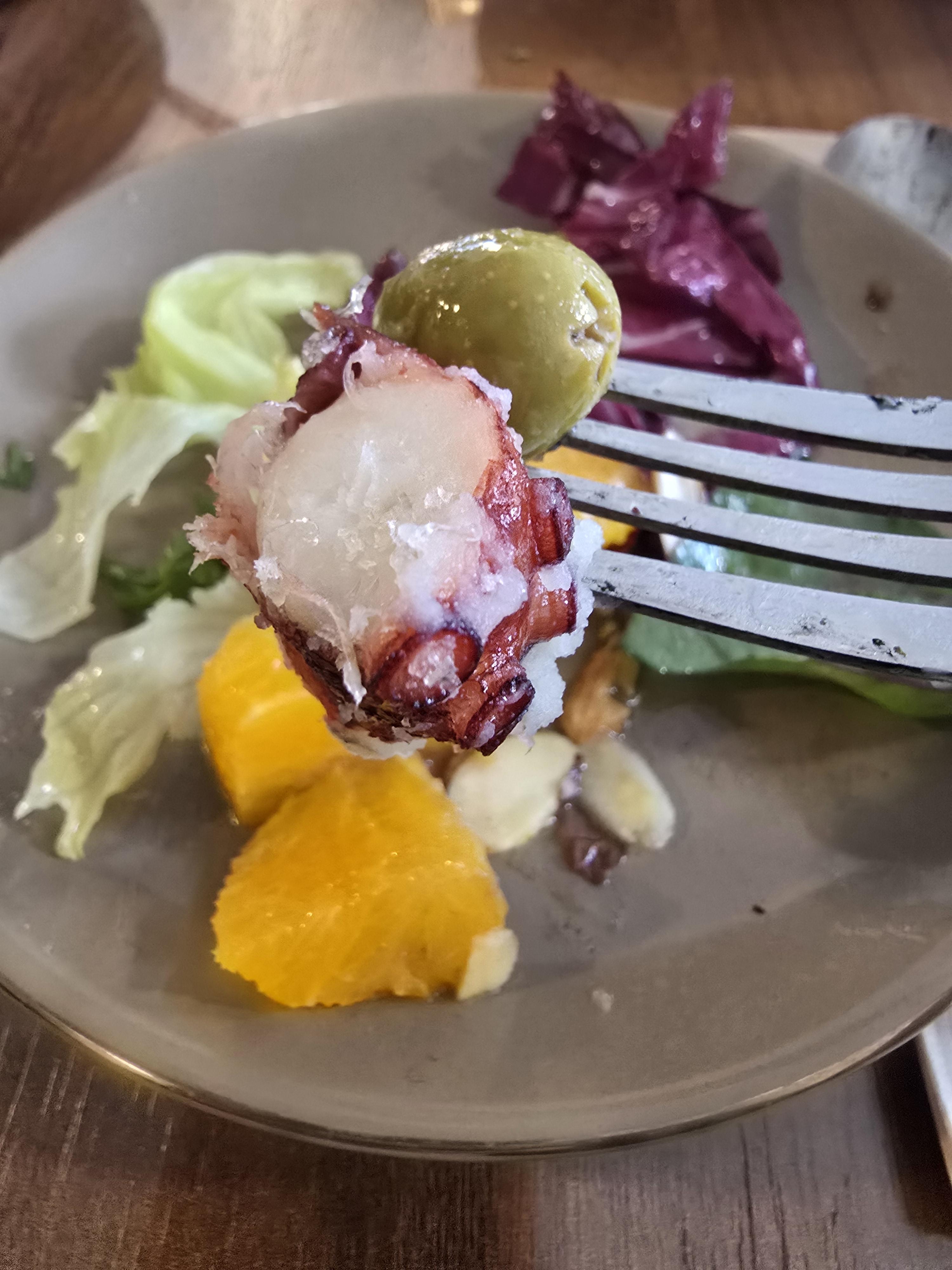 이건 추가로 주문한 문어오븐구이예요 엘까미노에서 가장 유명한 음식이기도 한데 오븐에 구운 문어다리와 올리브, 매쉬감자를 함께 먹으면 된다고 설명해 주셨는데 사실 평소에 알고 있던 문어다리의 식감은 쫄깃을 넘어서 찔깃이었다고 생각하고 한입 먹는 순간 사르르 녹는 문어에 눈이 휘둥그레 떠지더라고요