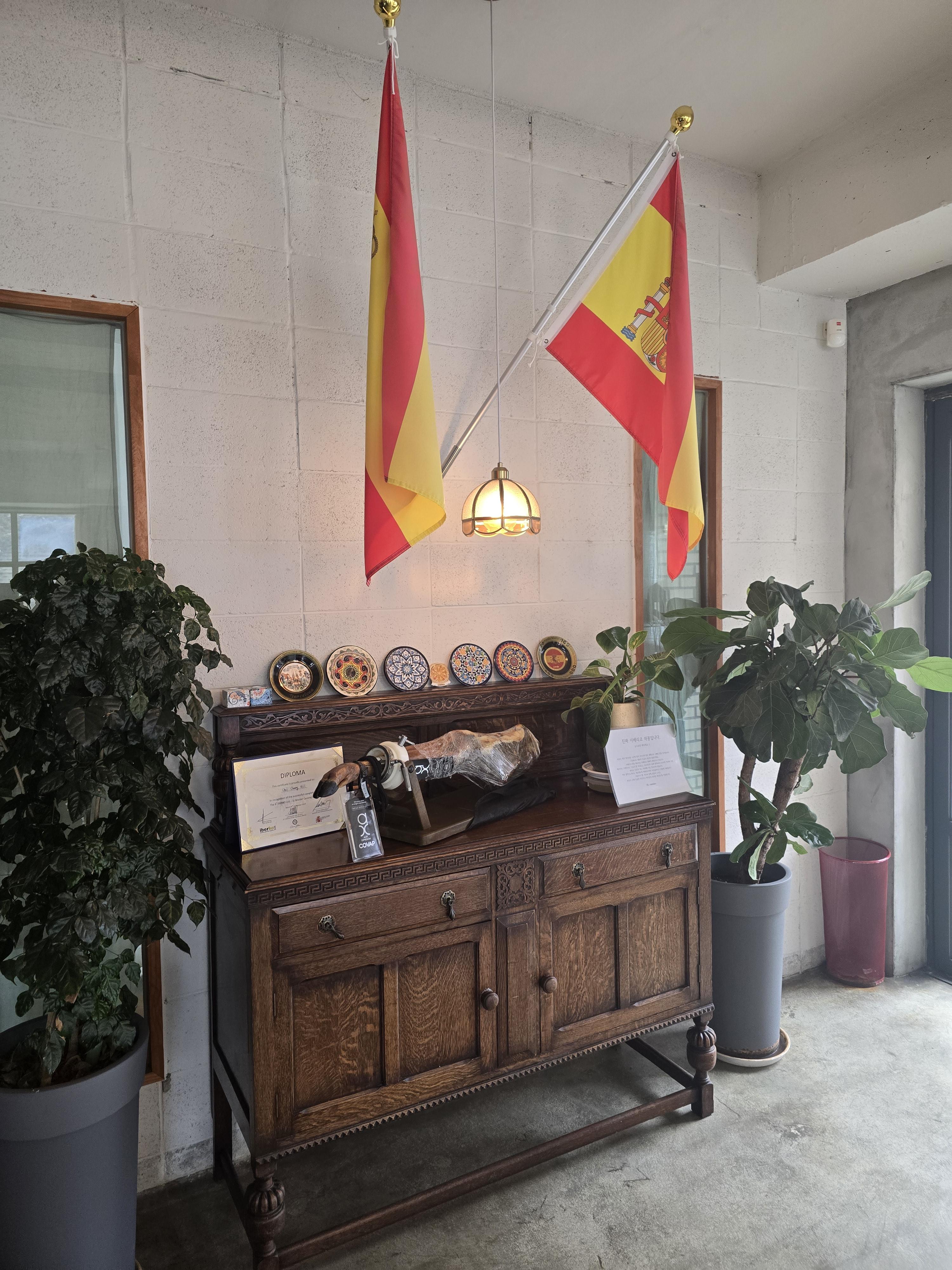 매장에 들어서자마자 오른편에는 스페인레스토랑답게 스페인 국기와 투우의 고장답게 소의 다리가 전시되어 있어요