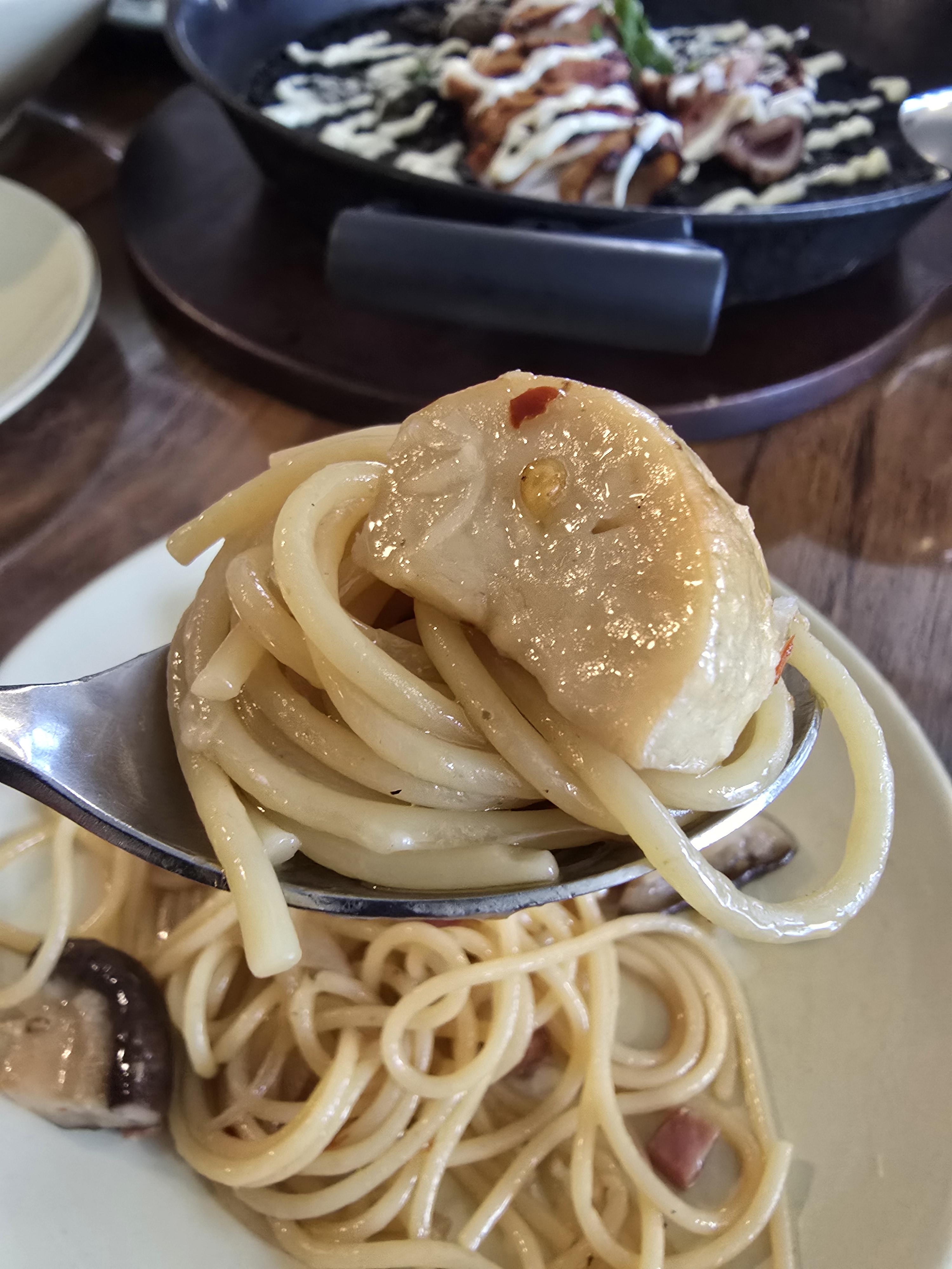 이건 하몽파스타예요 버섯과 치즈, 하몽이 너무 잘 조화로운 파스타였고요 살짝 매콤한 맛이 있는 데 너무 맛있었어요😋