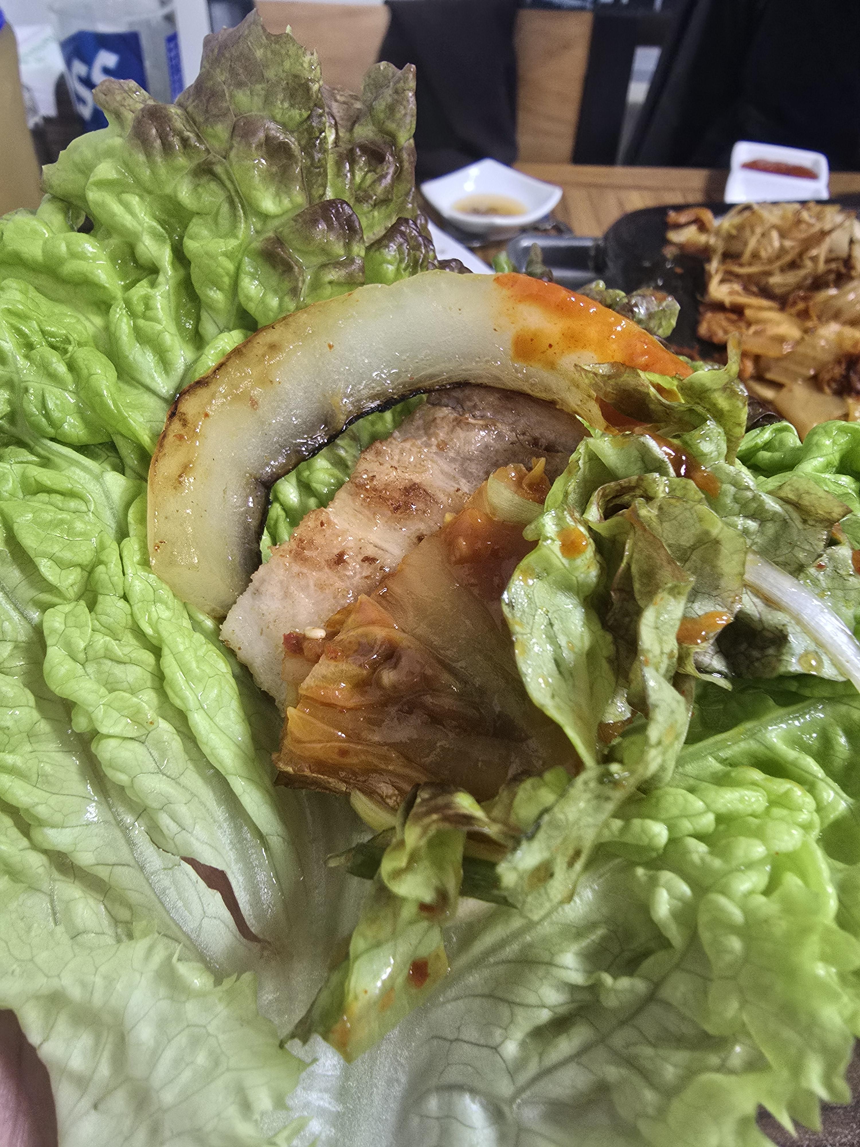 상추에다가 삼겹살 구운 양파 얹어서도 먹어주고요
