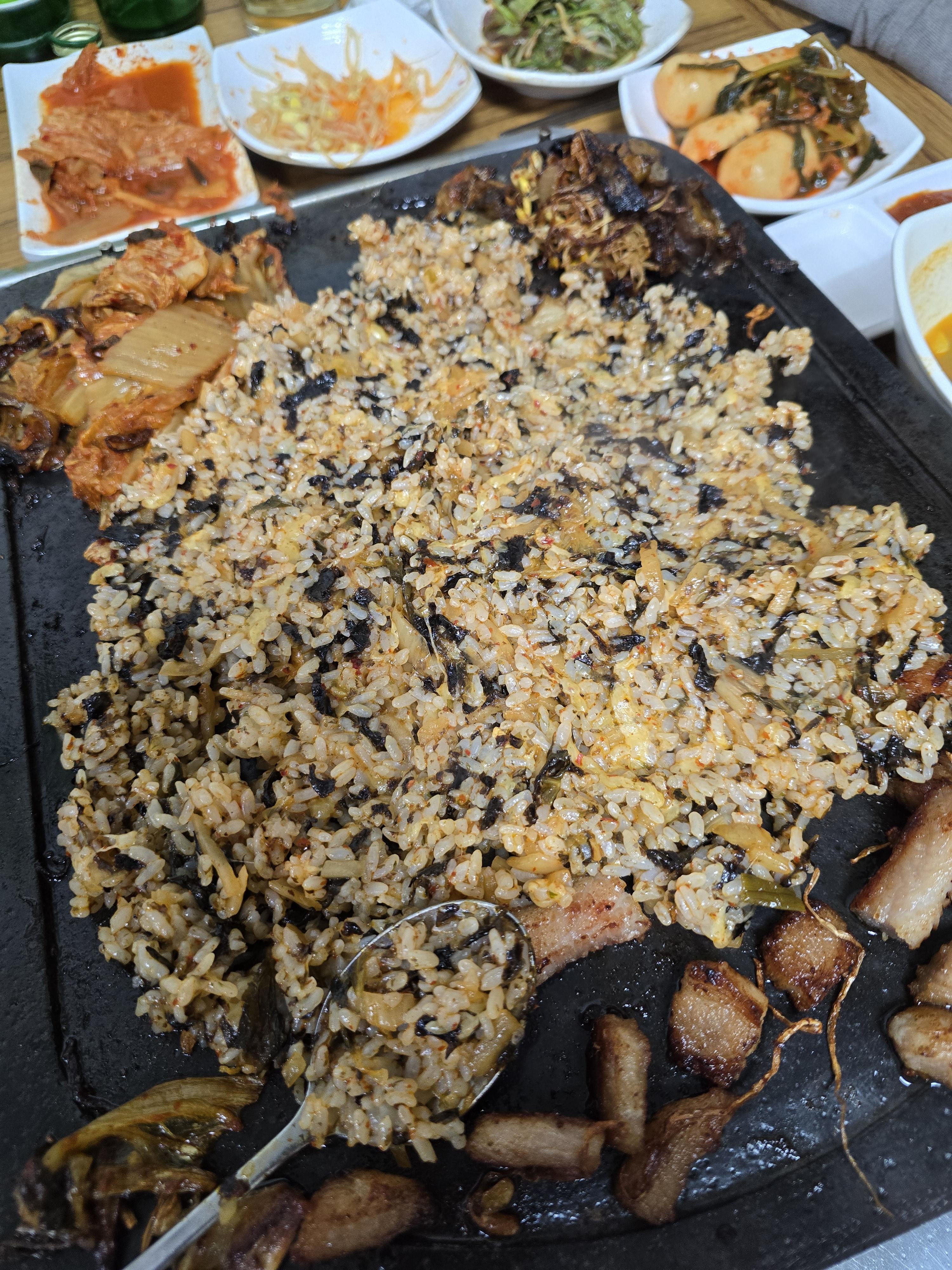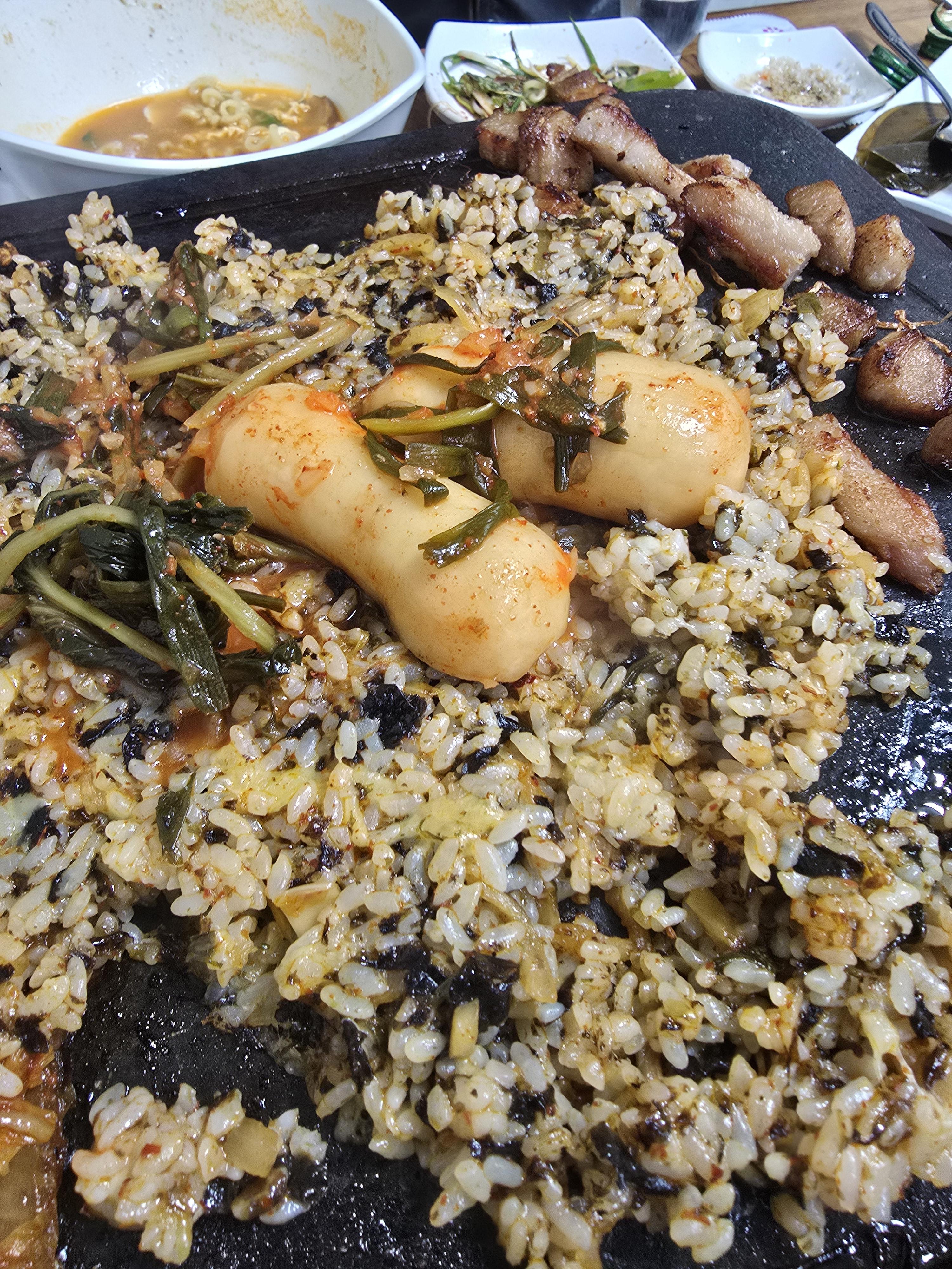 불판에다가 잘 볶은밥에다가 깍두기까지 올려서 같이 먹으면 이건 또 말해 뭐해요