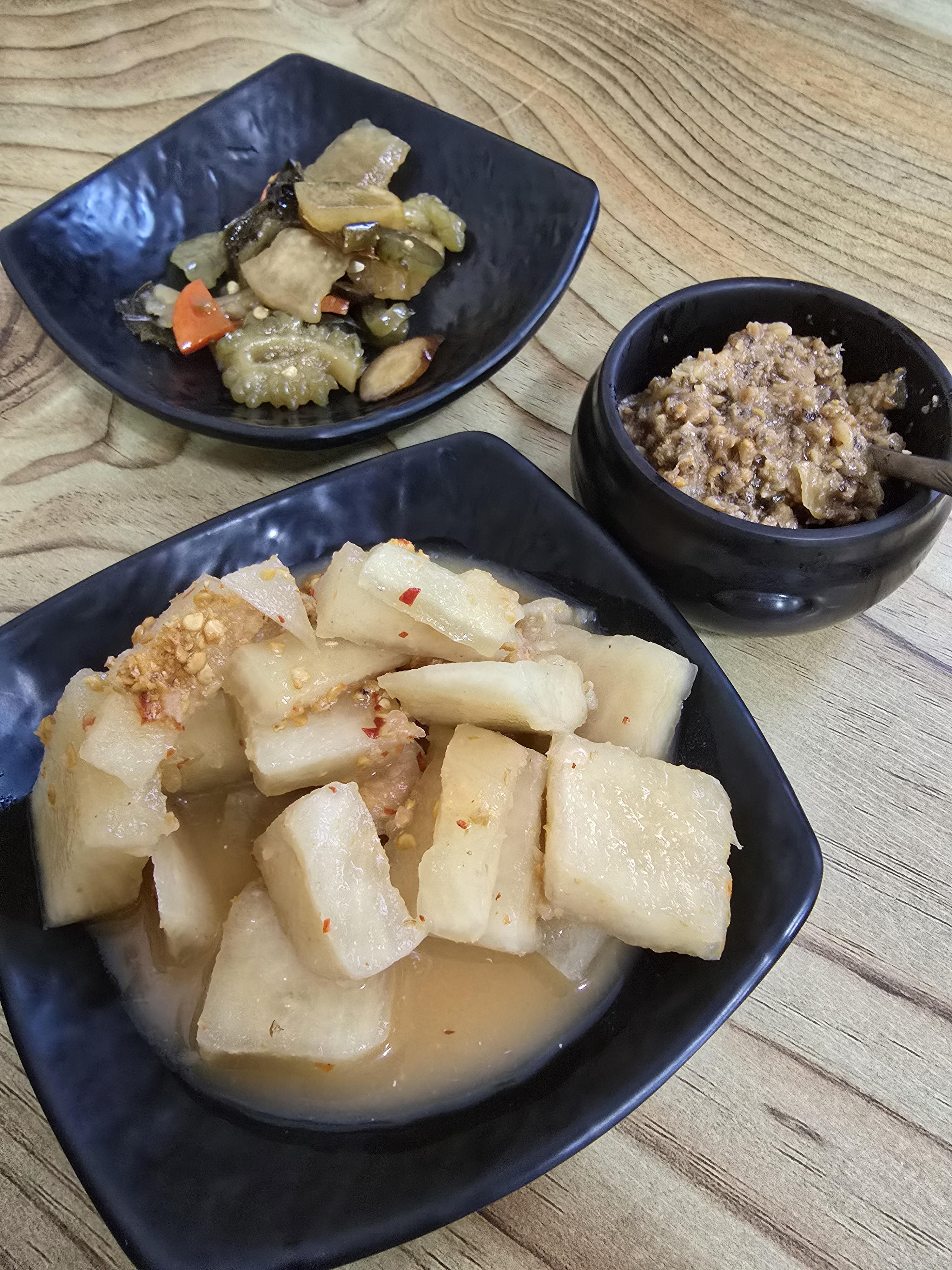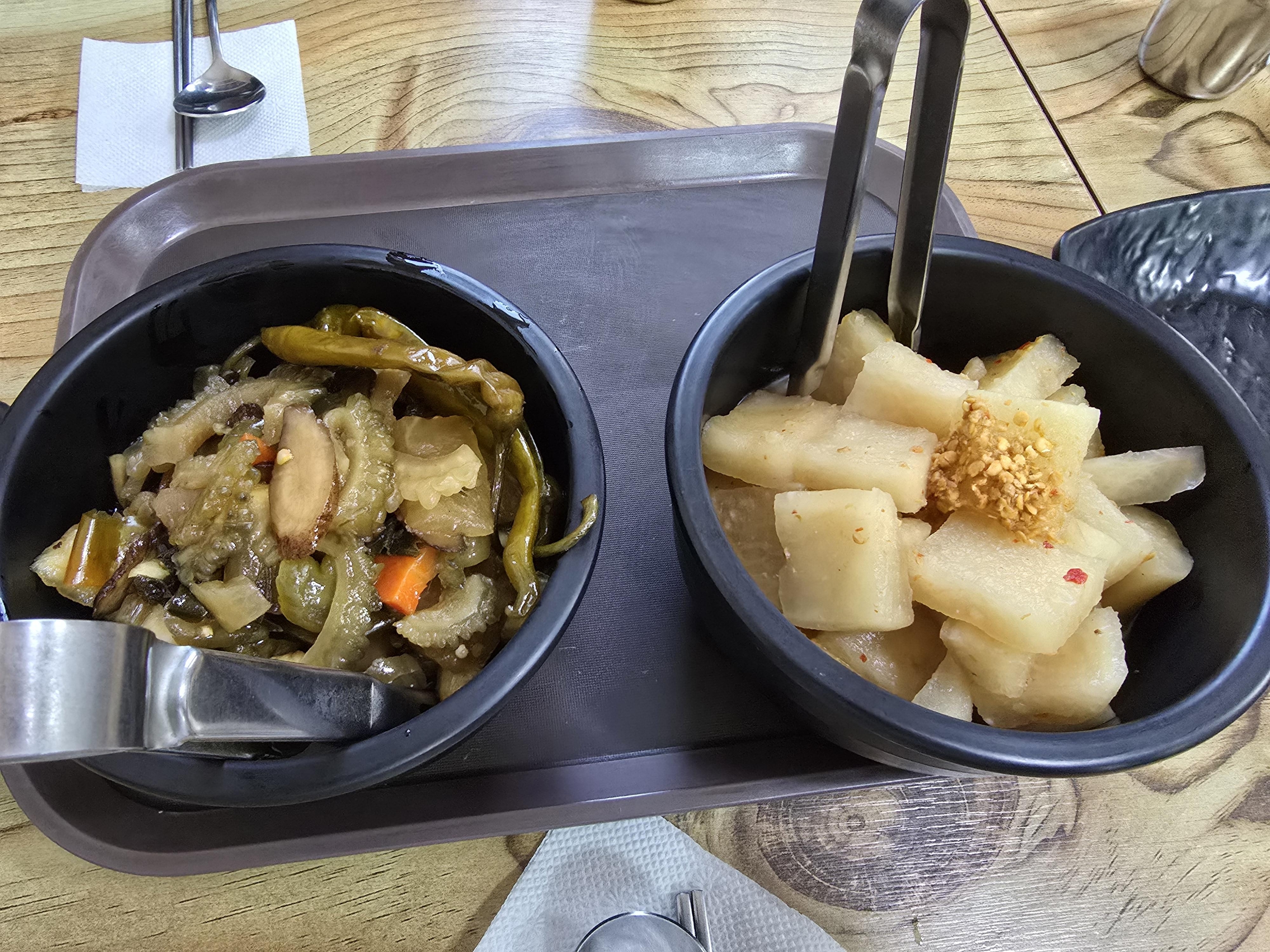 밥이 나오기 전에 나온 기본반찬이예요 섞박지와 장아찌, 강된장이 나오는 데 드실 만큼 덜어서 드시면 돼요