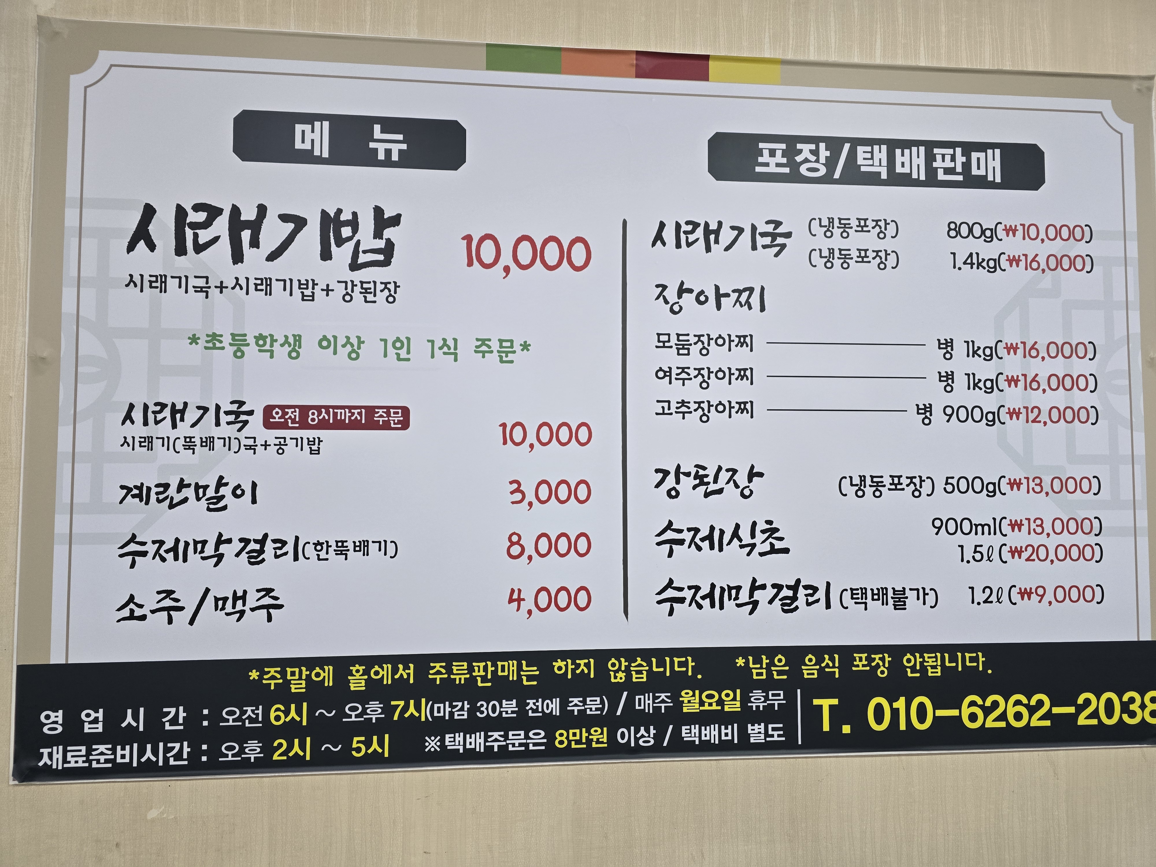 메뉴는 아주 단순해요 시래기밥과 시래기국, 계란말이가 주요 메뉴이고 포장/택배 메뉴도 메뉴판에 같이 적혀있어요