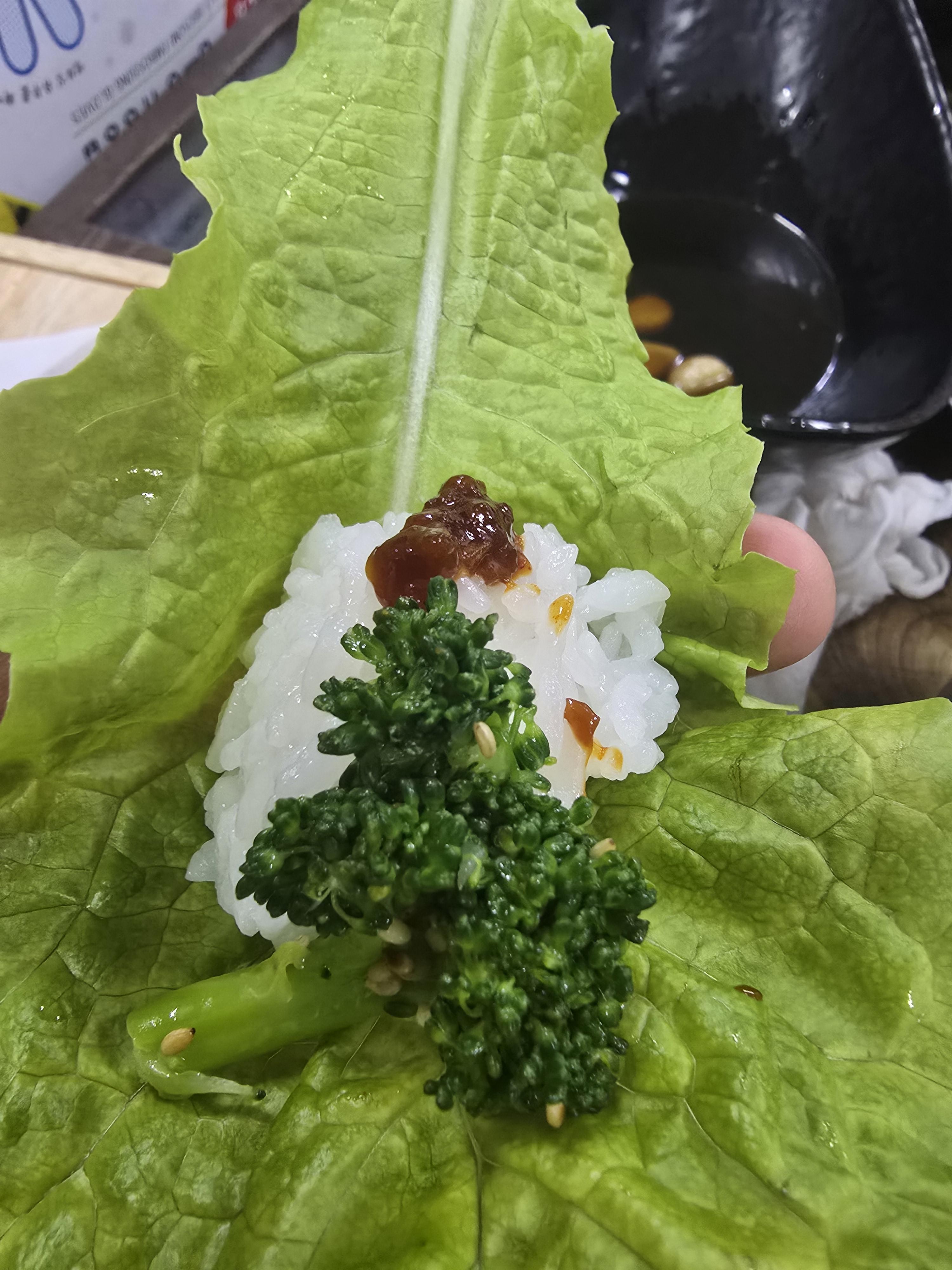 쌈도 주셨는 데 안 먹어보는 건 예의가 아니죠 쌈에다가 풍족하게 먹을 수 있는 밥도 올리고 브로콜리 너마저 올리면 끝😁